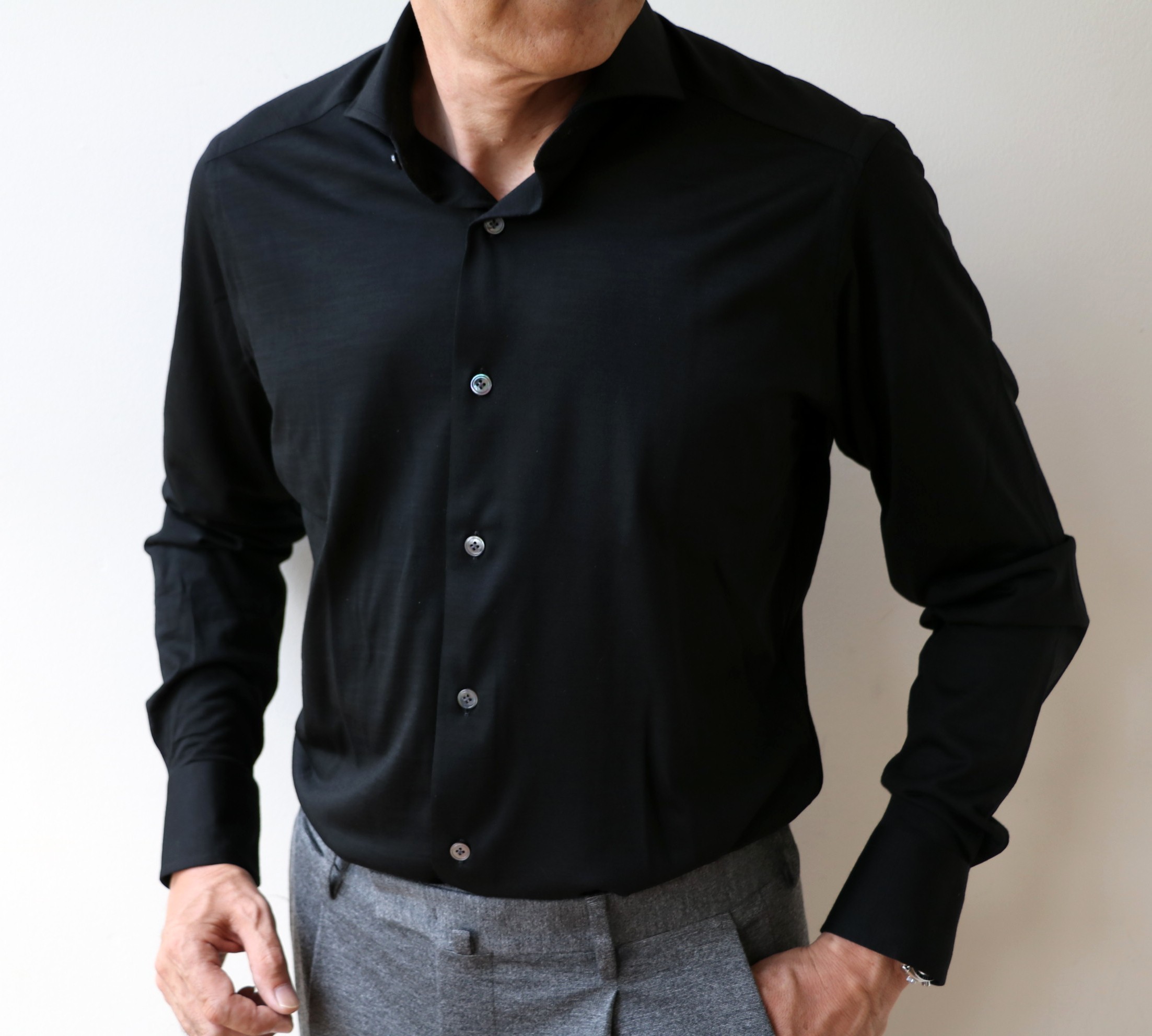 今季、ブラックのシャツを揃えるなら、伸縮性のあるウールジャージ。一見、ウールには見えない、細番手の糸を使ったシャツの着心地は、とろりと溶けてしまいそうな...です。ただ難点があるとすれば、家庭での洗濯が不可なこと。ただ、季節が進んでいるのは、汗をかかない秋冬。この着心地を体感してしまったら、そんなの関係ない(ちょい、古い!)でしょう。きっと大活躍するはずです。