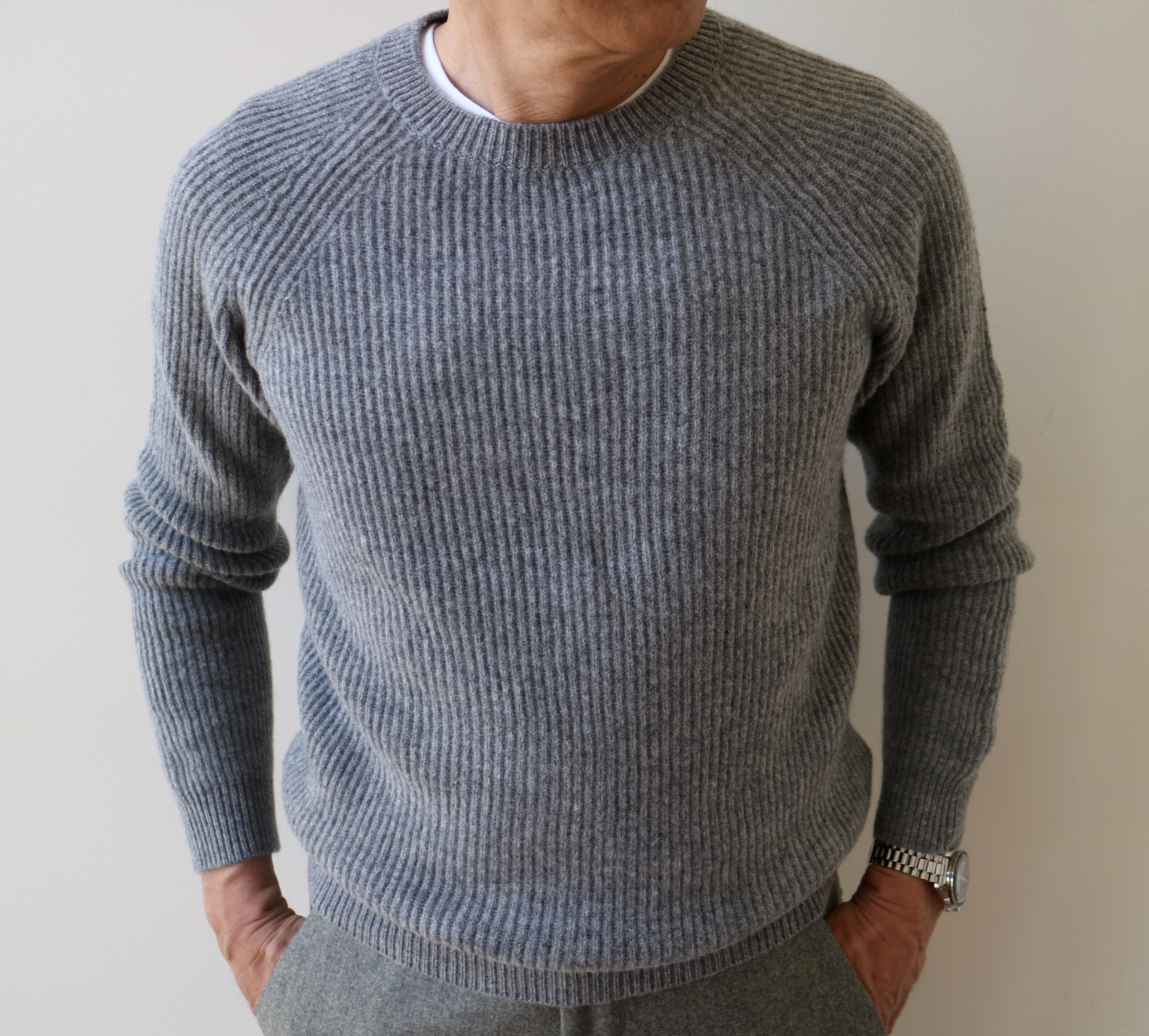 切角ですので、「ラグランスリーブ ラウンドネックセーター」もご覧ください。畦編みの縦の線がフランネルと好相性です。程よく抜けたパンツの雰囲気にも良く合います。