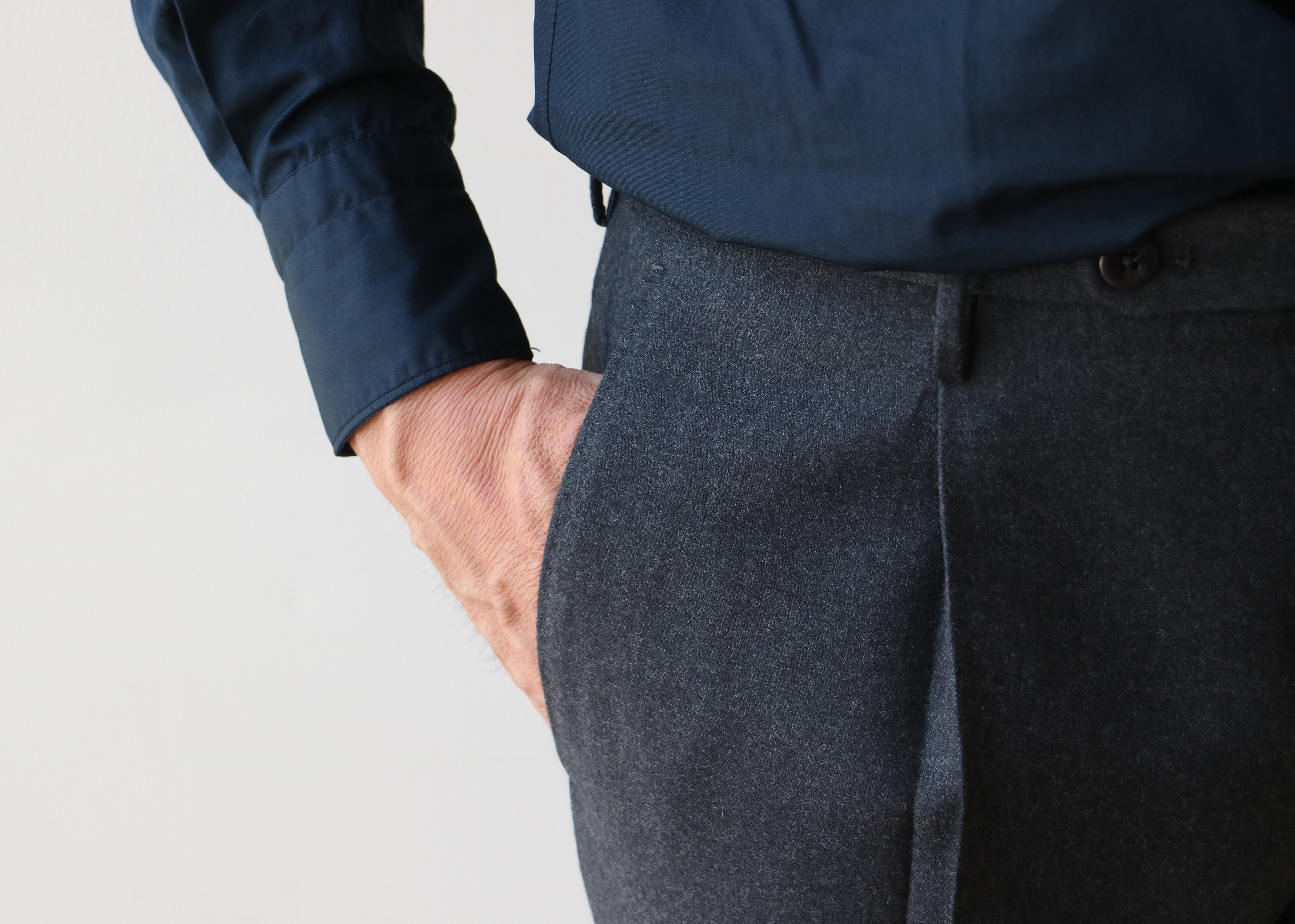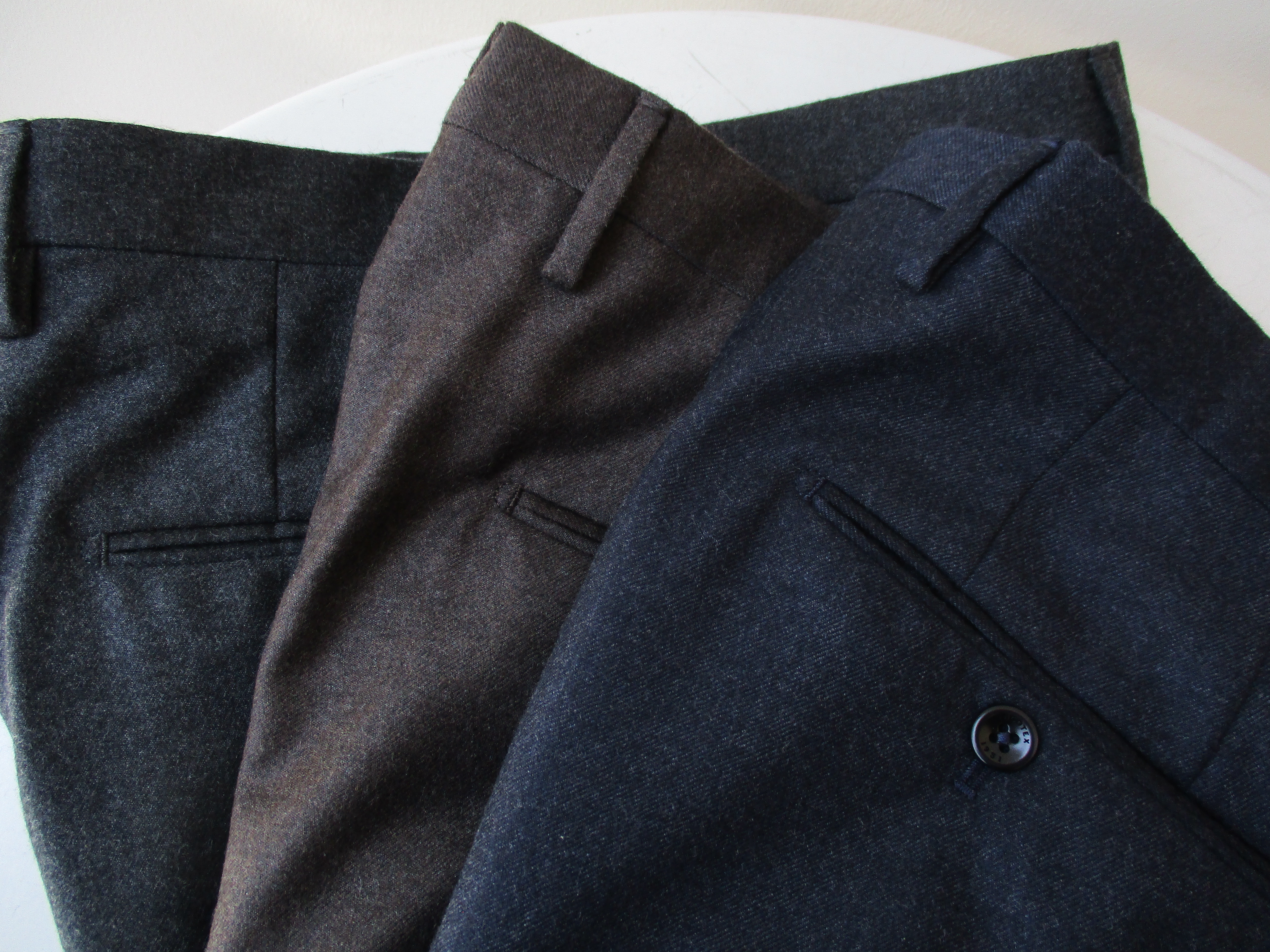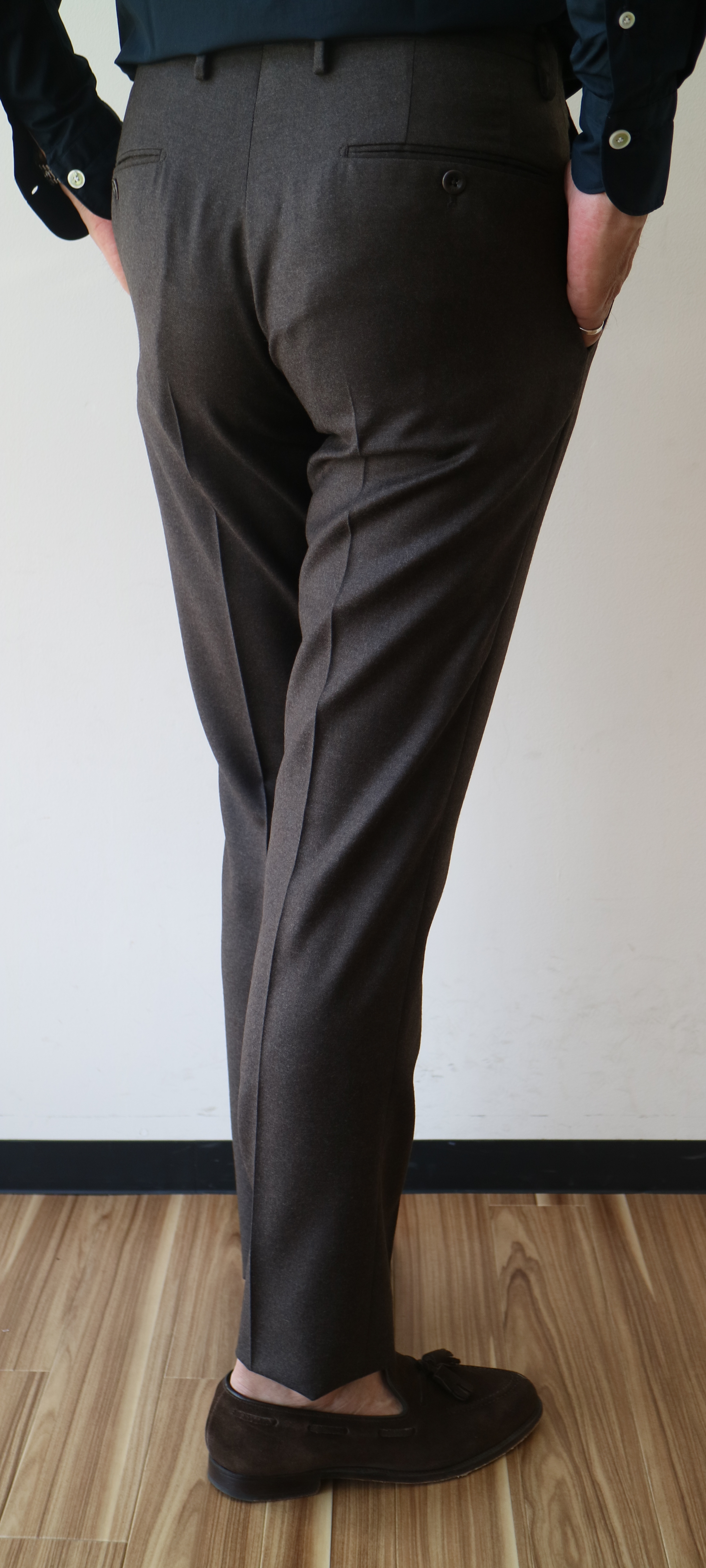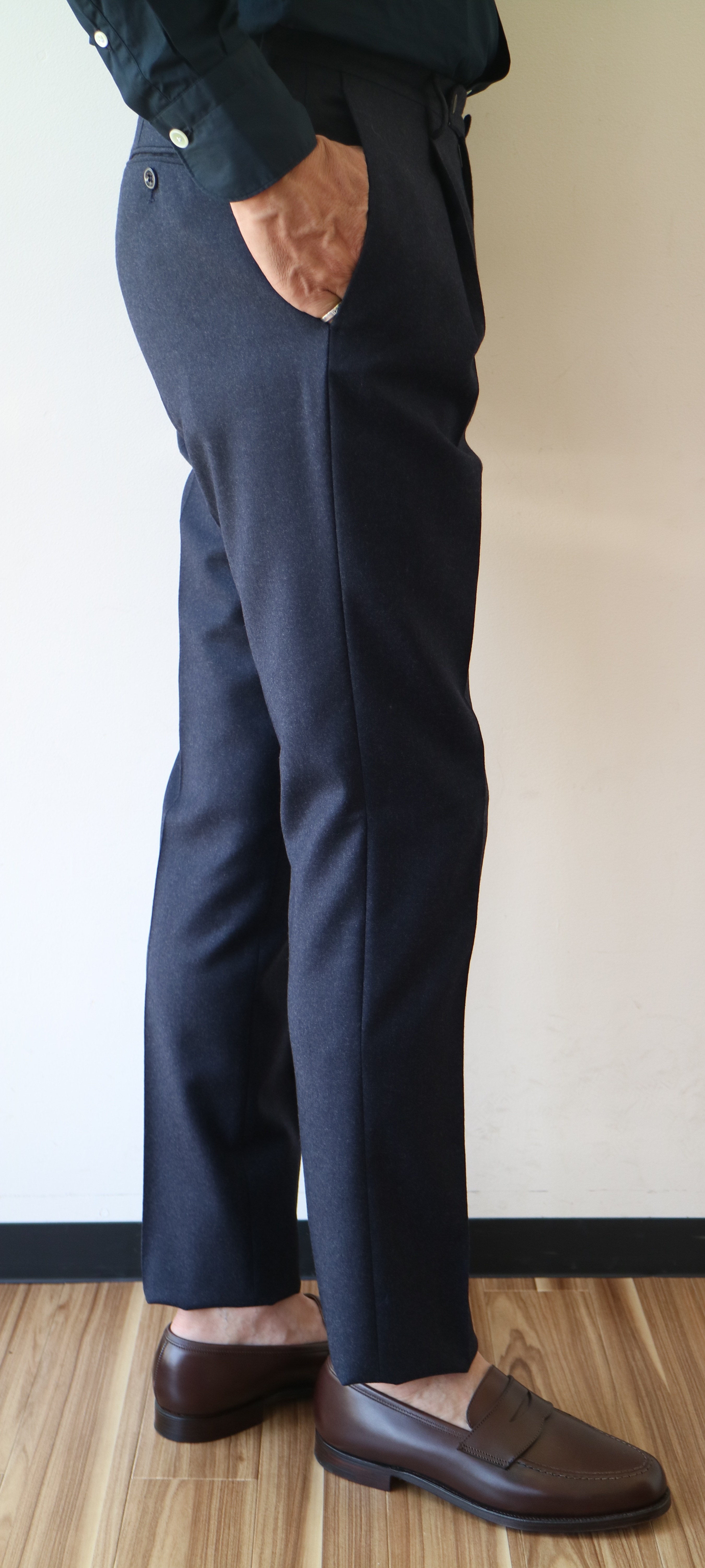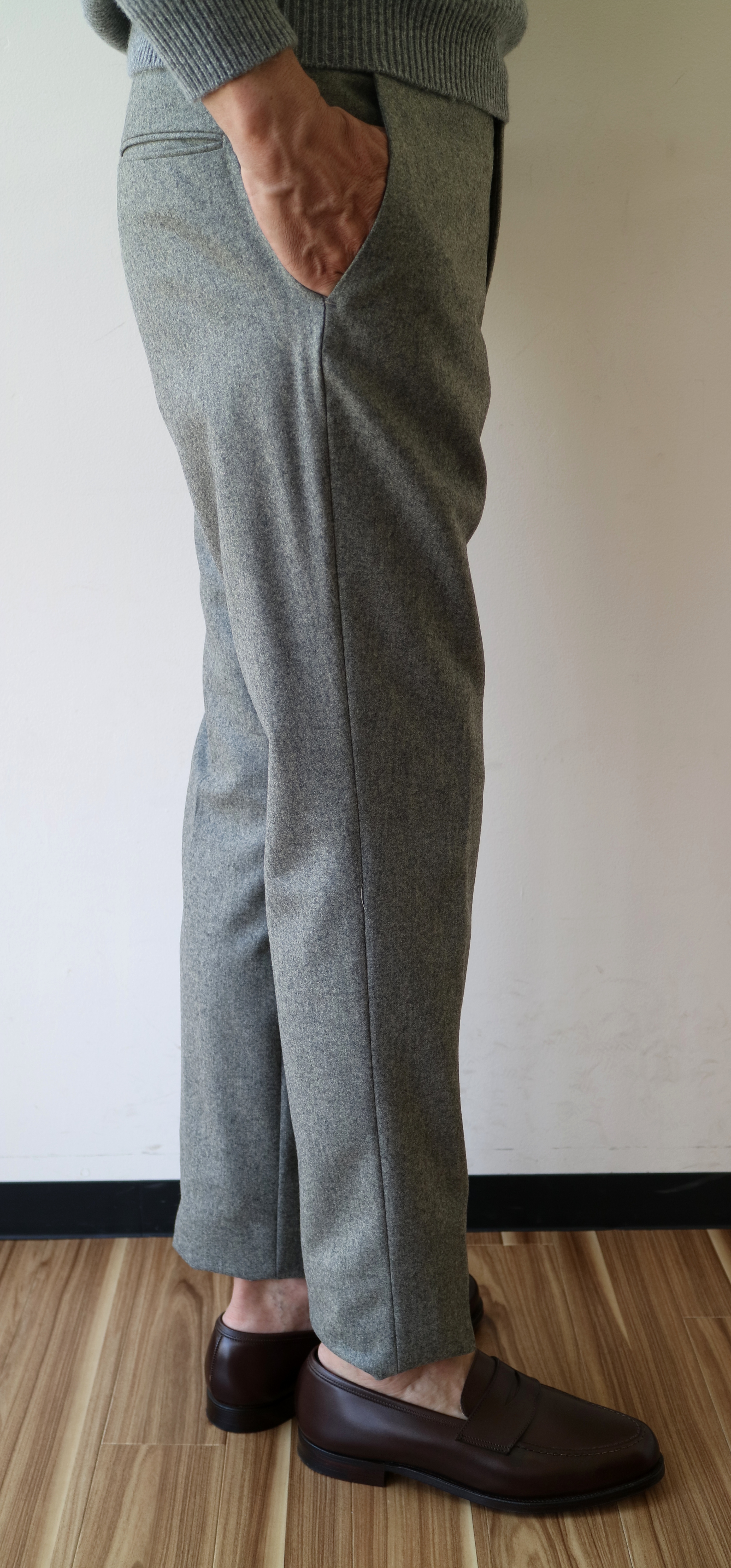 生地は、扱い当時からセレクトしている「SUPER100`S」。美しい表面、しなやかな肌触り、何よりも強度のある生地だけに、立つ座るの動きの多いシーンには欠かせないパンツです。正座は極力避けて欲しいものですが、止むを得ない場合もあります。脱いだらハンガーにかけて蒸気の立つ風呂場に置いておけば、シワは自然と戻ります。穿いたら、休ませるのがコツ。毎日ではなく、他のパンツと交互に穿かれるといいでしょうね。