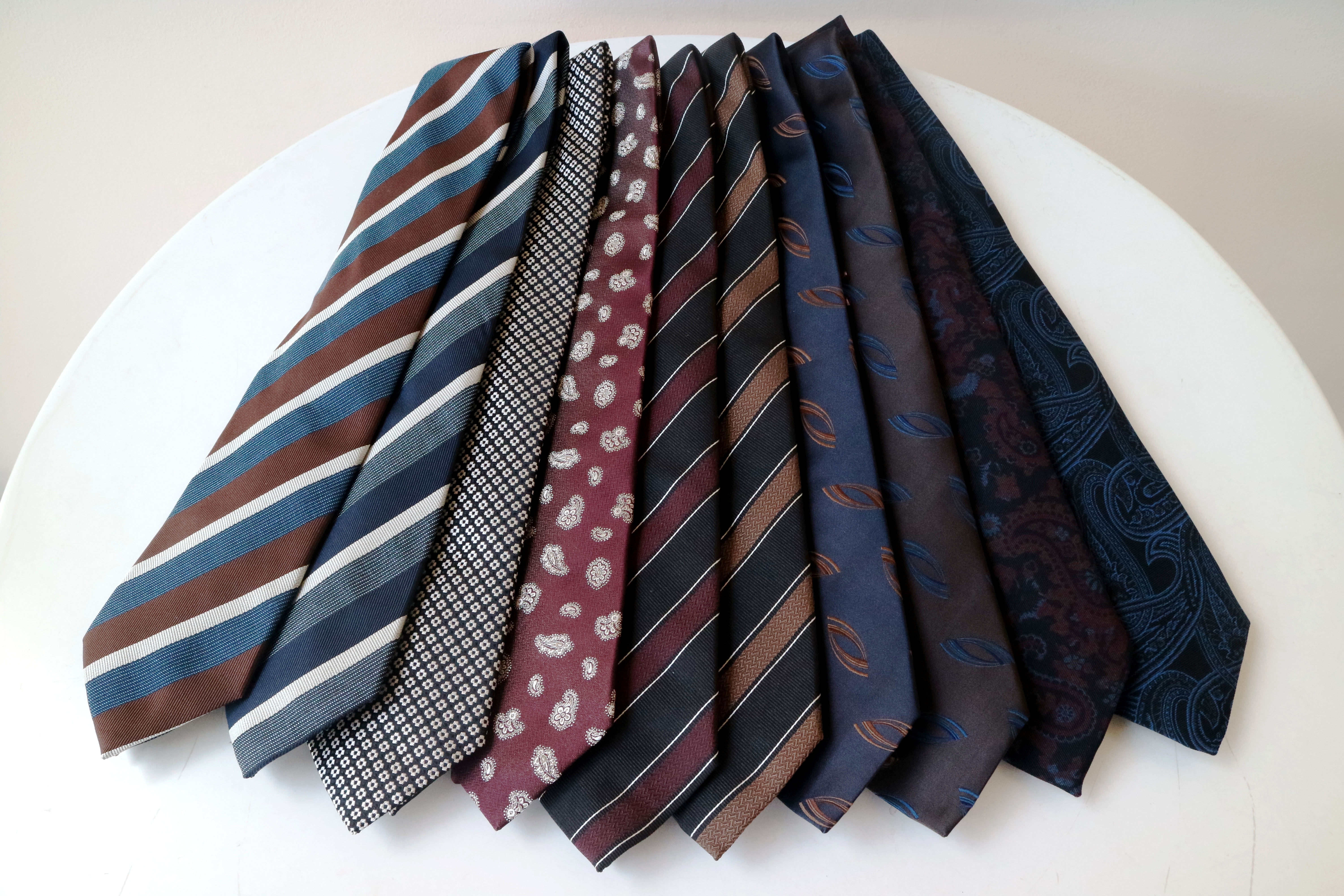 【Holliday&Brown/ホリディ&ブラウン】の魅力は、色と柄のニュアンス。現在は、ネクタイの産地、イタリア・コモで生産されていますが、創業は、1900年初めの英国。後にアメリカ進出し成功を収めた同ブランドは、世界中に名が知られるようになりました。この歴史を聞いただけで、なるほどと思われる方も多いかと思いますが、イギリス的でもありアメリカ的でもありと、純粋のイタリアブランドとは趣が異なります。写真左からご紹介していきます。