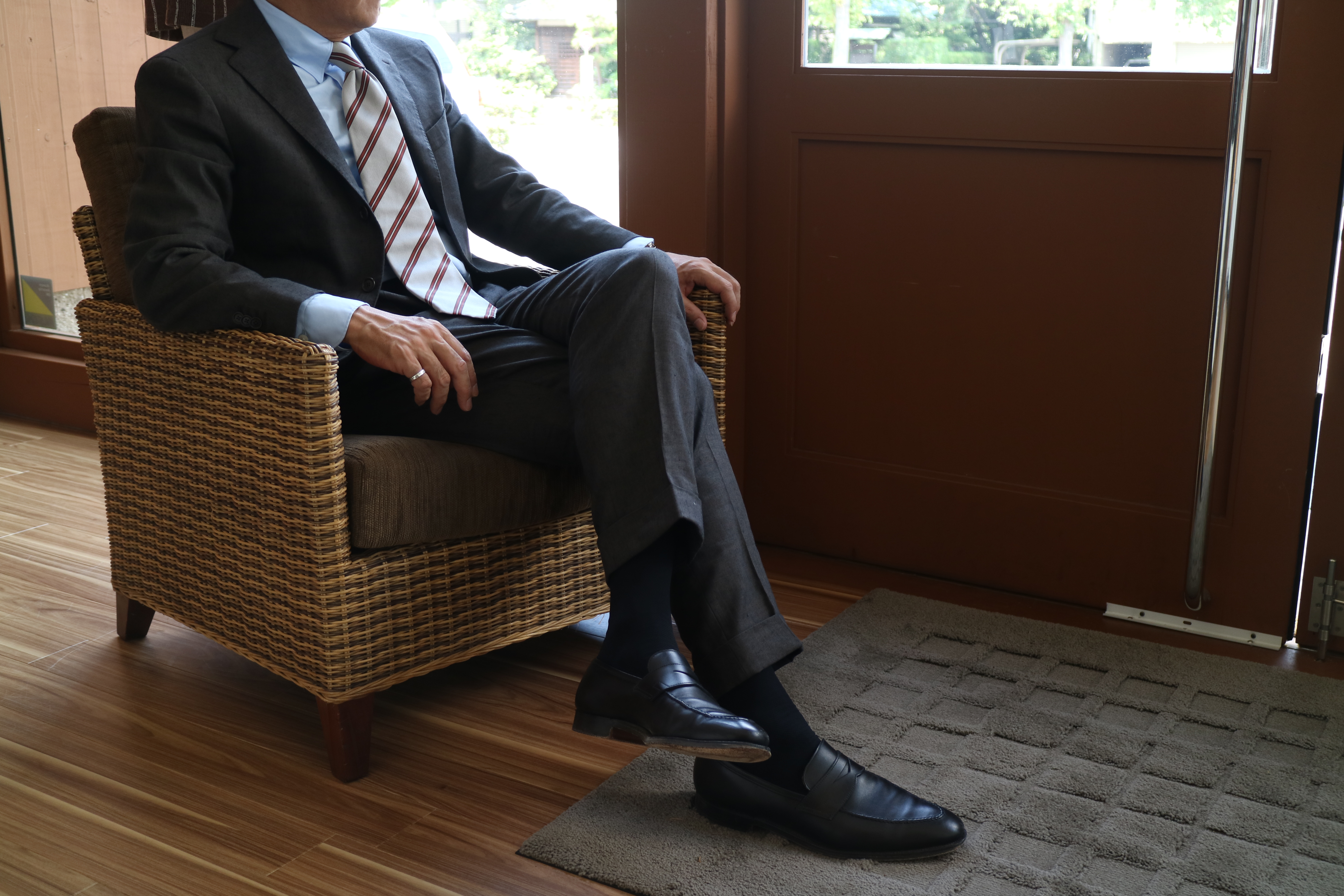 合わせたニットはJOHN SMEDLEY(ジョン スメドレー)、パンツはBorelio(ボレリオ) 。こちらはブラックを使っております。靴は私物のCROCKETT&JONES(クロケット&ジョーンズ)です。