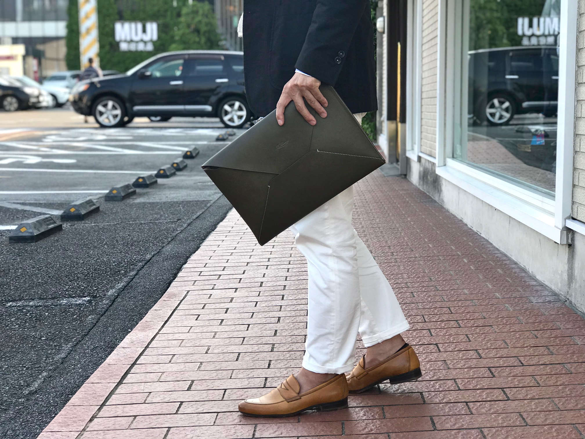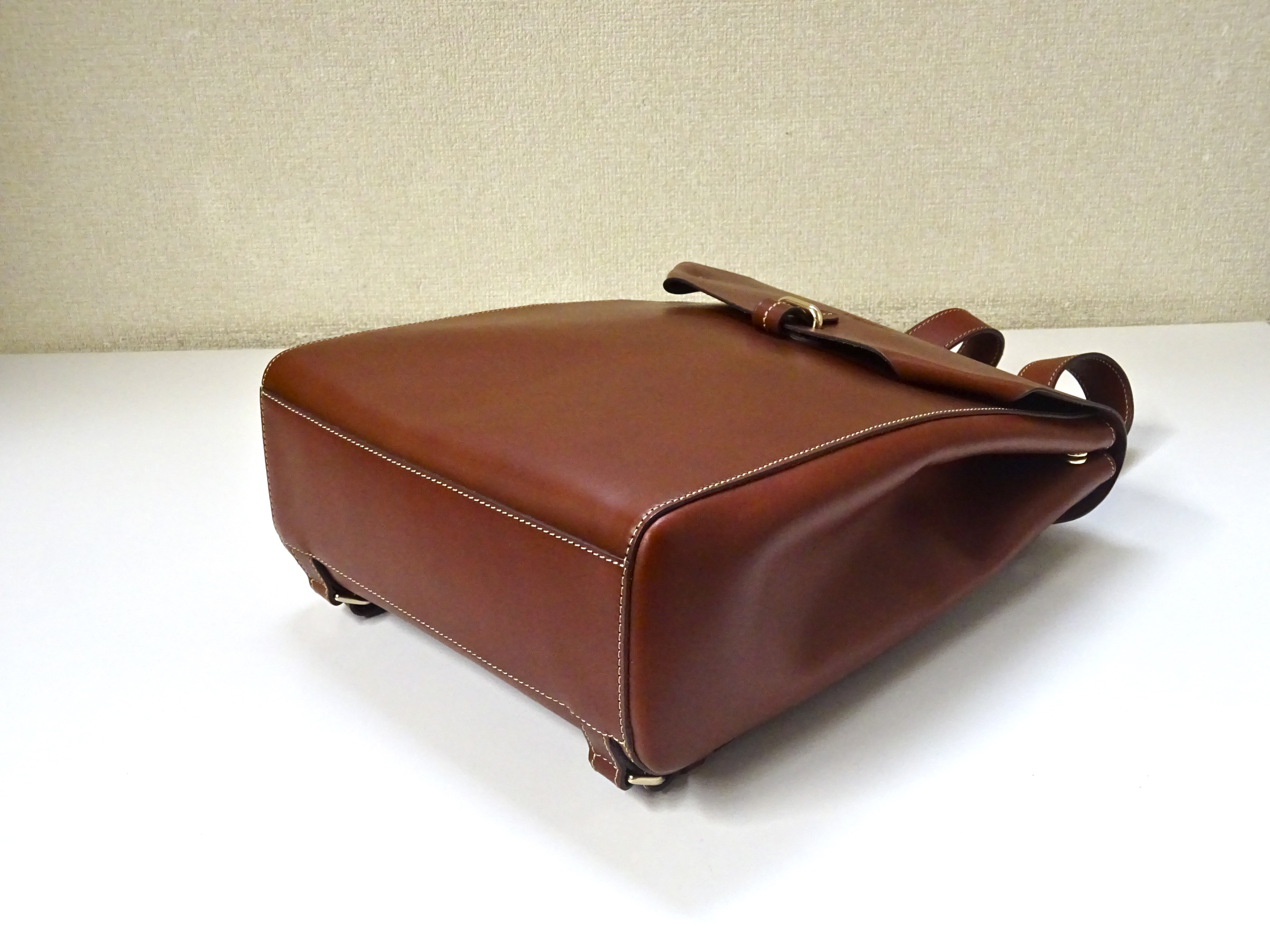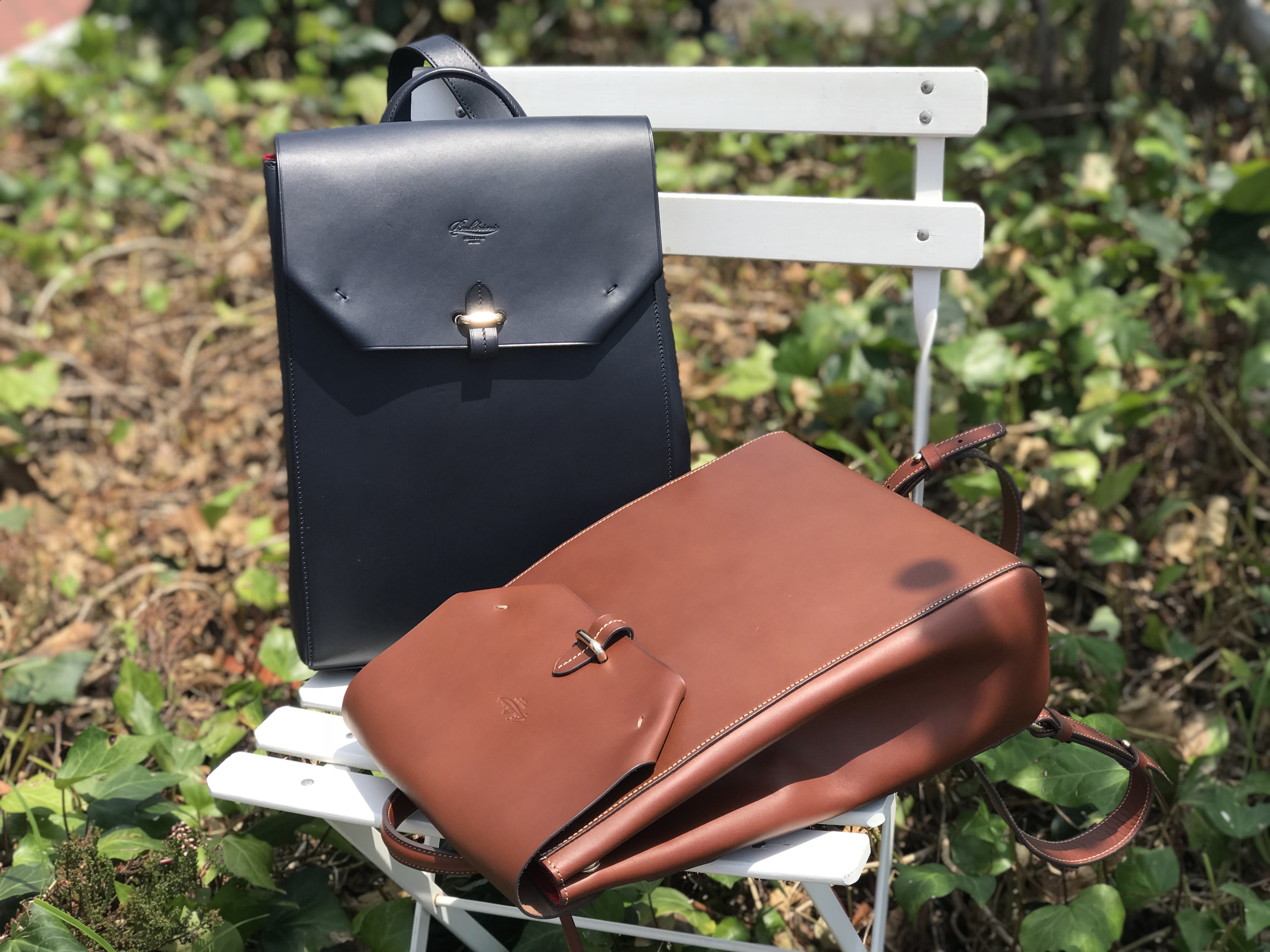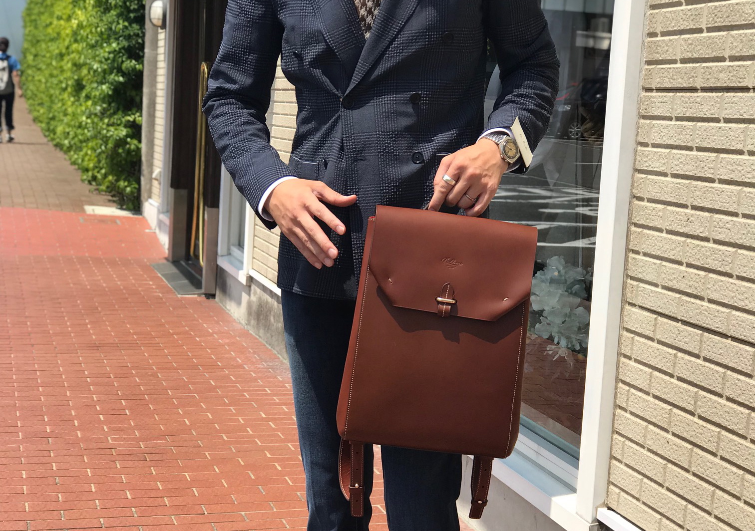 同じく堅牢なベジタブルタンニンレザーを使用したリュックで、シンプルで品の良いデザインには独特な落ち着きがあって、上部に付いたハンドルで持ち歩けば、ジャケットやスーツスタイルにも違和感がなく、むしろ新たなスタイルとして確立してきているでしょうか。
