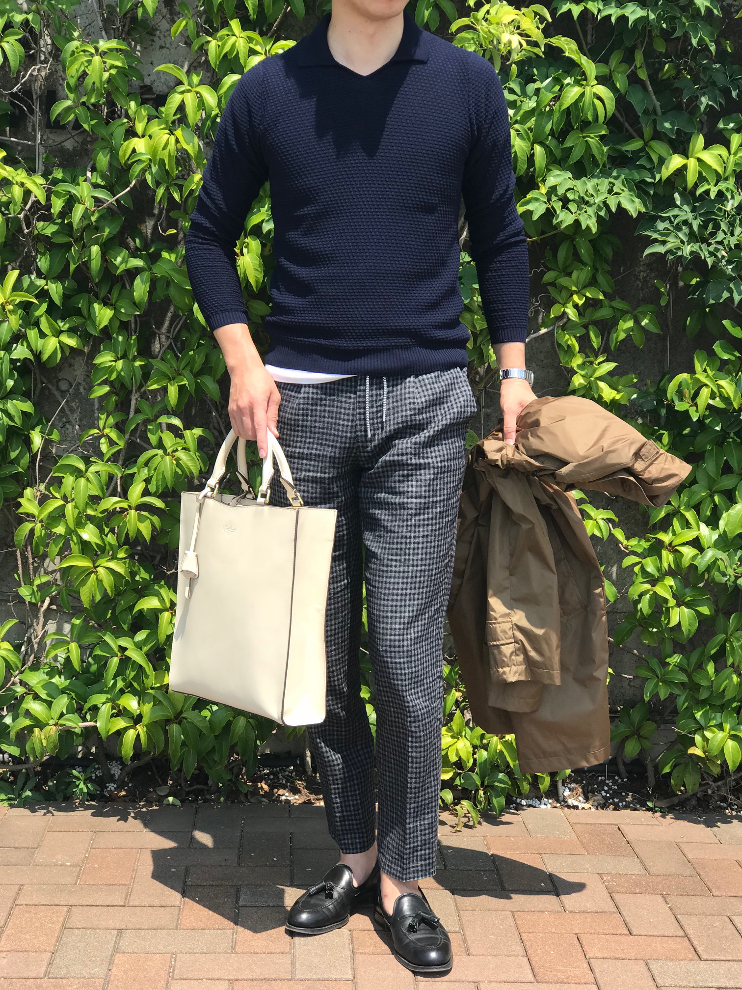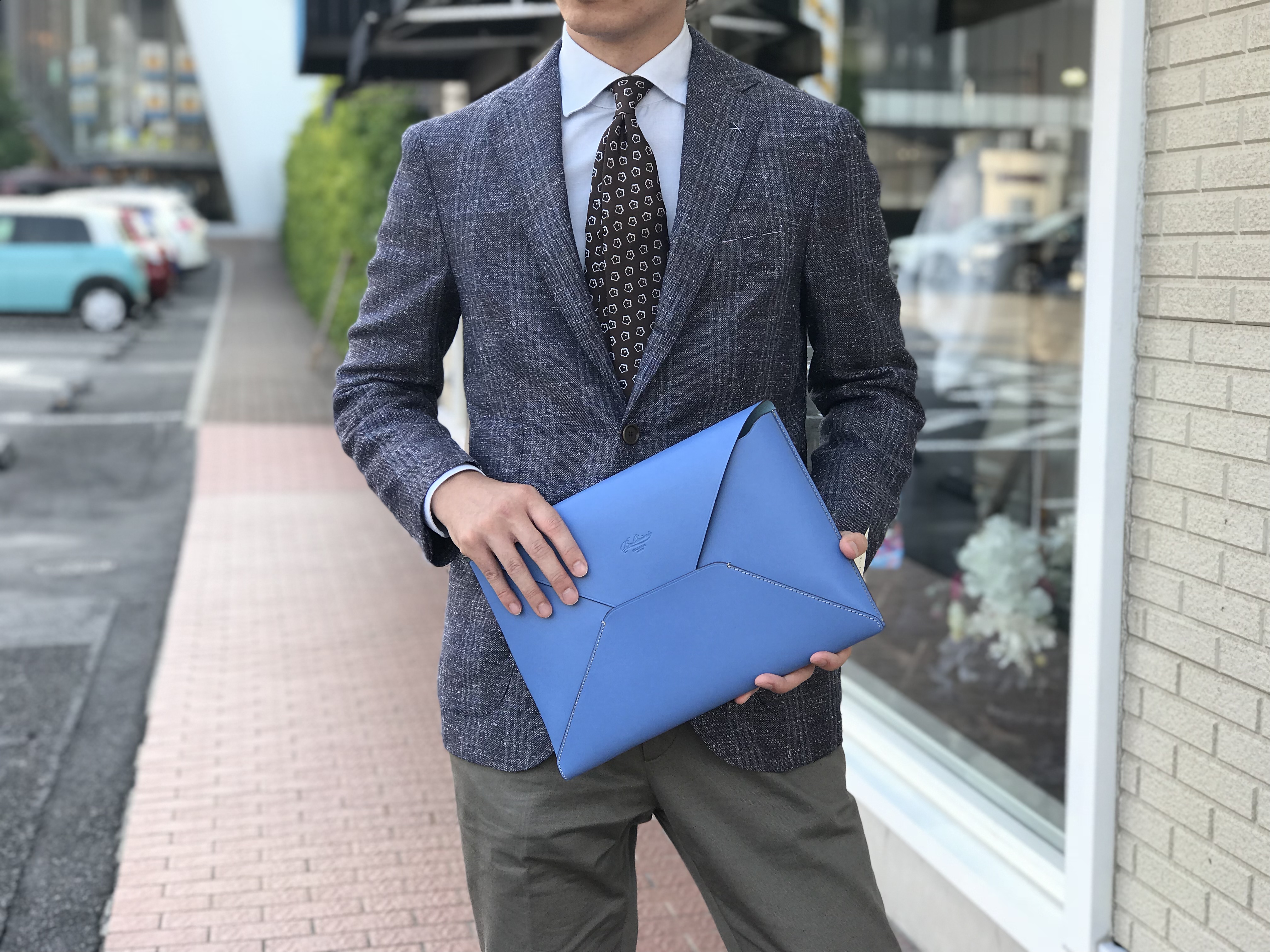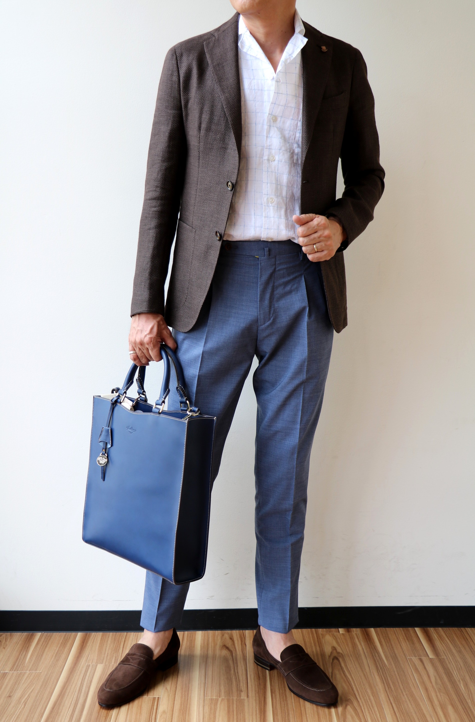 茶で使ったのは、TAGLIATORE(タリアトーレ)のジャケット。サイズ46がジャストですが、完売の為、44を着ております。爽やかな青は、PT01(ピーティーゼロウーノ)。このコーディネートでも、Boldrini SELLERIA(ボルドリーニ セレリア)のバッグやFERRANTE(フェランテ)の靴が、革の魔力を発揮。ベジタブルタンニンなめしの堅牢な表情とスウェードの柔らかさが、絶妙なハーモニーを醸しだしてくれます。