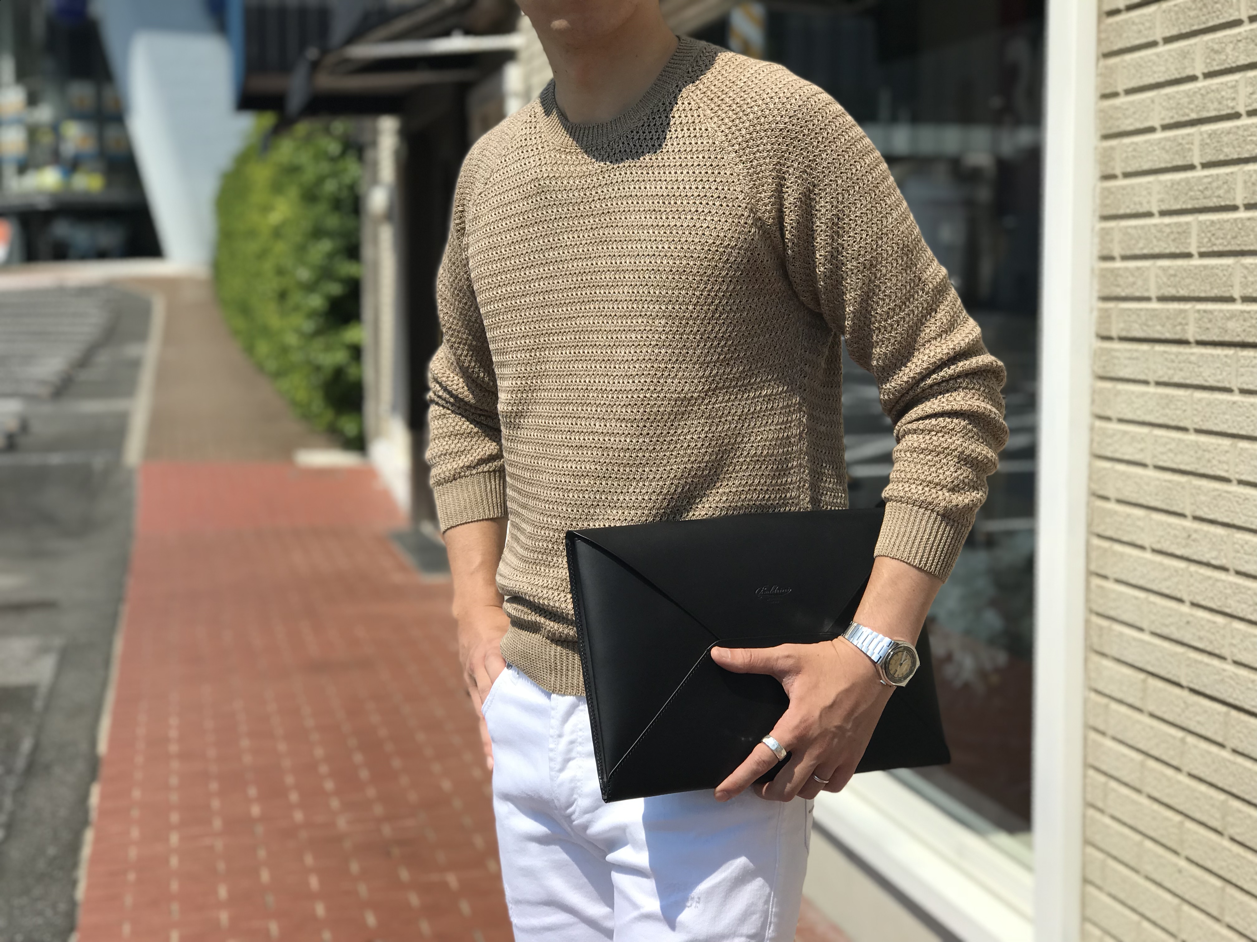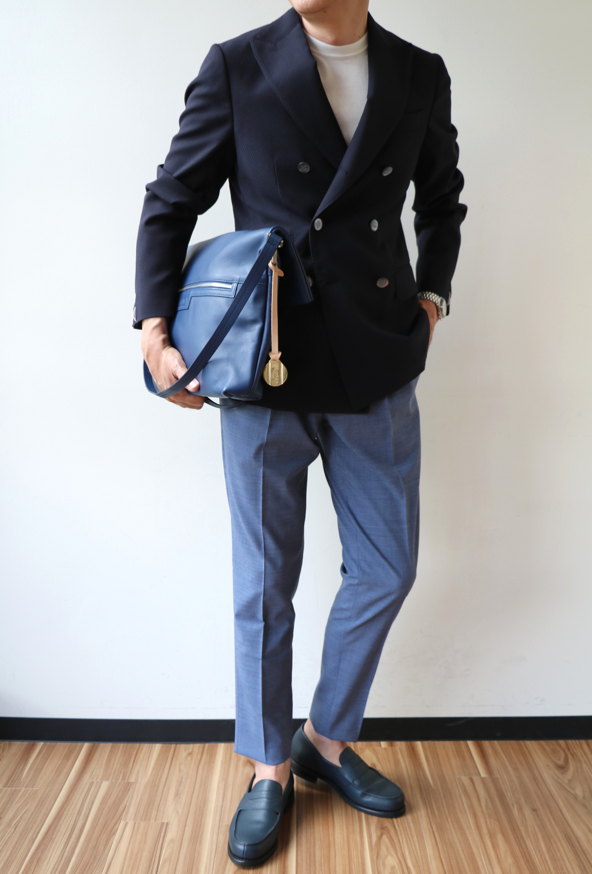 前回のブログでも使っていたPT01(ピーティーゼロウーノ)のパンツ。ご紹介後、大きな反響?があり、残すところサイズ48のみです。今回は、THE GIGI(ザ・ジジ)のダブルブレストのジャケットを羽織ってみました。中に着ているニットはFILIPPO DE LAURENTIIS(フィリッポ デ ローレンティス)。ホワイトより生成りに近いオフホワイトですが、全体を柔らかくまとめます。靴はParaboot(パラブーツ)、手に持ったバッグはDE'.CO.CA(デーコカ)。同じ青でも素材により、表情は様々です。