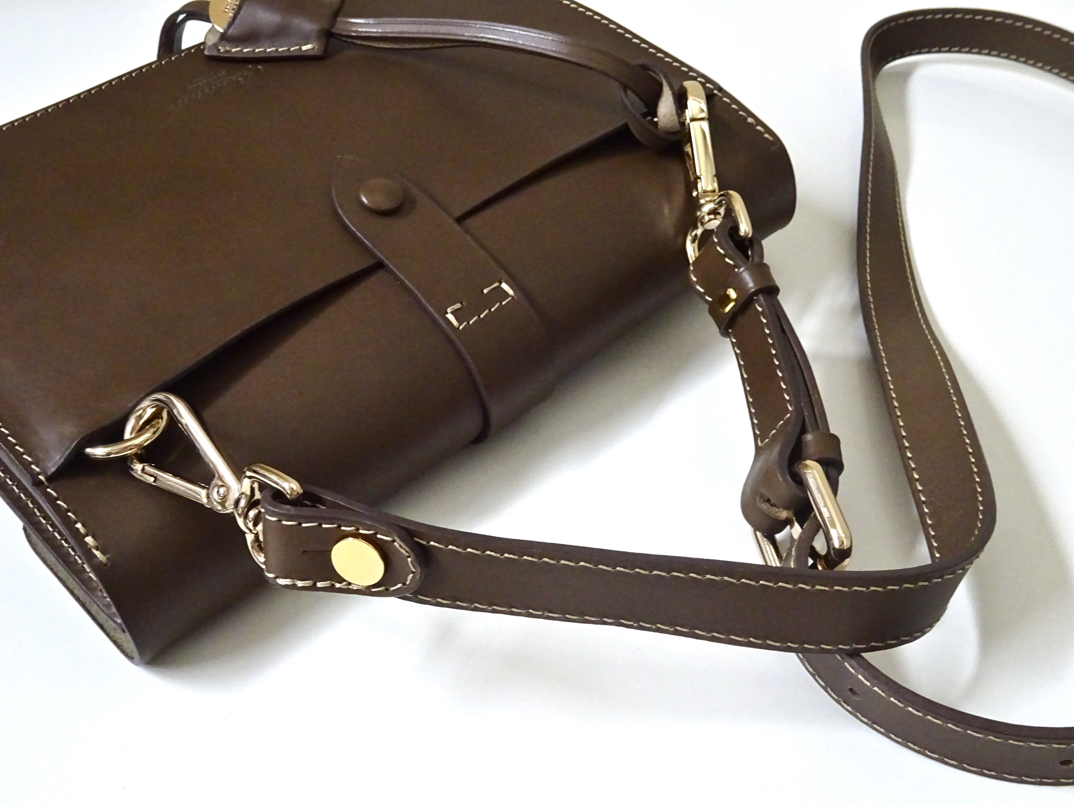 レディースブランドが多く集まる中、同行バイヤーのジュニアの目に留まったのがこちらのミニポーチ。ショルダーとクラッチバッグにもなる2WAYタイプで、イタリアンレザーからイメージする柔らかく軽快な風合いからは一線を画し、英国レザーのような堅牢でクラシカルなデザインです。