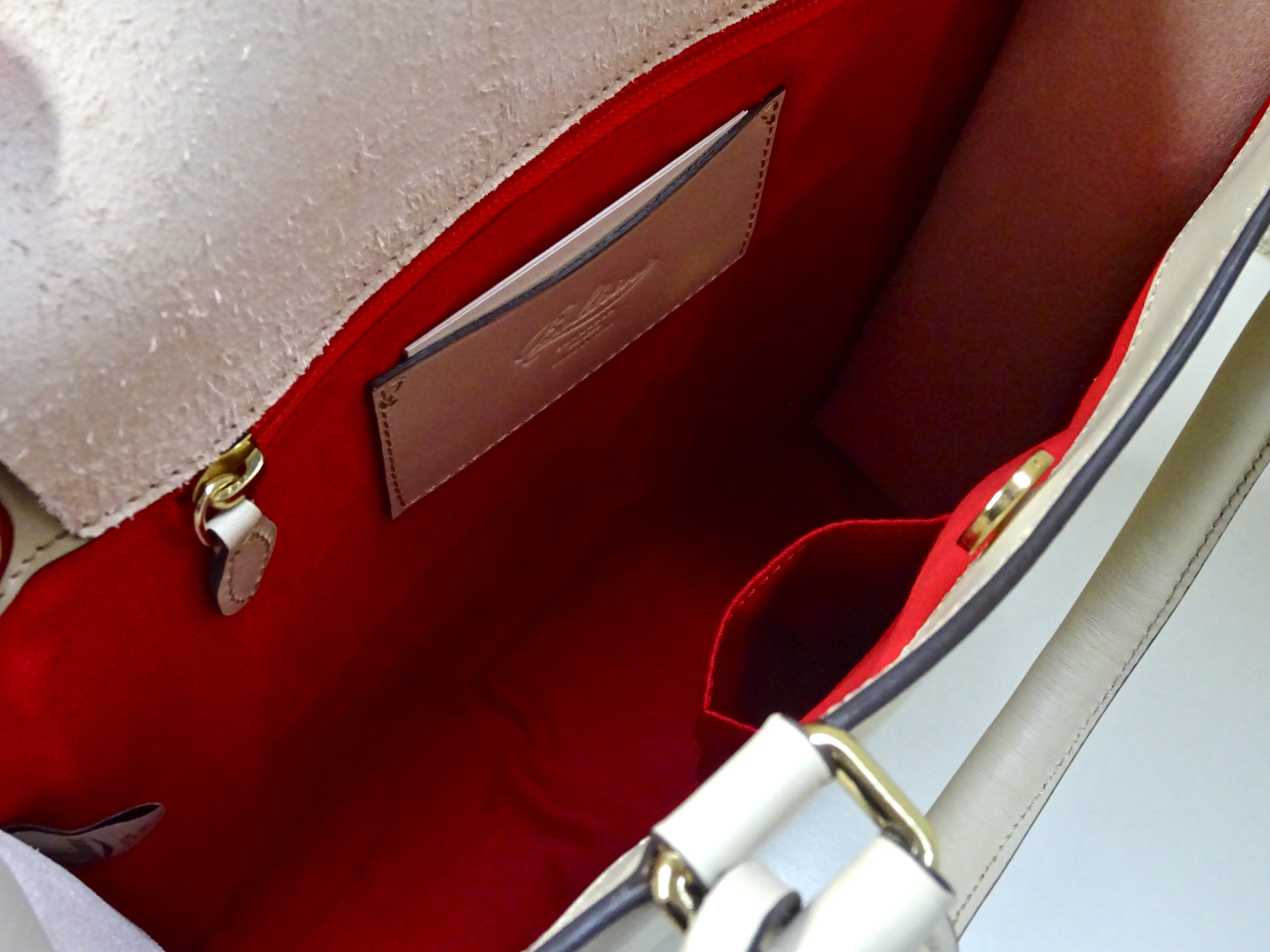 蓋はレザーのベロを差し込むだけの簡単なデザインで、入り口部分は釦を外すことで広げることができます。そして、ライニングは両色ともレッドのキャンバス地です。