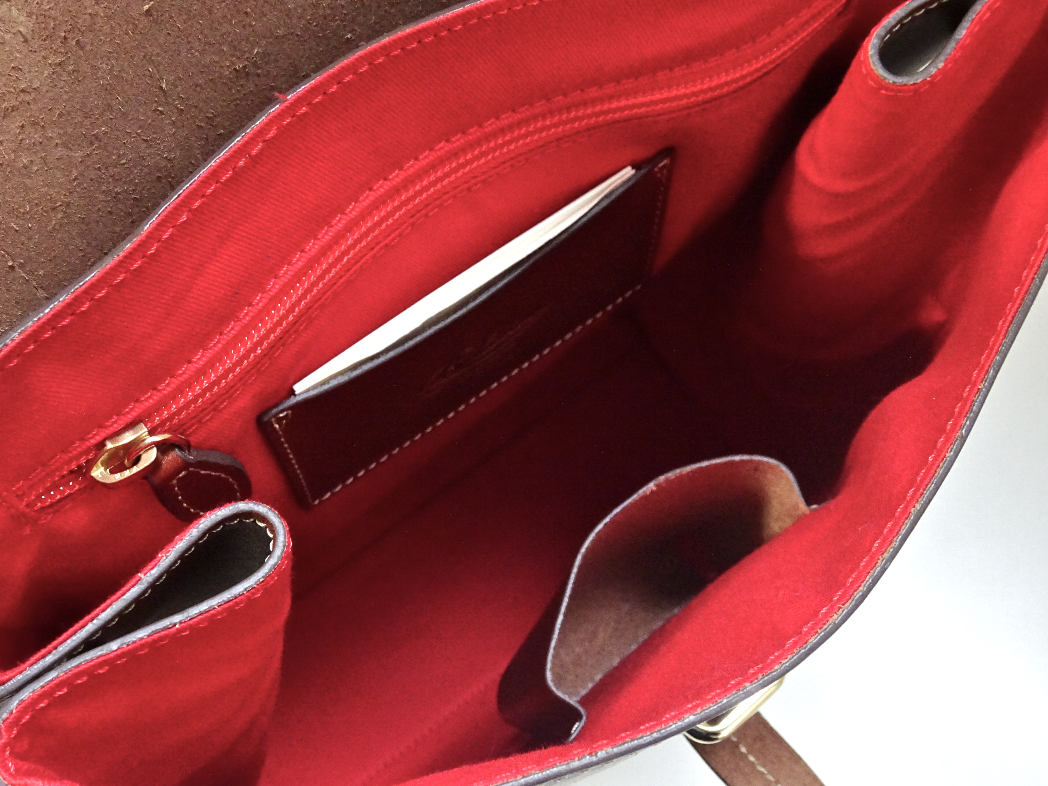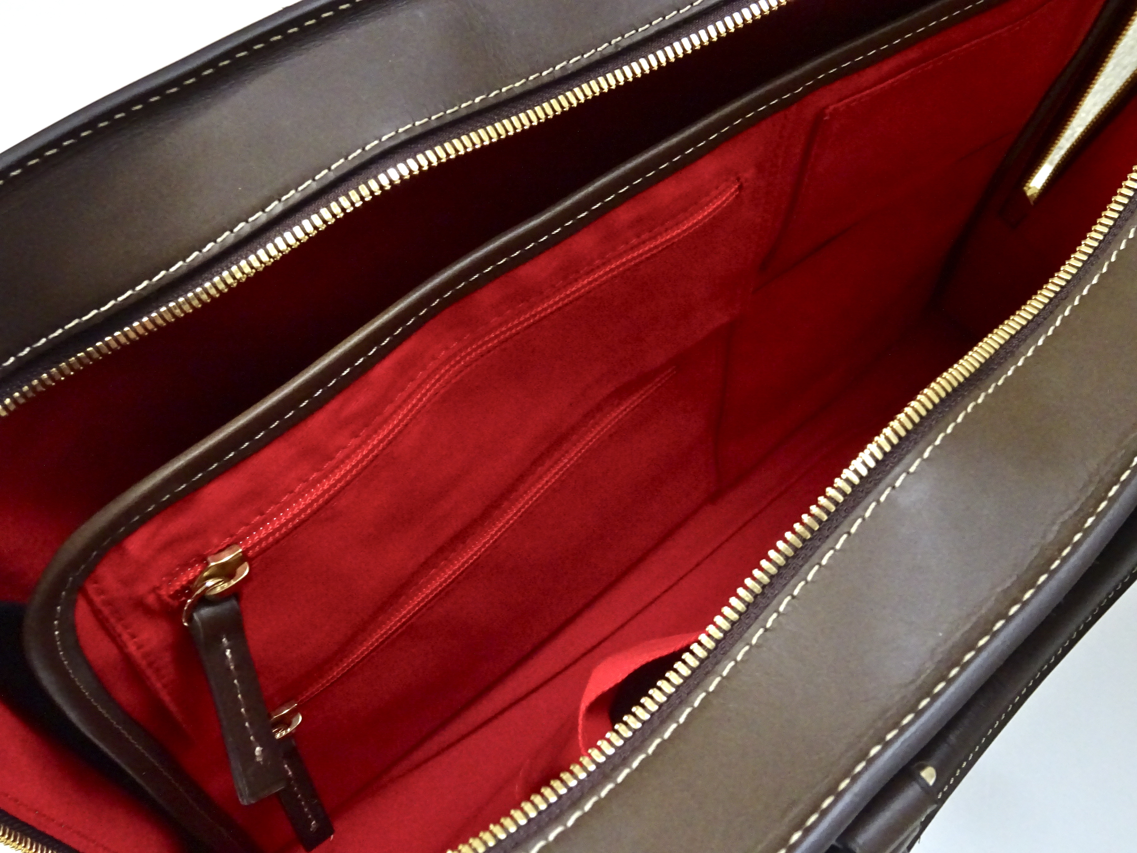 ライニングはもちろんレッド。真ん中には間仕切りがあって、いくつか小さなポケットもあり、小分けや収納に便利です。また、変形し難い堅牢な革だからこそ整理整頓がしやすく、A4のファイルや用紙等も余裕を持ってきっちり収納することができます。