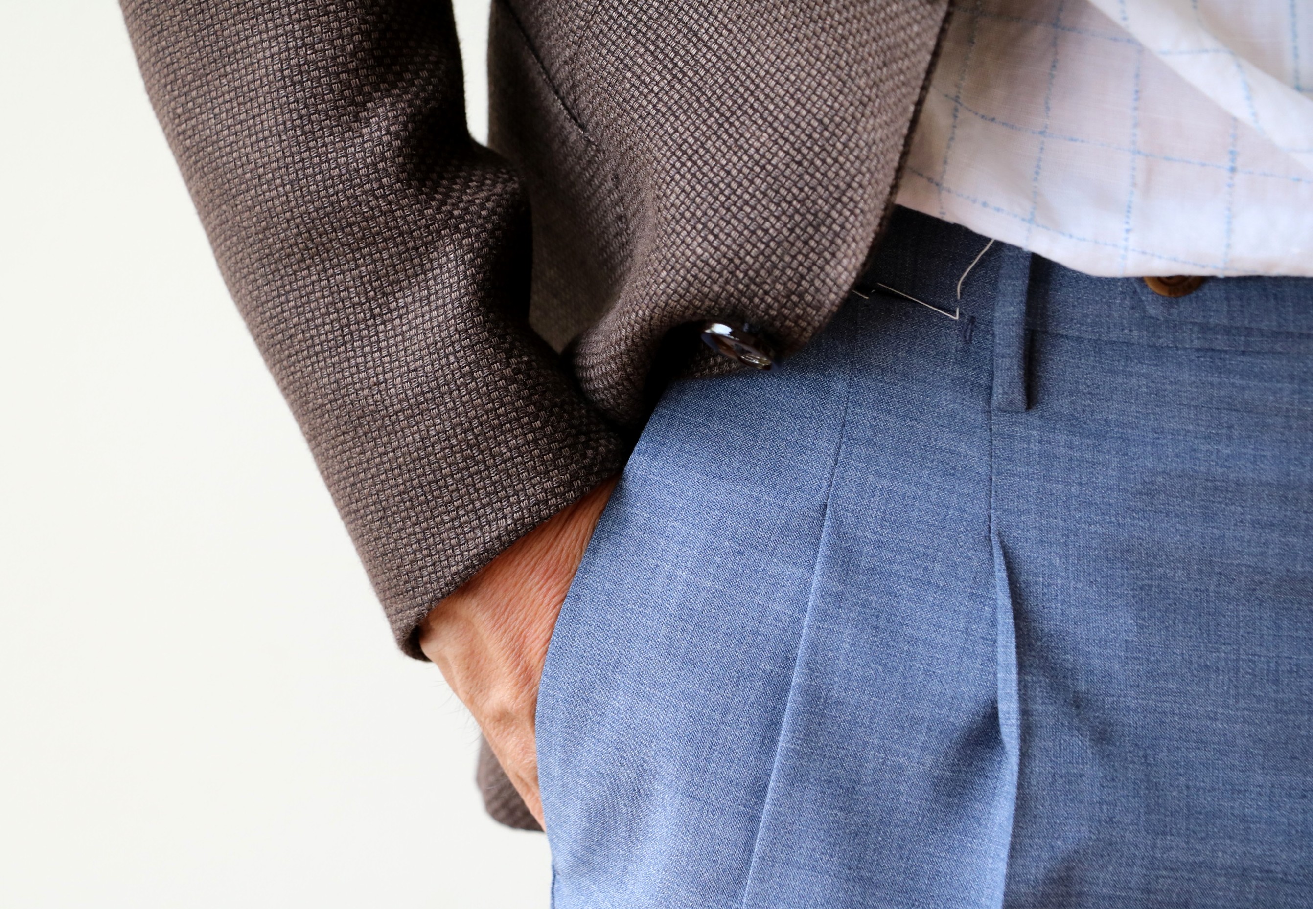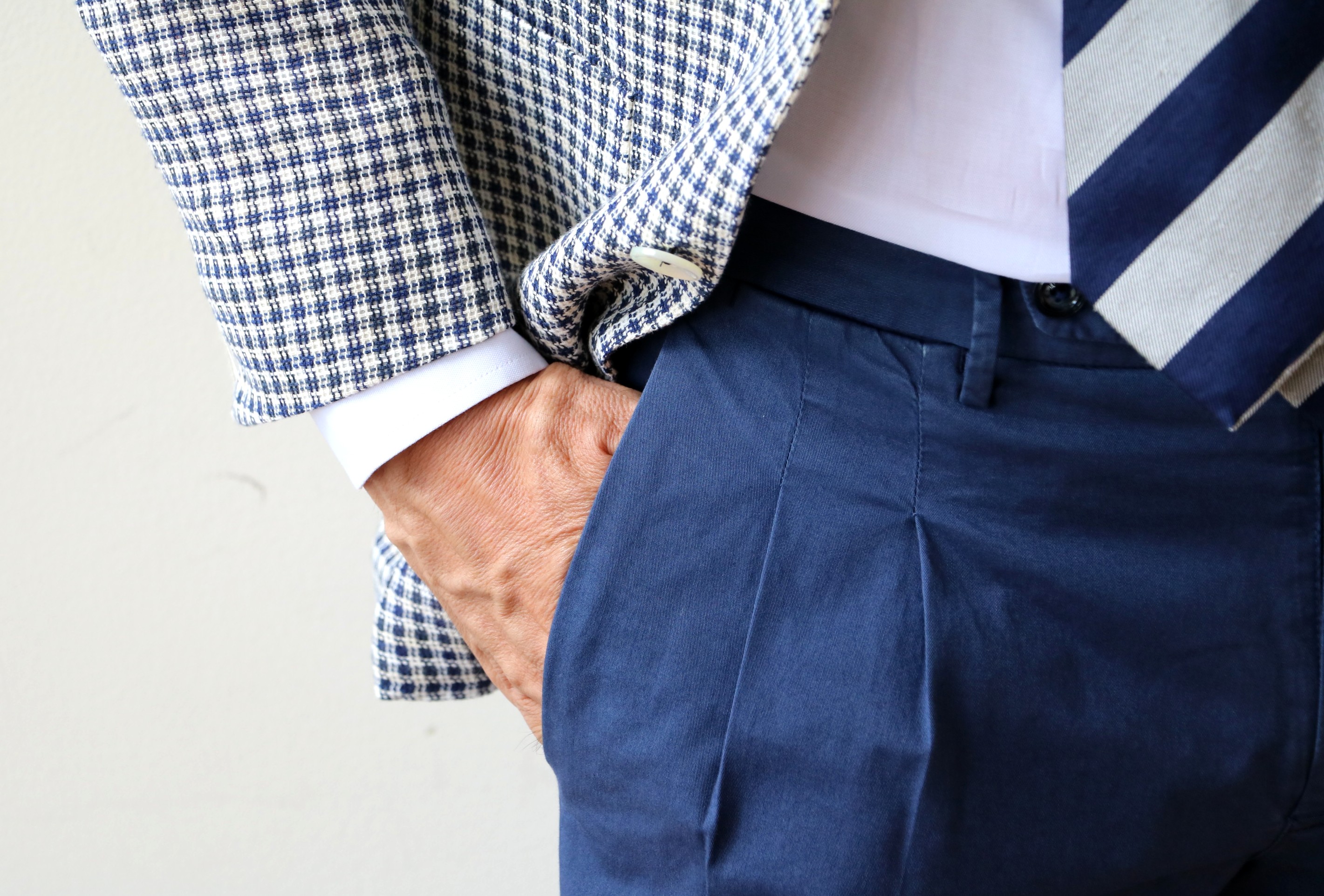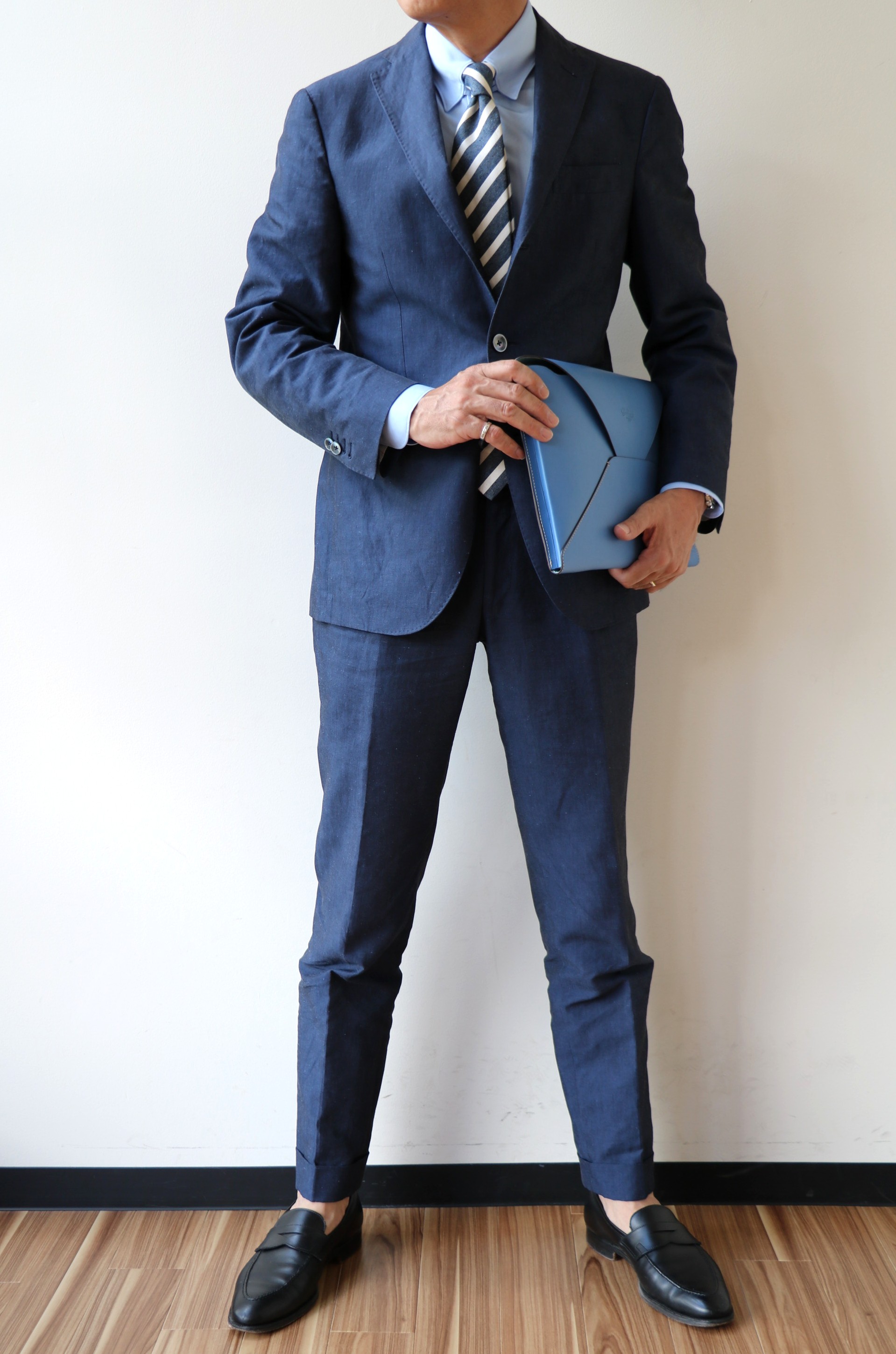 涼しげ、いや実際に涼しいのは、リネン・コットンのジャケット地。翳してみれば、向こう側が透けて見えるほど、ざっくりした織地。着ている人だけではなく、周囲の人にも涼風を吹かせるはずです。ボタンダウンシャツの襟のロール感もなぜか優しげ。パンツの色も濃紺ではなく、明るめで軽やかな青。涼しさに一役買っています。