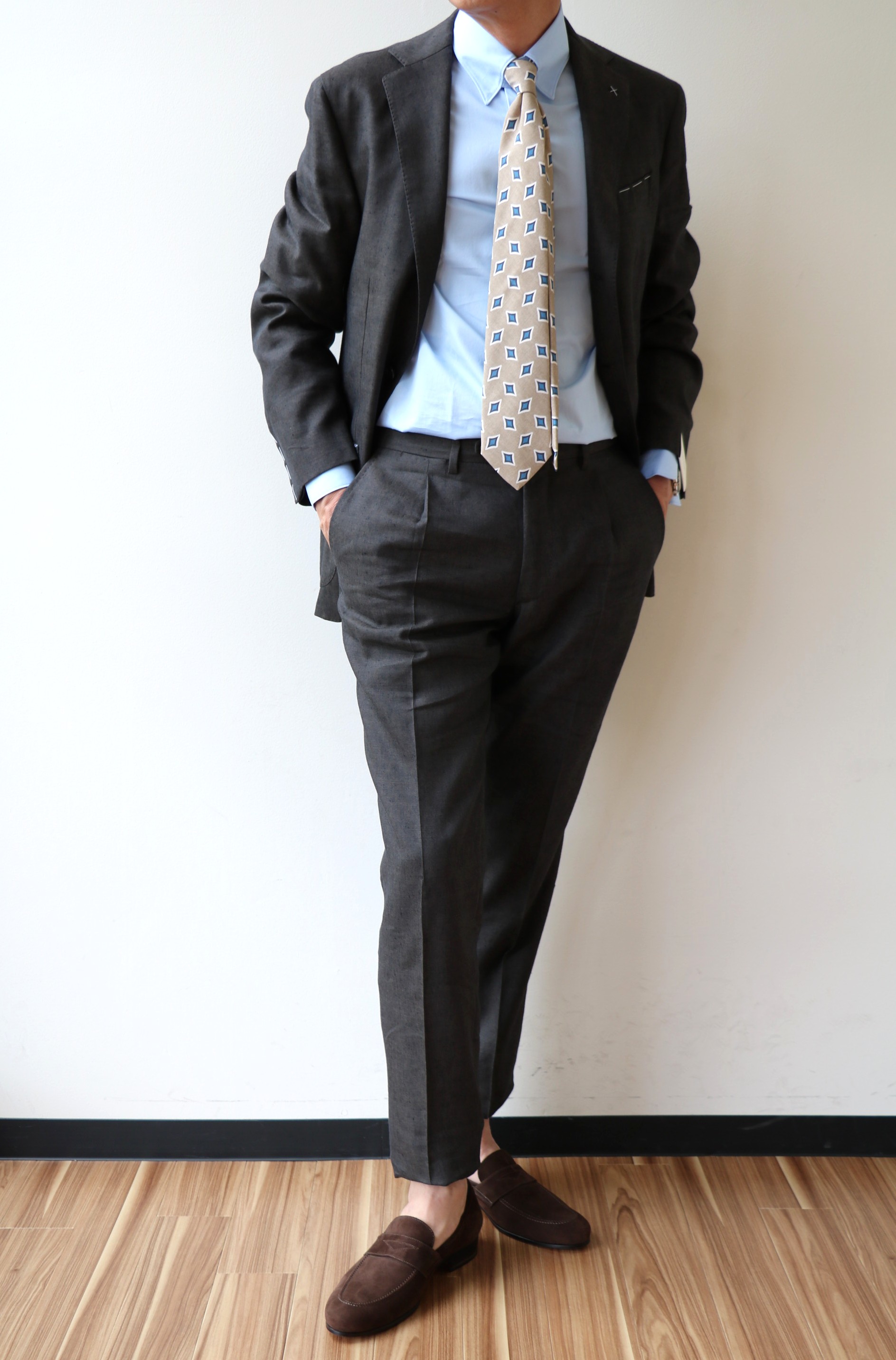 そして遂に購入を決意。今季、最初に手に入れたのが、THE GIGI(ザ・ジジ)のスーツ。2着目としてワードローブに加わるのが、このDe Petrillo(デ・ペトリロ)。ウール素材に比べ、リネン混は、やや緩めな作り(その理由は、後日です)。その抜け感が、決め手となりました。ジジが青、ペトリロが茶と、セレクトもアズーロ・エ・マローネ...なんて話はさておき、組合わせたのが、ブルーのFinamore(フィナモレ)のシャツに、FRANCO BASSI(フランコ・バッシ)のネクタイ。ベージュにブルーを配したオールオーバー柄で上下を優しく繋ぎます。靴は、ブルーではなく、パンツと同系色のFERRANTE(フェランテ)のローファーを履き、軽やかで、安定感のあるコーディネートを作り出しました。