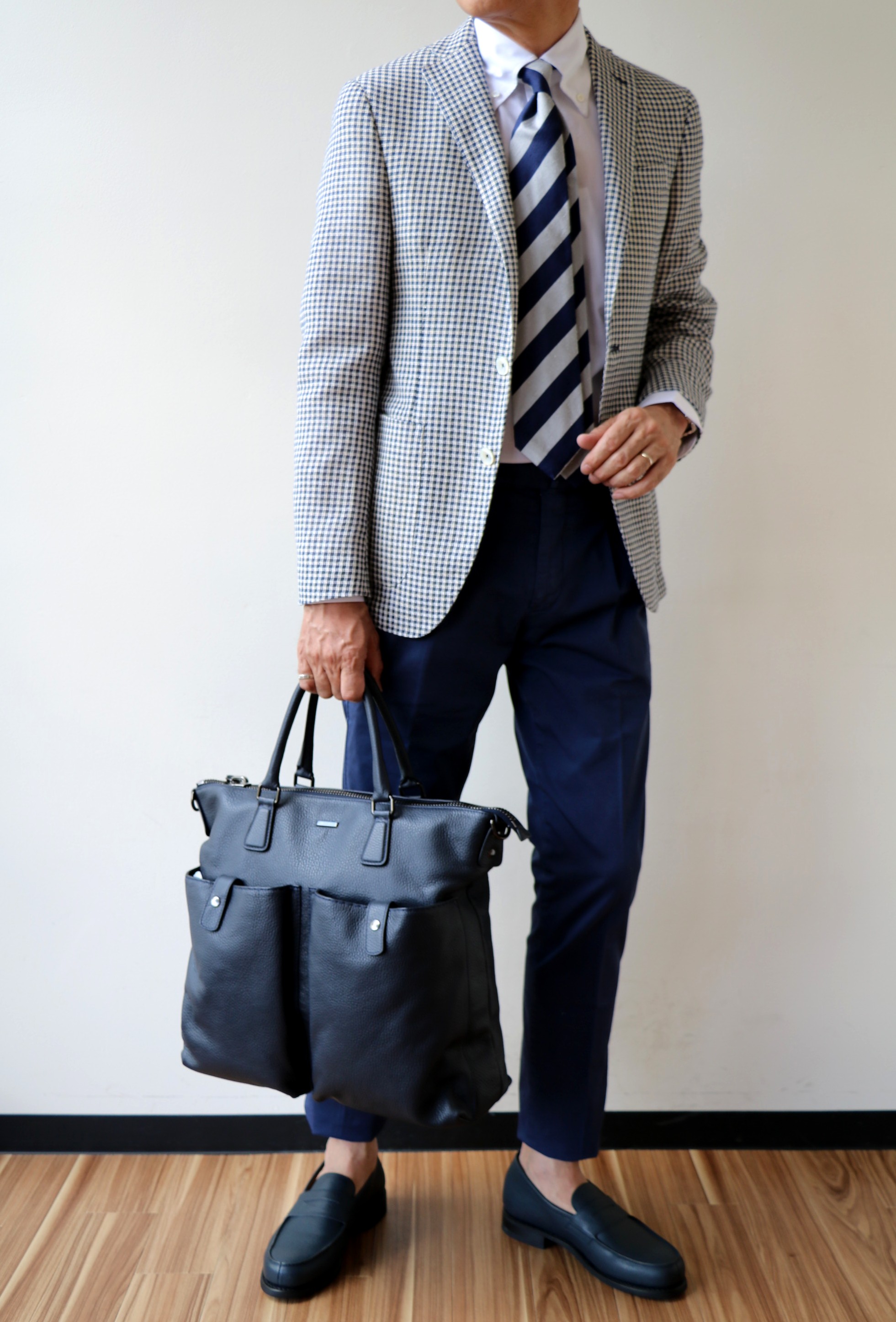 青が嫌いという人は少ないはずです。青からイメージできるのは、爽やかな空や広大な海。寒色系の青は涼しげに見えるだけに、暑い夏には欠かせない色と言っても良いかもしれません。上の写真もも清涼感溢れるコーディネートになりました。チェックのジャケットはTHE GIGI(ザ・ジジ)、シャツはMario Muscariello(マリオ ムスカリエッロ)、ネクタイはFRANCO BASSI(フランコ バッシ)、パンツはPT01(ピーティーゼロウーノ)、靴はParaboot(パラブーツ)、バッグはZANELLATO(ザネラート)です。