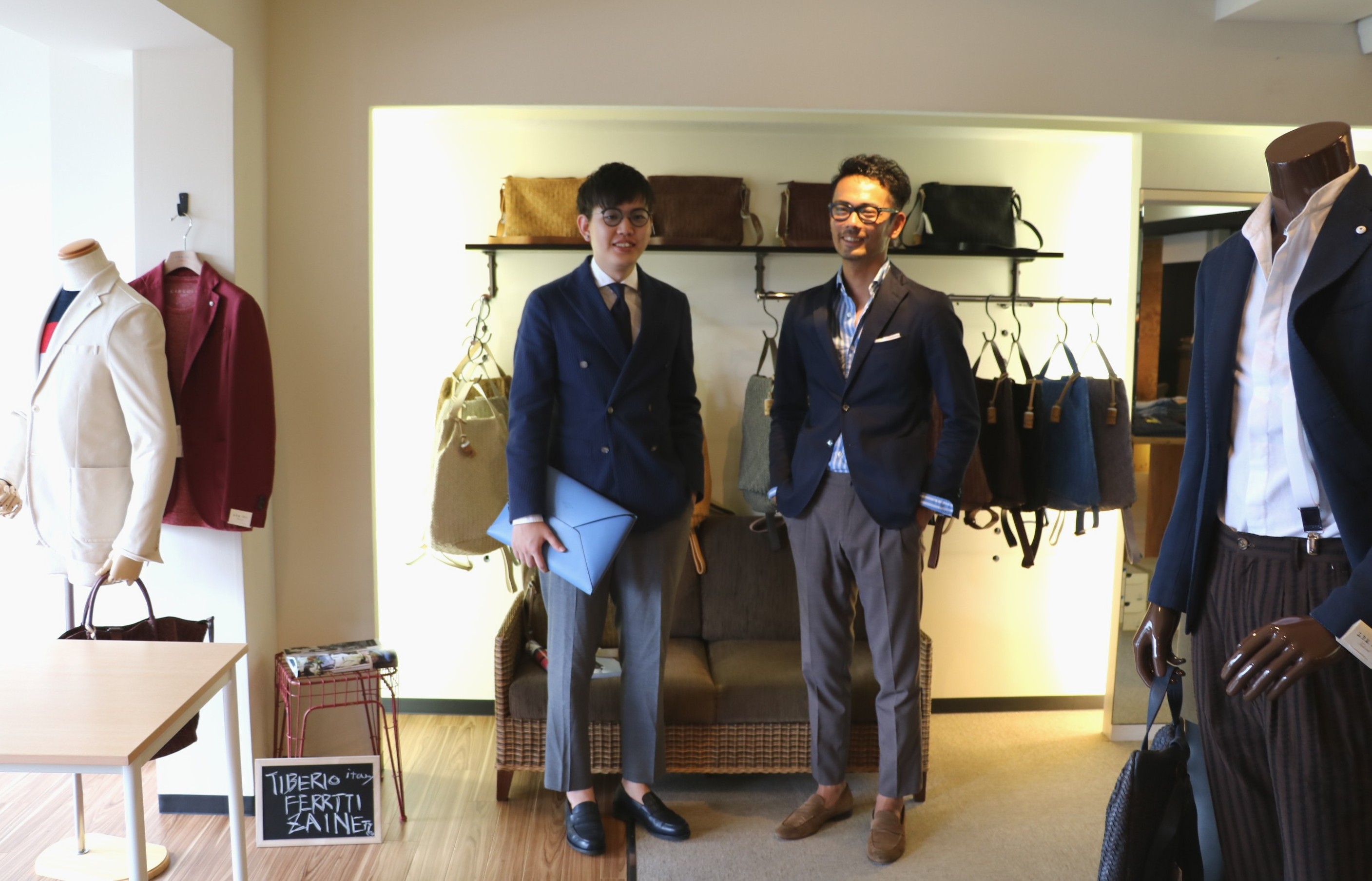 マガジーノの二人の出で立ちです。マスヤマは、ネイビーのジャケットにブルーのストライプ柄シャツ。下半身は、ブラウンのパンツにベージュの靴で合わせ、アズーロ・エ・マローネのお手本的スタイル。ジュニアは、ネイビーのダブルブレストのジャケットを着て、白シャツにネイビーの無地タイを。ボトムはミディアムグレイのパンツで色を抑え、ネイビーのローファーをアクセントにした、青のグラデーションを意識してのスタイリングです。免許皆伝までは、もう一工夫欲しいところですが、お客様をおもてなしするには、このぐらいが丁度いいのです。やり過ぎはいけません。好印象を与える身嗜みとは、無個性ではいけませんが、主張しすぎないことも大事ですね。