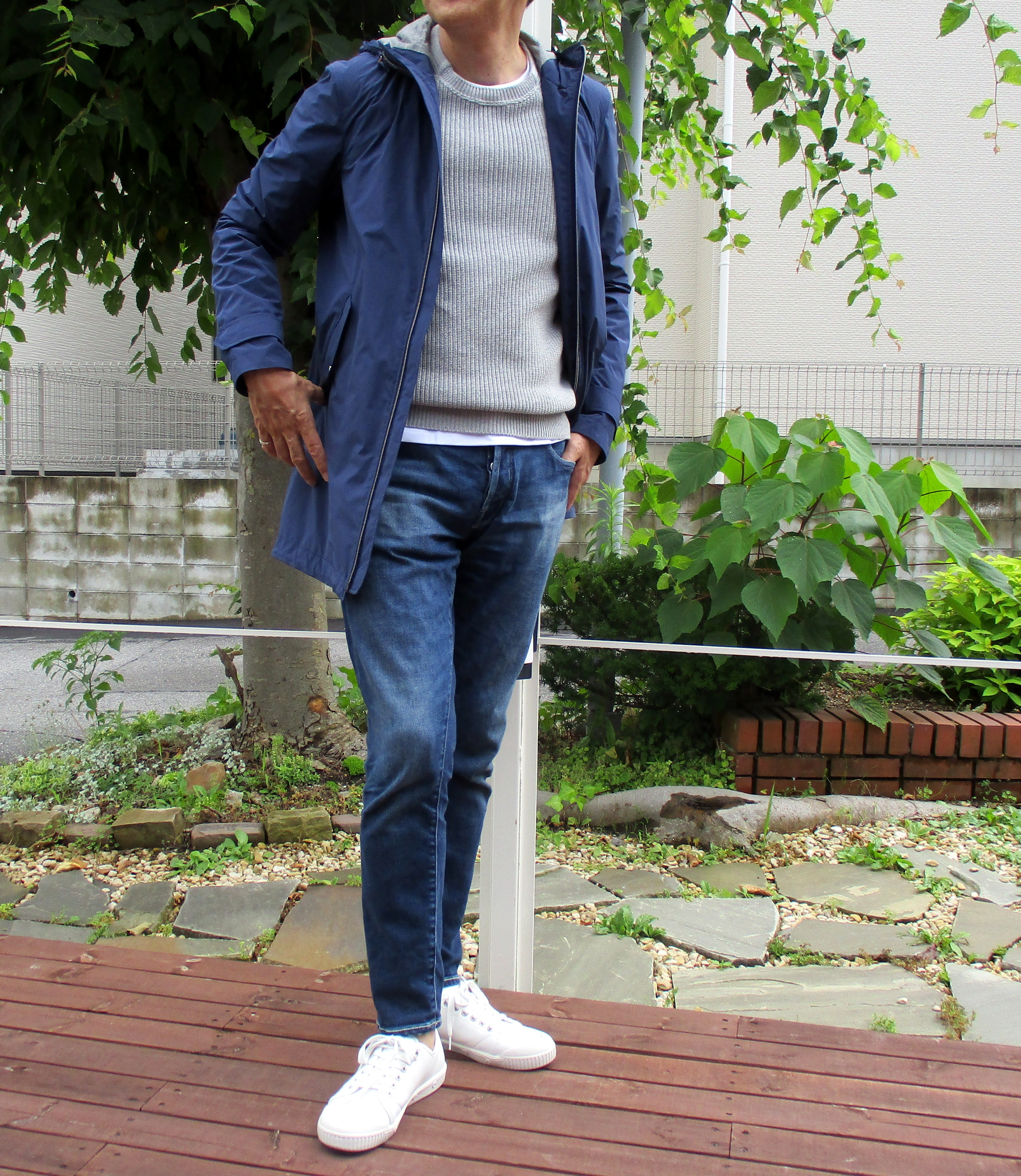 高原で遊ぶなら、こんなスタイルでしょうか。小淵沢や長坂辺りの天気は、ここ岡崎とさほど変わりませんが、標高が上がるほど気温は下がります。特に雨の日は、ある程度の防寒対策は必要になります。そこで選んだのが、HERNO(ヘルノ)のナイロン モッズコート。昨日、コーディネートで合わせていた薄手ダウンベストやLaminarシリーズのパーカーブルゾンも捨て難いのですが、最もカジュアル感のある青の色目と裏地の仕様が決め手となりました。サイズが合われる方なら、「パウダーコーティングのパーカーブルゾン」もお勧めです。