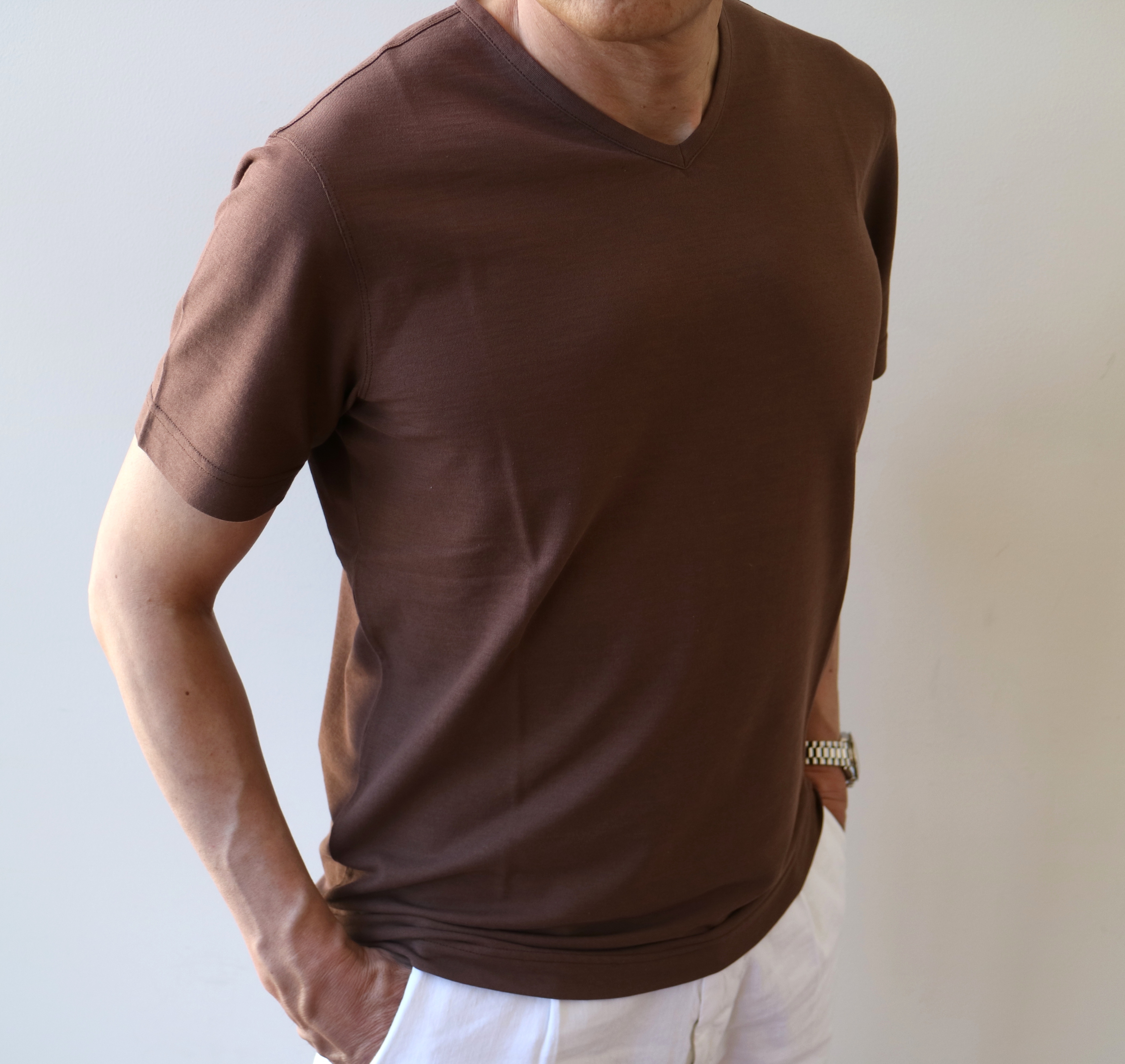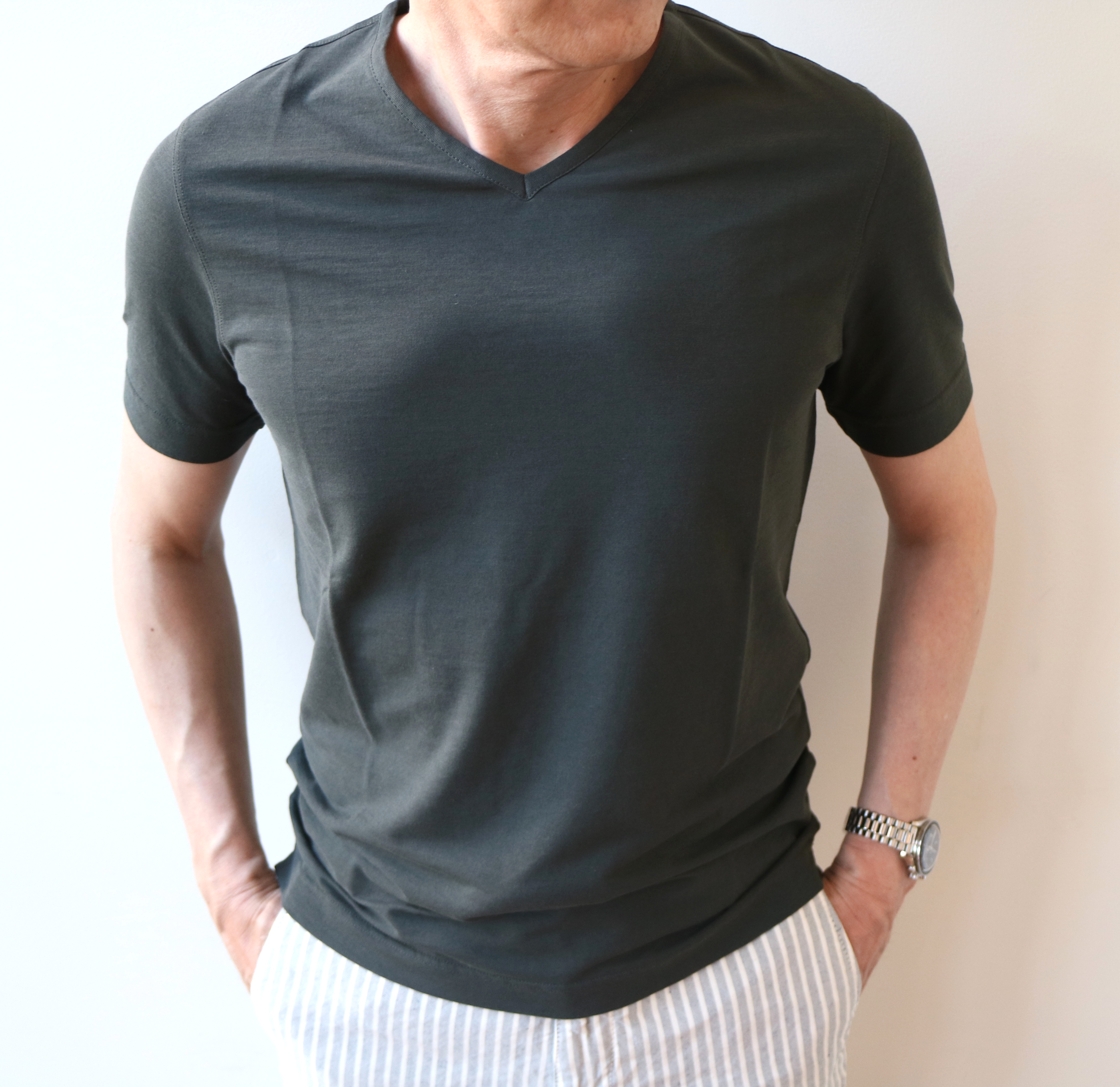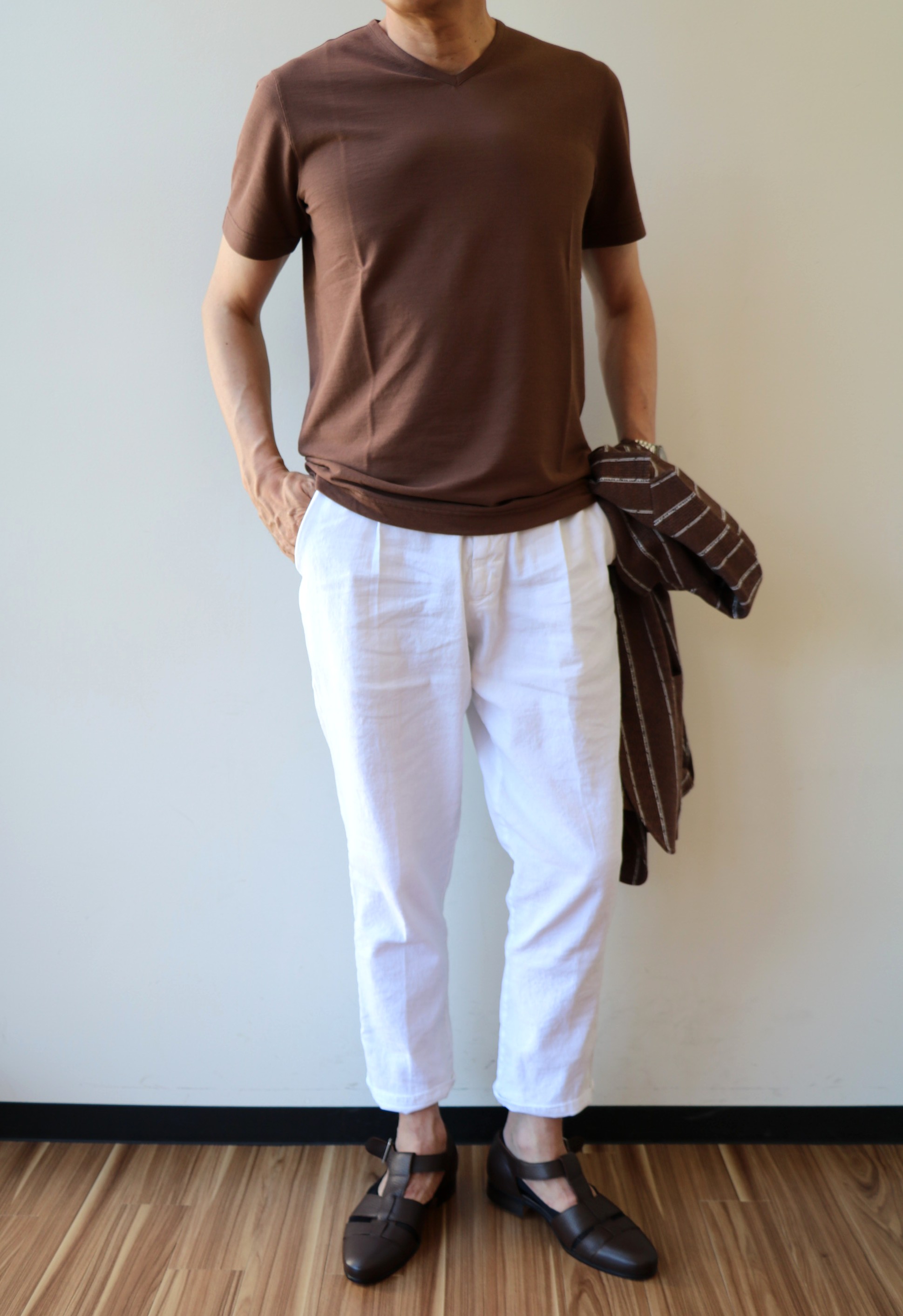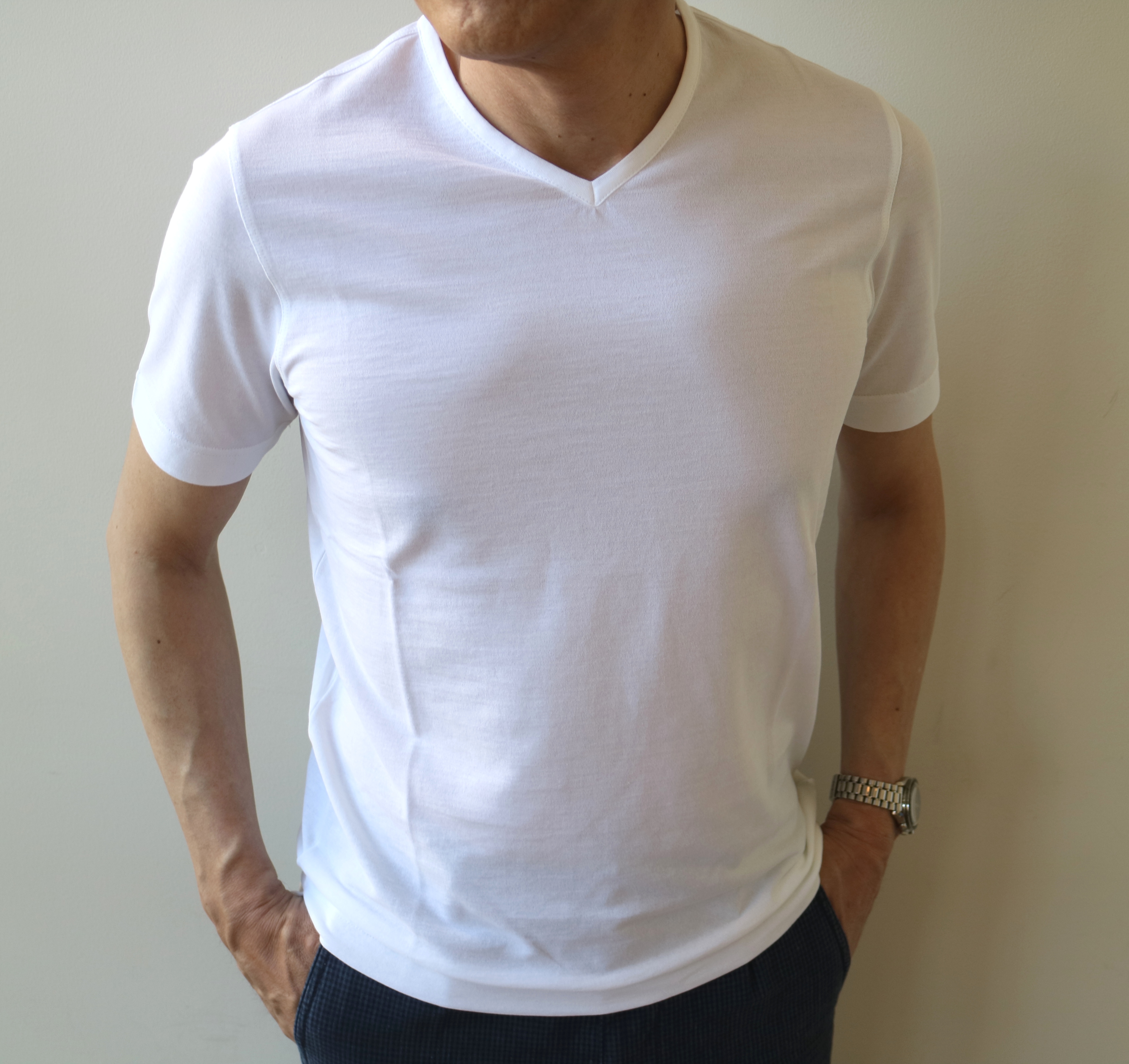 緩いパンツということで、この【ZANONE/ザノーネ】の「浅VネックTシャツ」もワンサイズアップの48で着ております。Vの切れ込みは決して深くはありませんが、この首元の隙間が涼を呼びます。