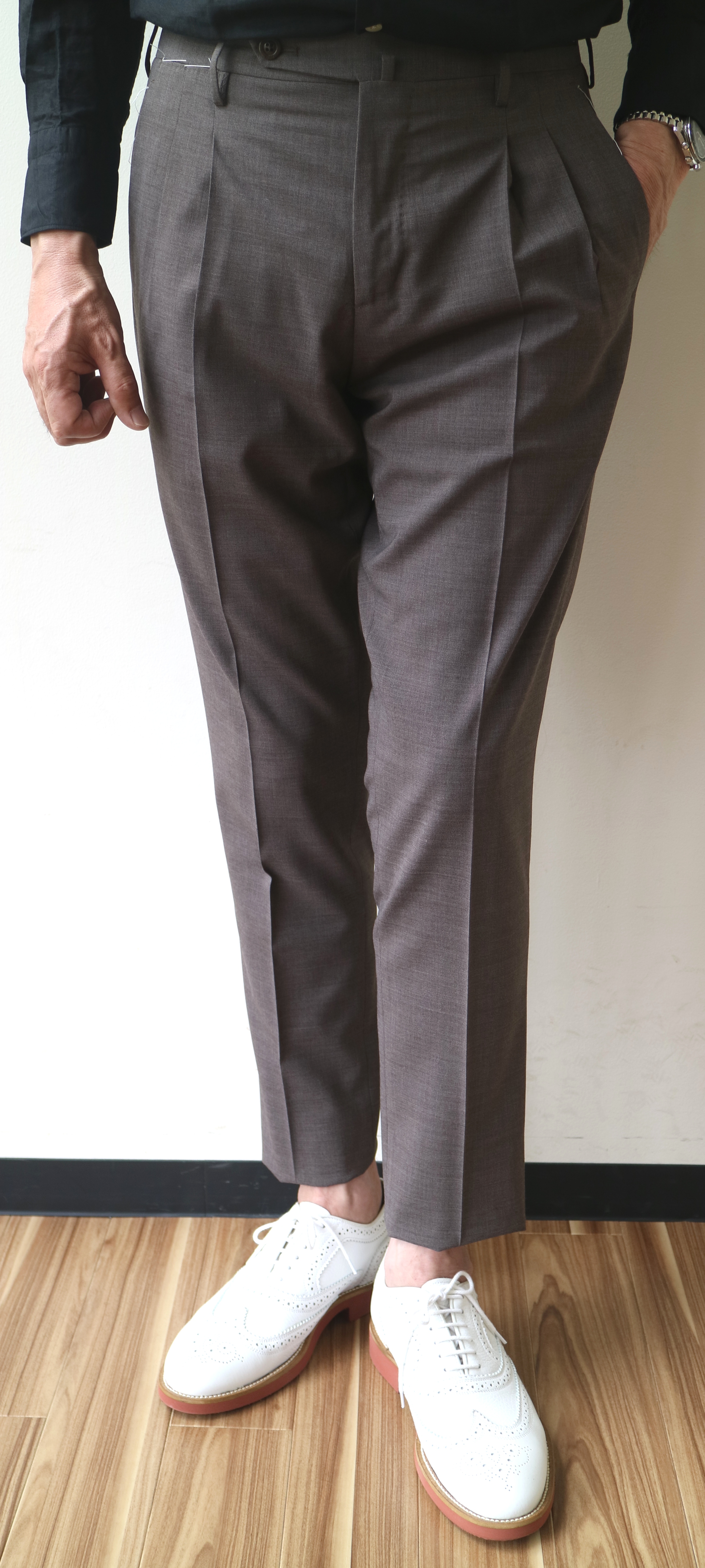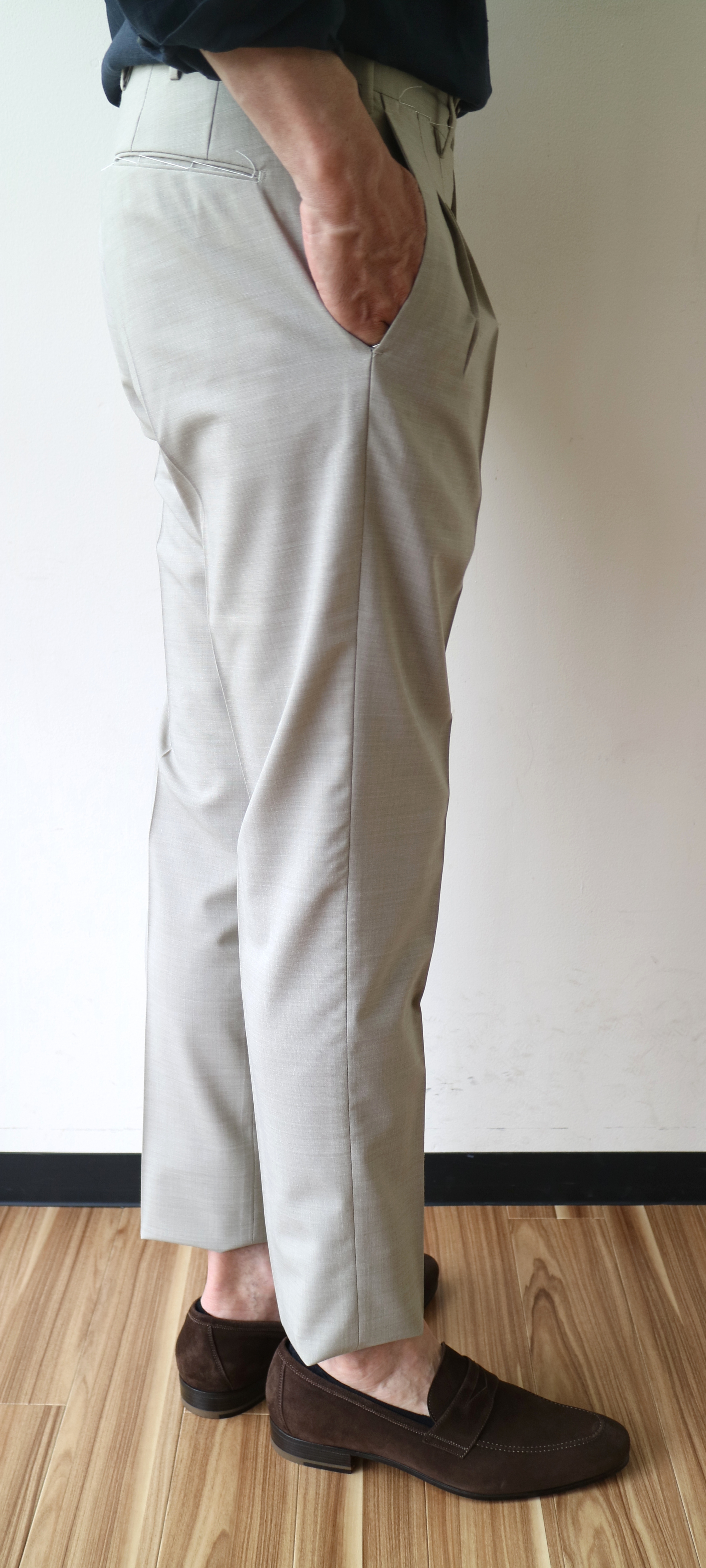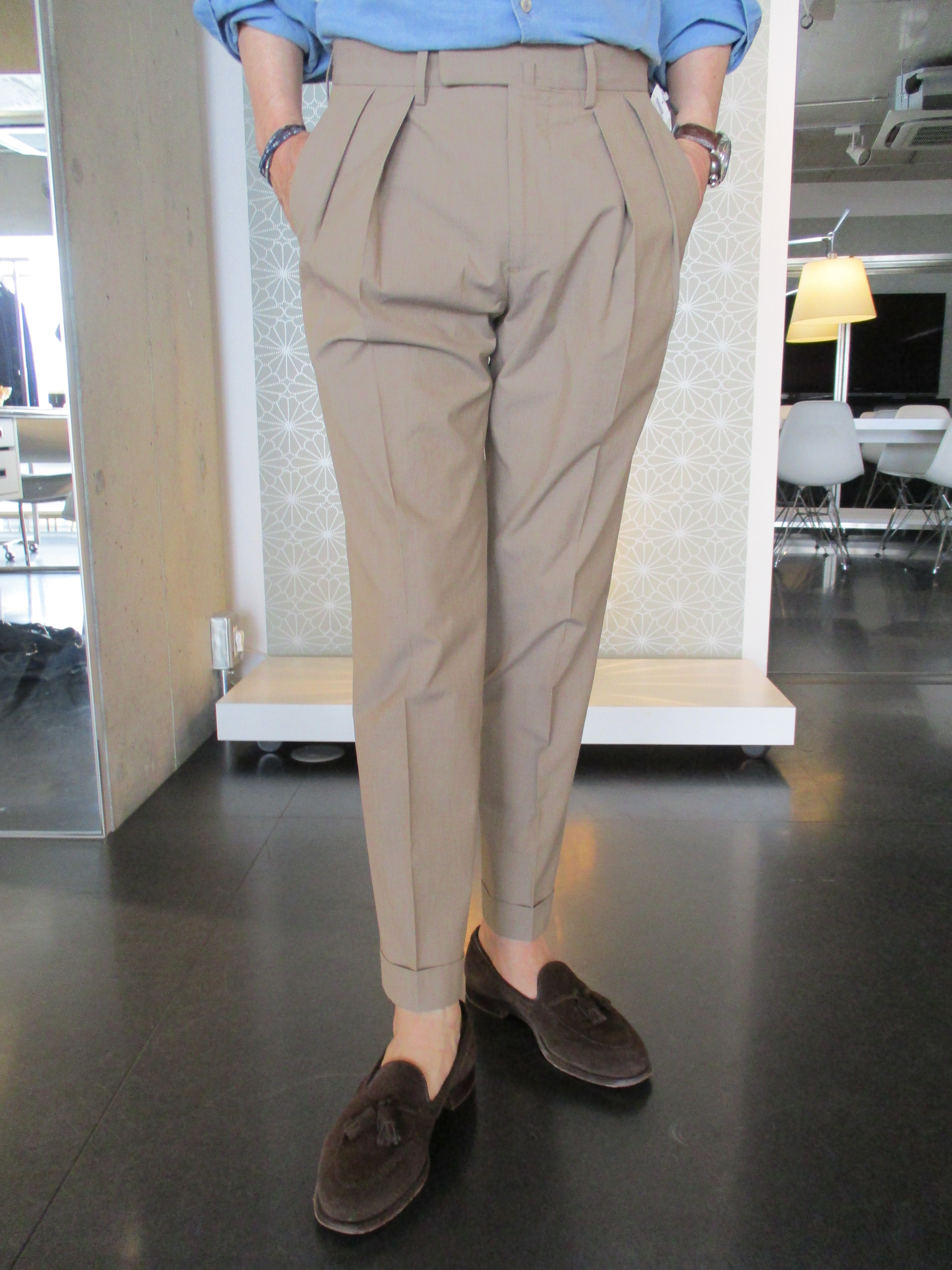 各ブランドでセレクトしたのは機能素材を使ったスポーツミックスなモダンパンツ。ブラックやネイビーの他に来季はグレイ系を意識しております。また、展示会のサンプルの中で目に付いたのが、クリアなベージュパンツ。殆どがプリーツ入りです。上の写真は、INCOTEX(インコテックス)のもの、下はBERWICH(ベルウィッチ)。コットン、ウール、あるいは混紡ものを含め、この手のパンツは気になります。
