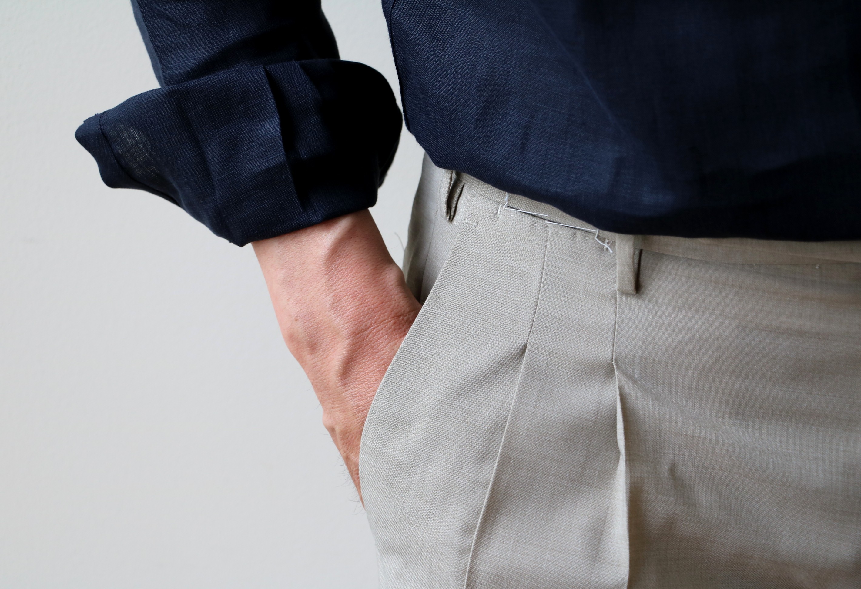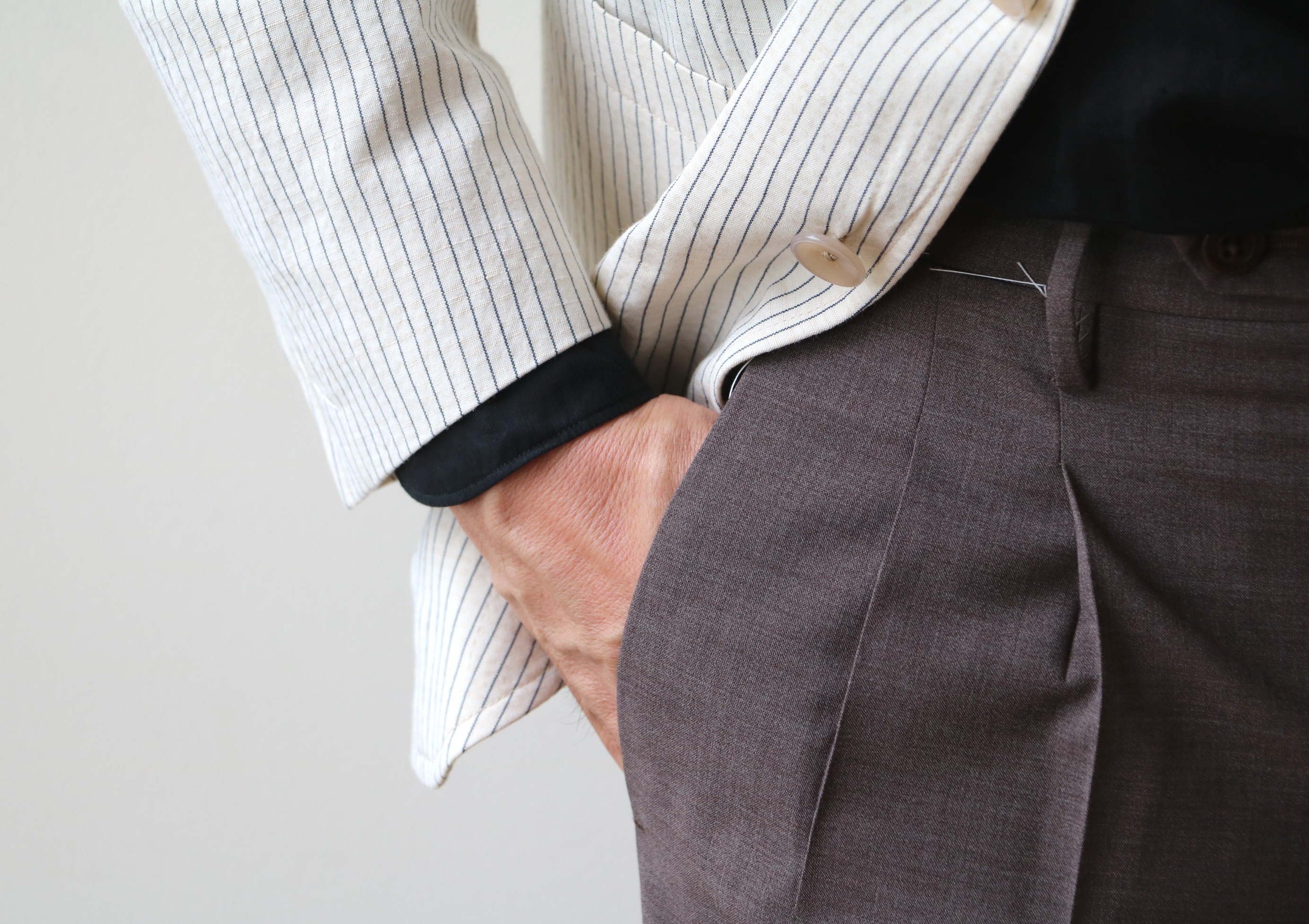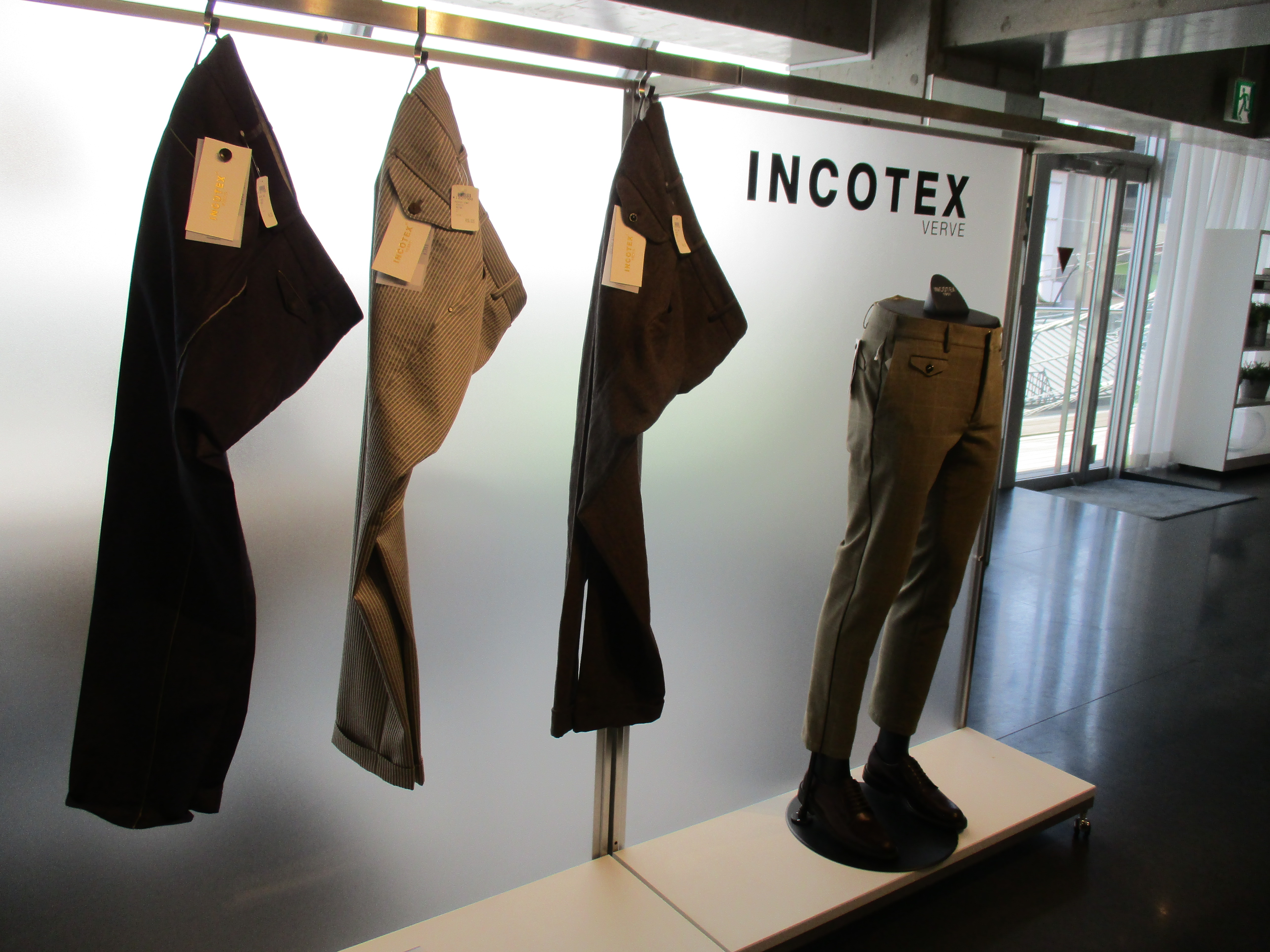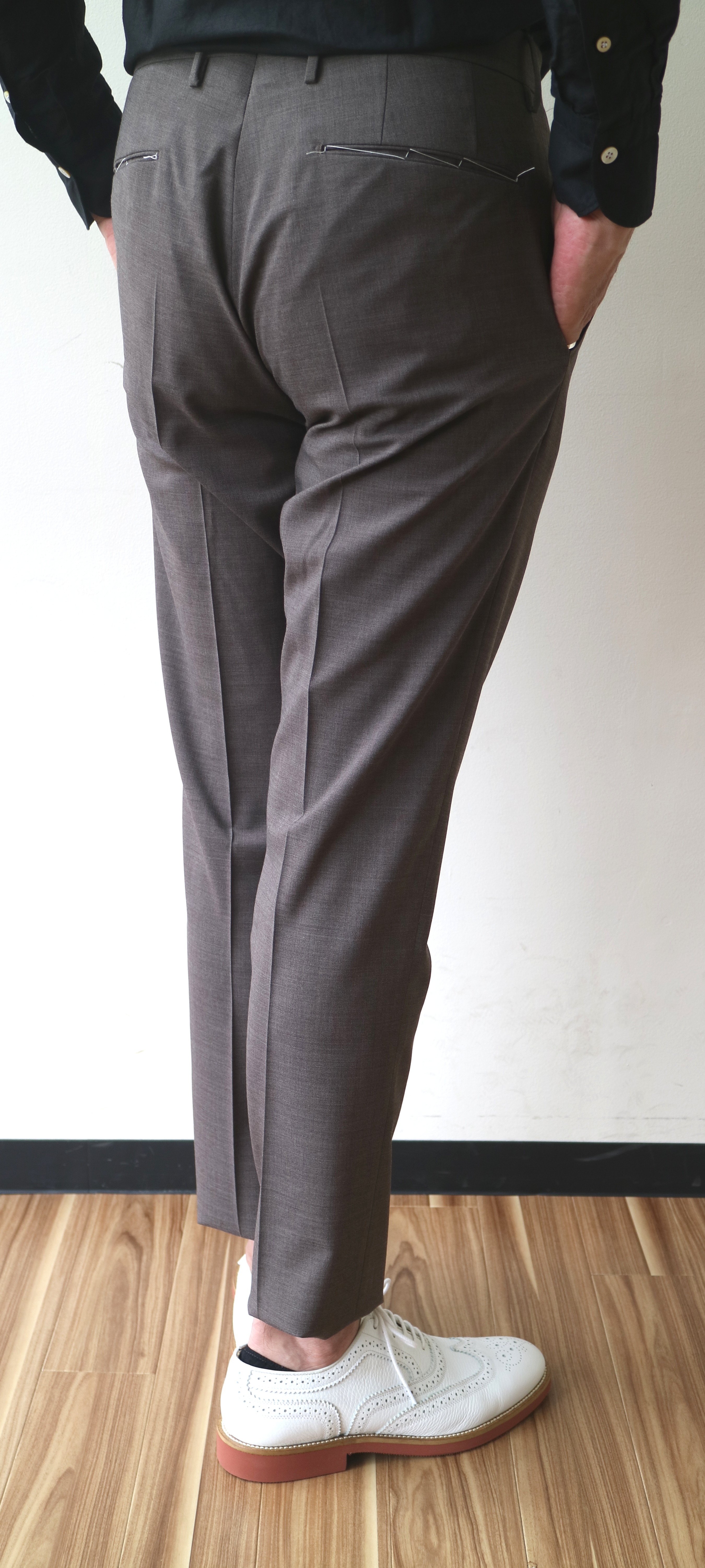 各ブランドでセレクトしたのは機能素材を使ったスポーツミックスなモダンパンツ。ブラックやネイビーの他に来季はグレイ系を意識しております。また、展示会のサンプルの中で目に付いたのが、クリアなベージュパンツ。殆どがプリーツ入りです。上の写真は、INCOTEX(インコテックス)のもの、下はBERWICH(ベルウィッチ)。コットン、ウール、あるいは混紡ものを含め、この手のパンツは気になります。