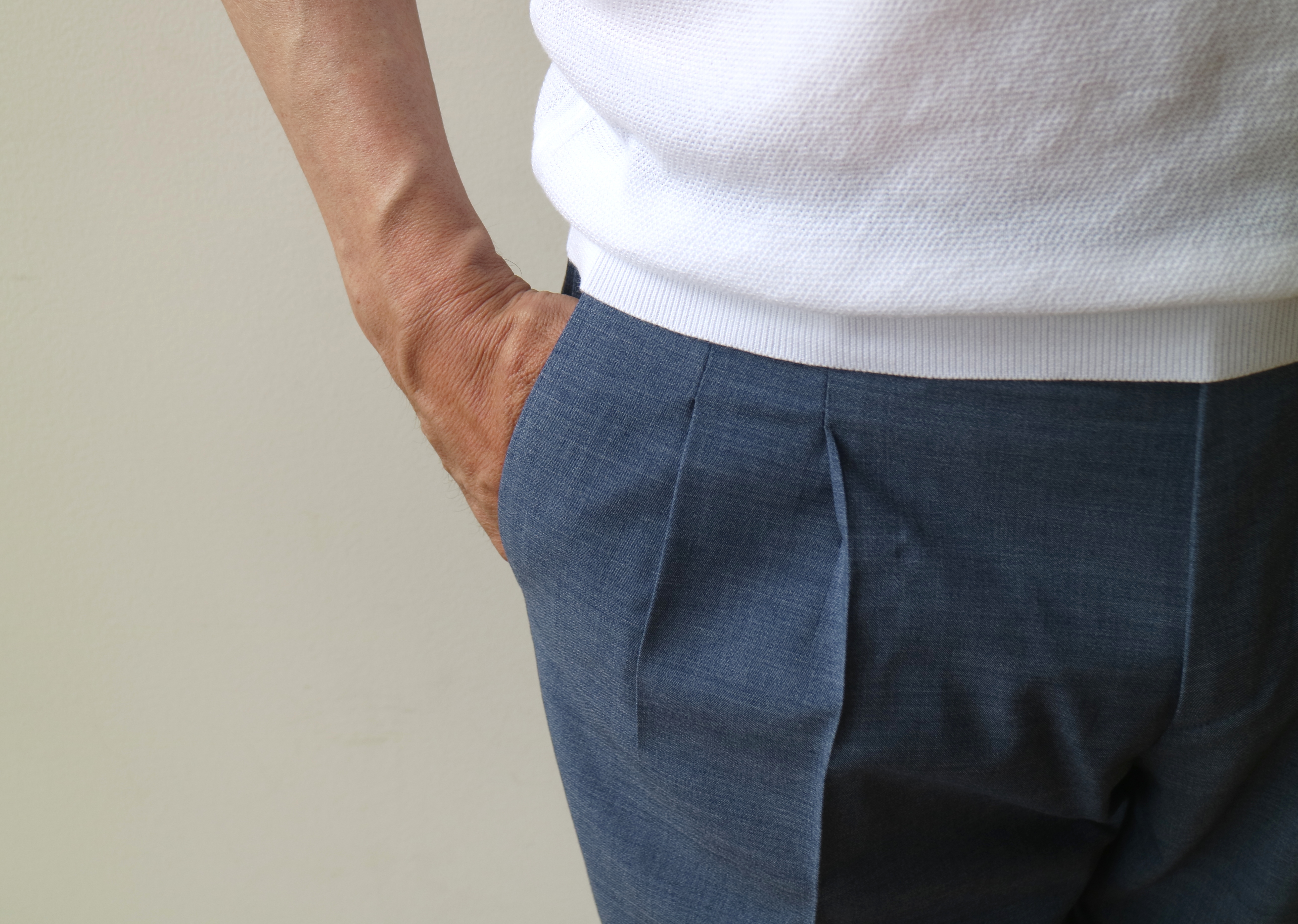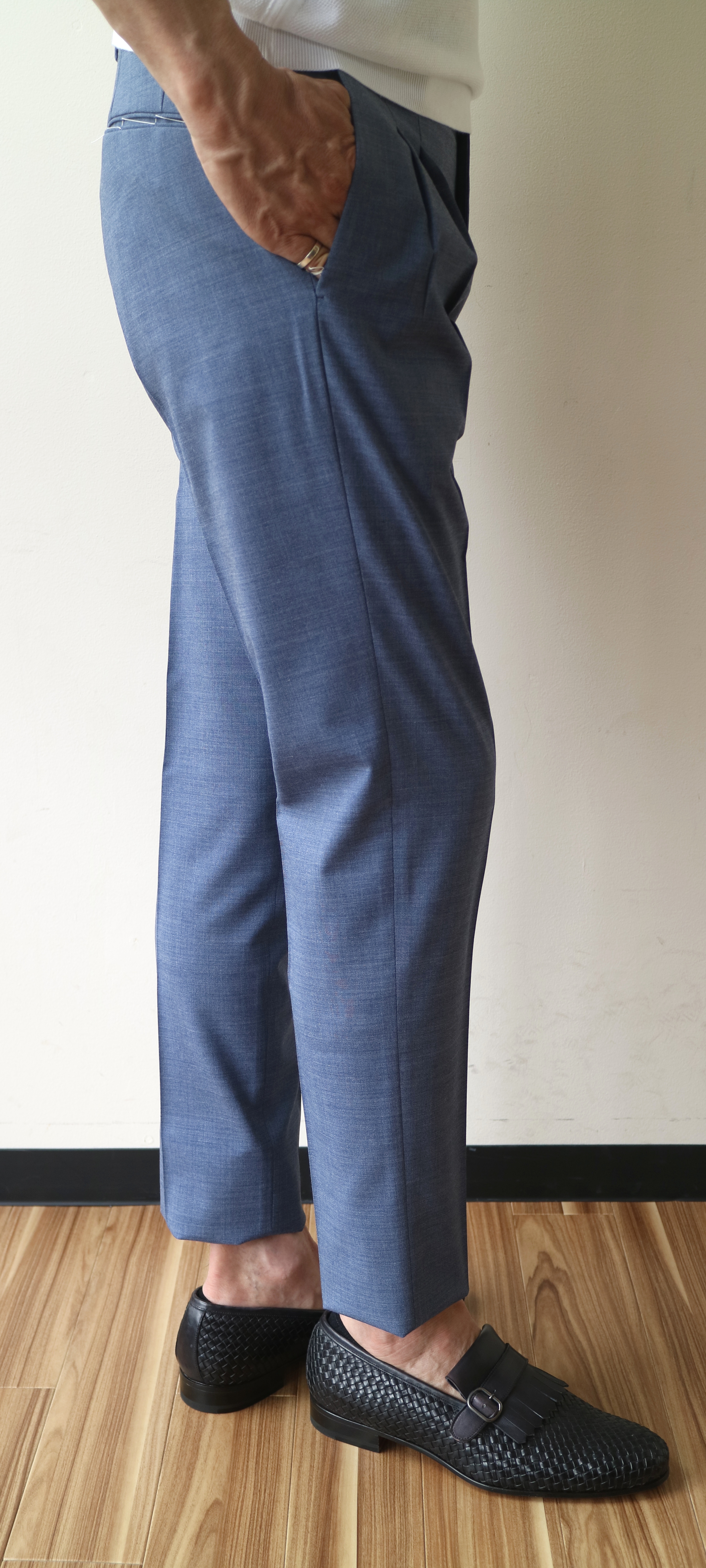 ベージュもよければ、このライトブルーも素敵。爽やかでクリーンな表情に、機能性が加わった夏の最強パンツ...になることは間違いありません!! 合わせたニットは、涼しげなJOHN SMEDLEY(ジョン スメドレー)、靴はFERRANTE(フェランテ)、肩にかけたバッグは未公開のDE.CO.CA(デーコカ)です。