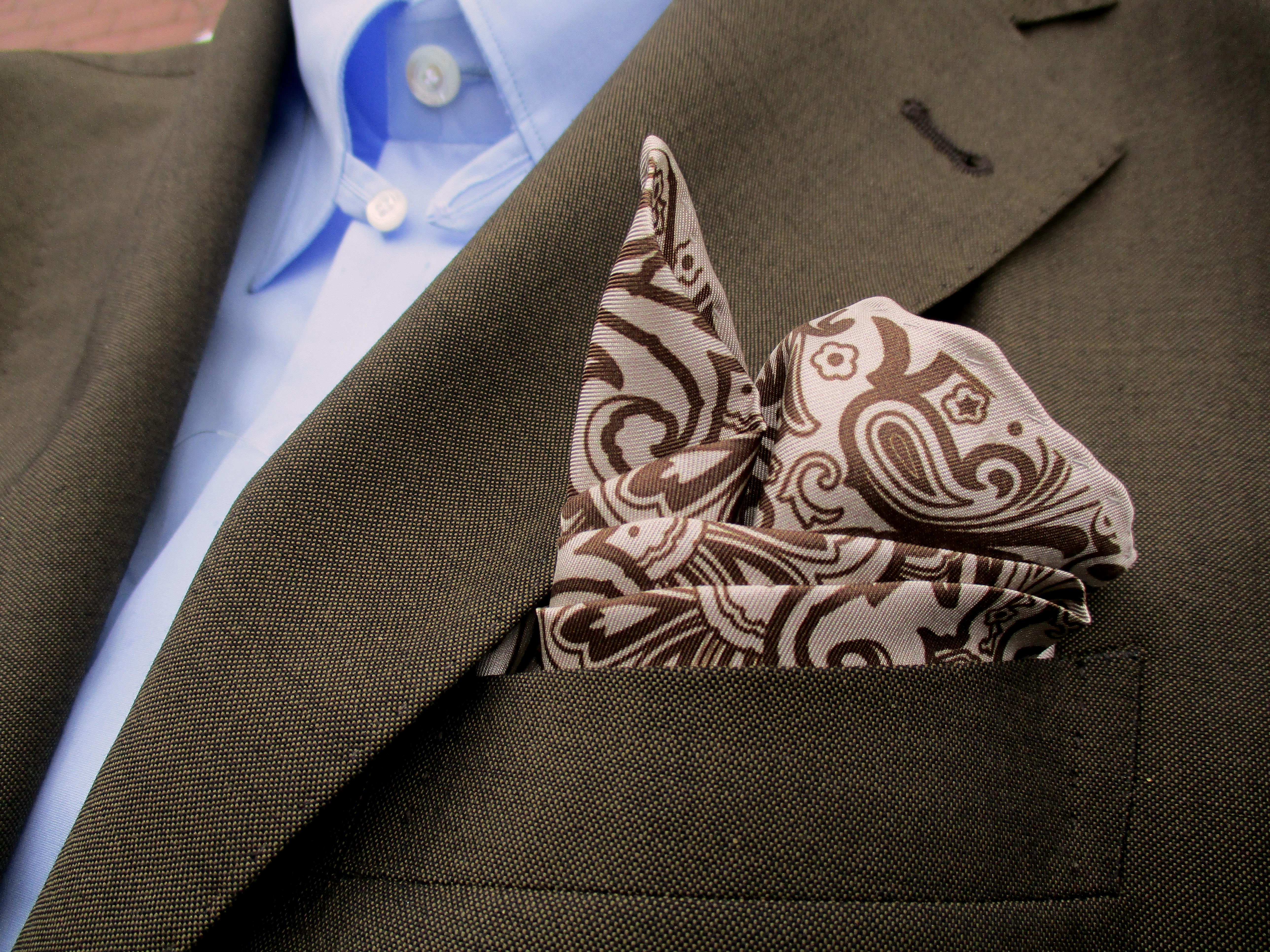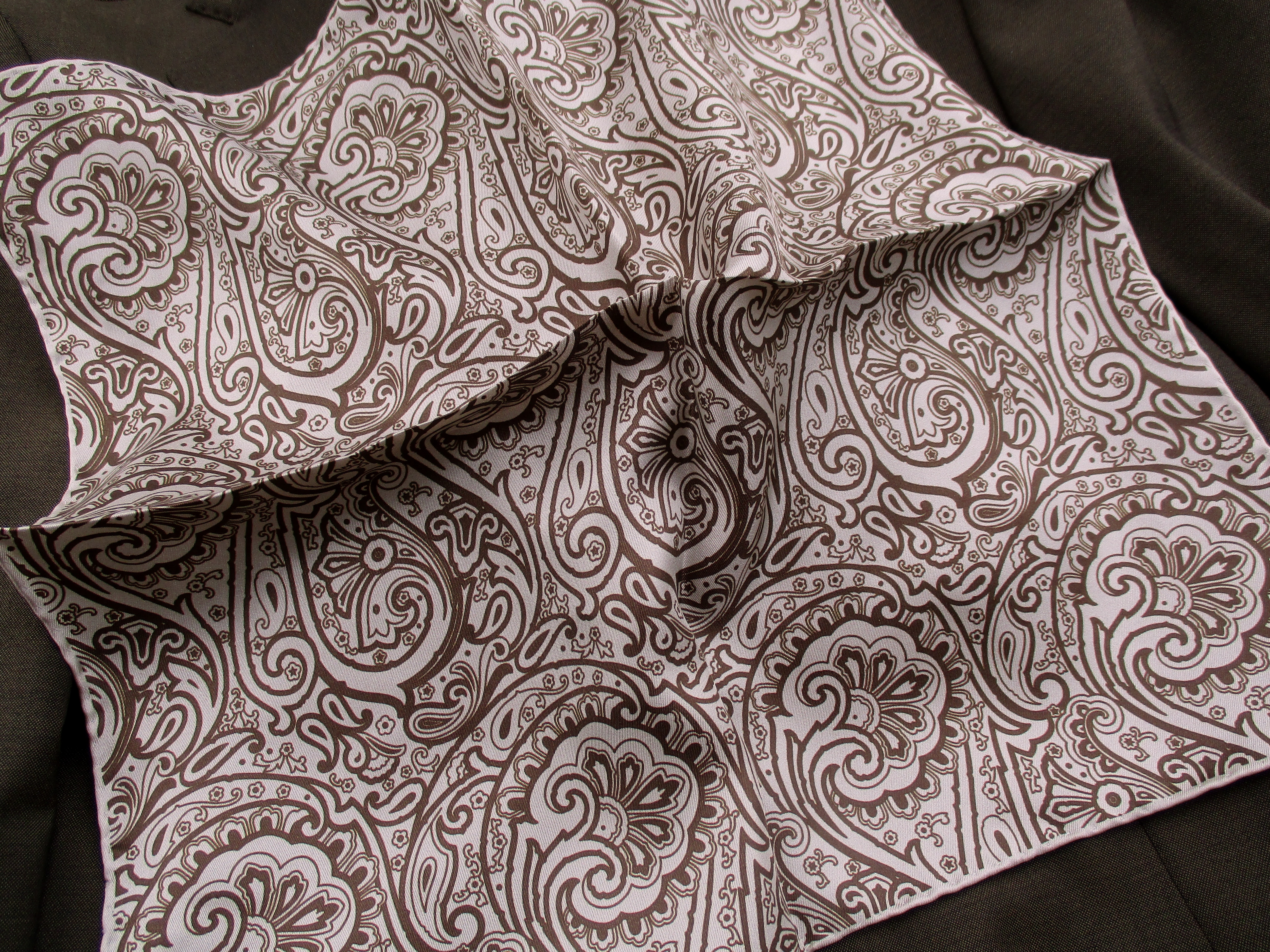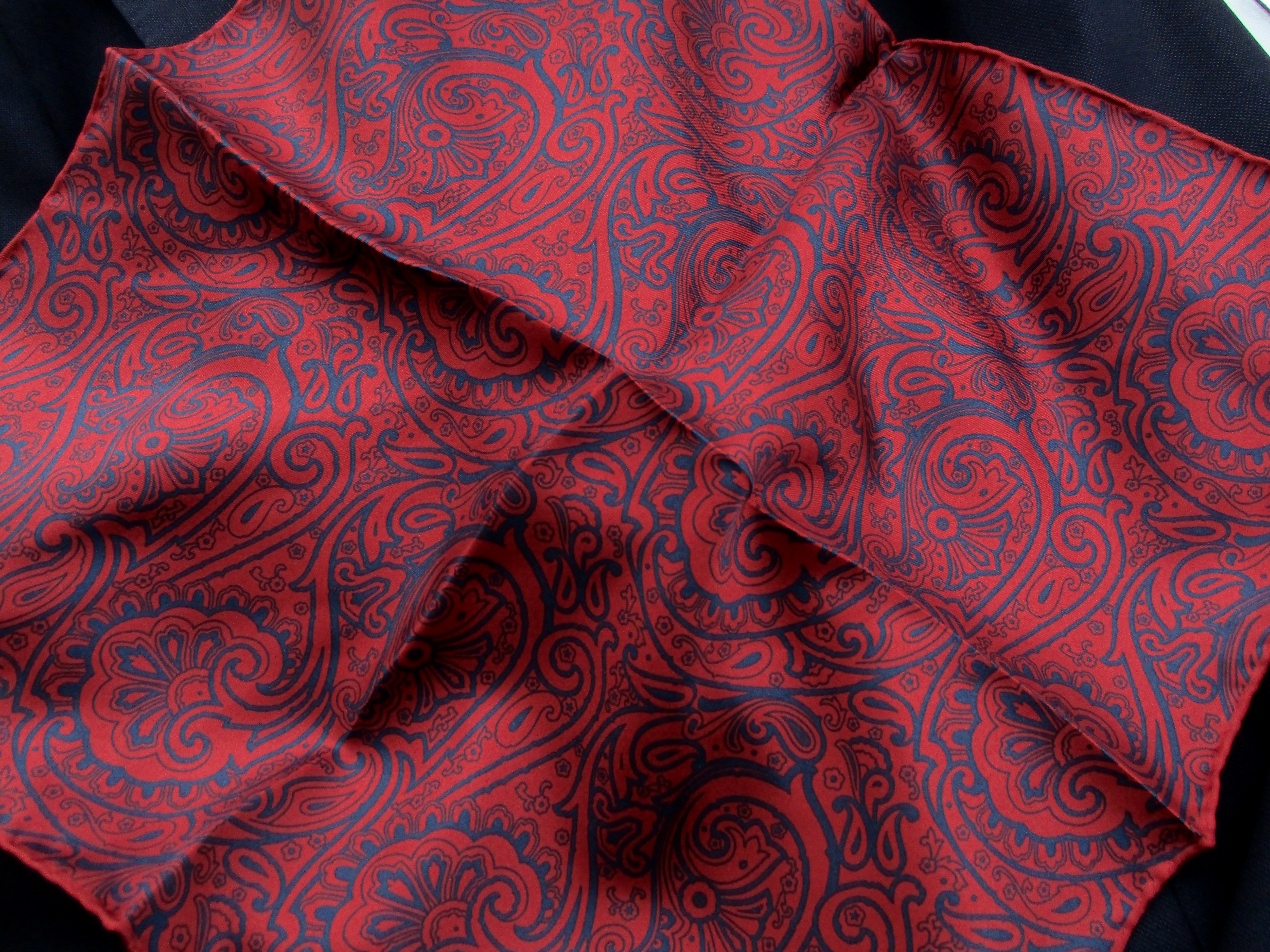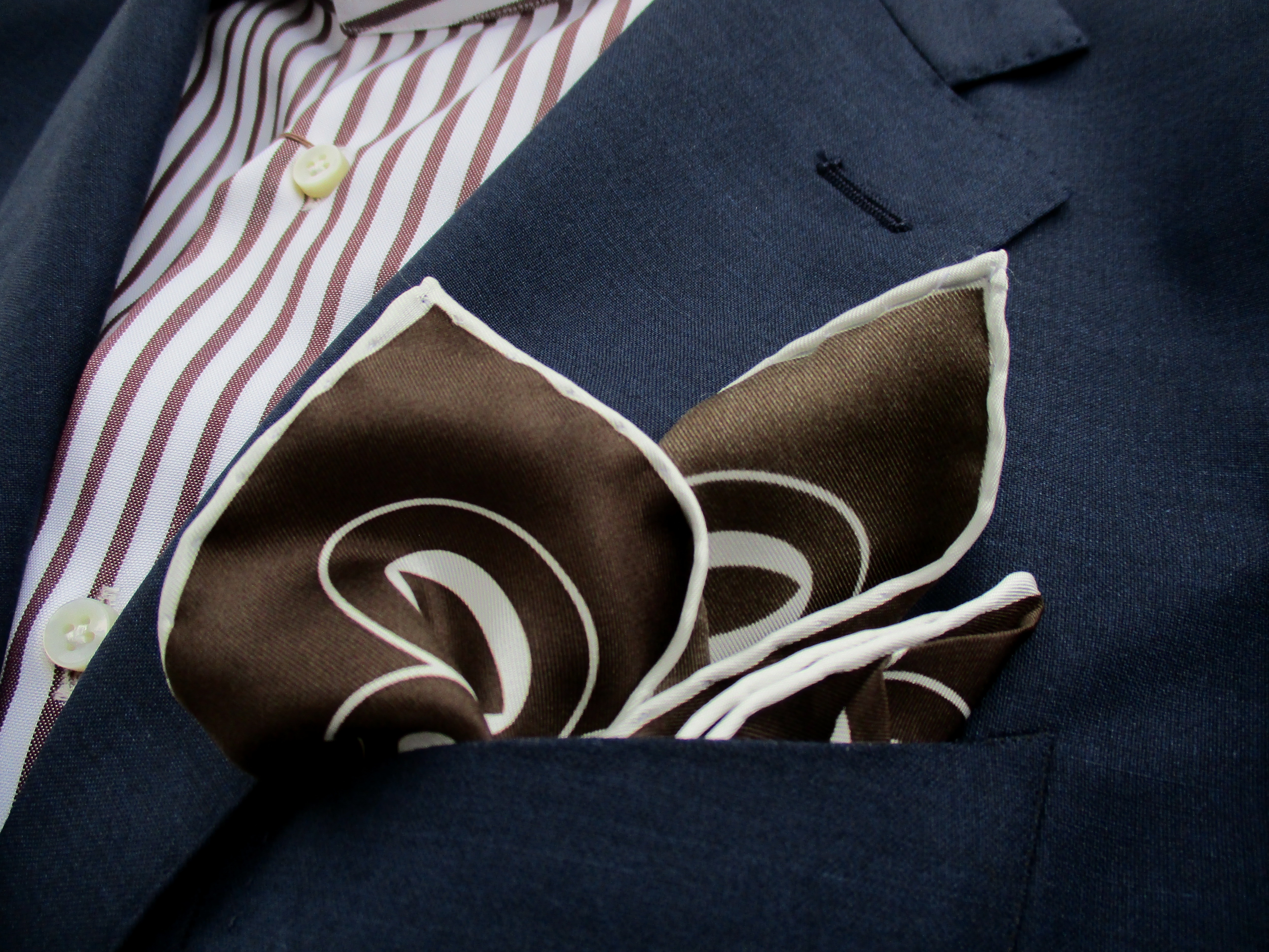 私が挿したものが、こちらのペイズリー柄。色違いでレッド×ネイビーがあります。オフベージュ×ブラウンで合わせたスーツはTAGLIATORE(タリアトーレ)、シャツはFinamore(フィナモレ)。レッド×ネイビーのスーツは THE GIGI(ザ・ジジ)、シャツはBORRIELLO(ボリエッロ)です。