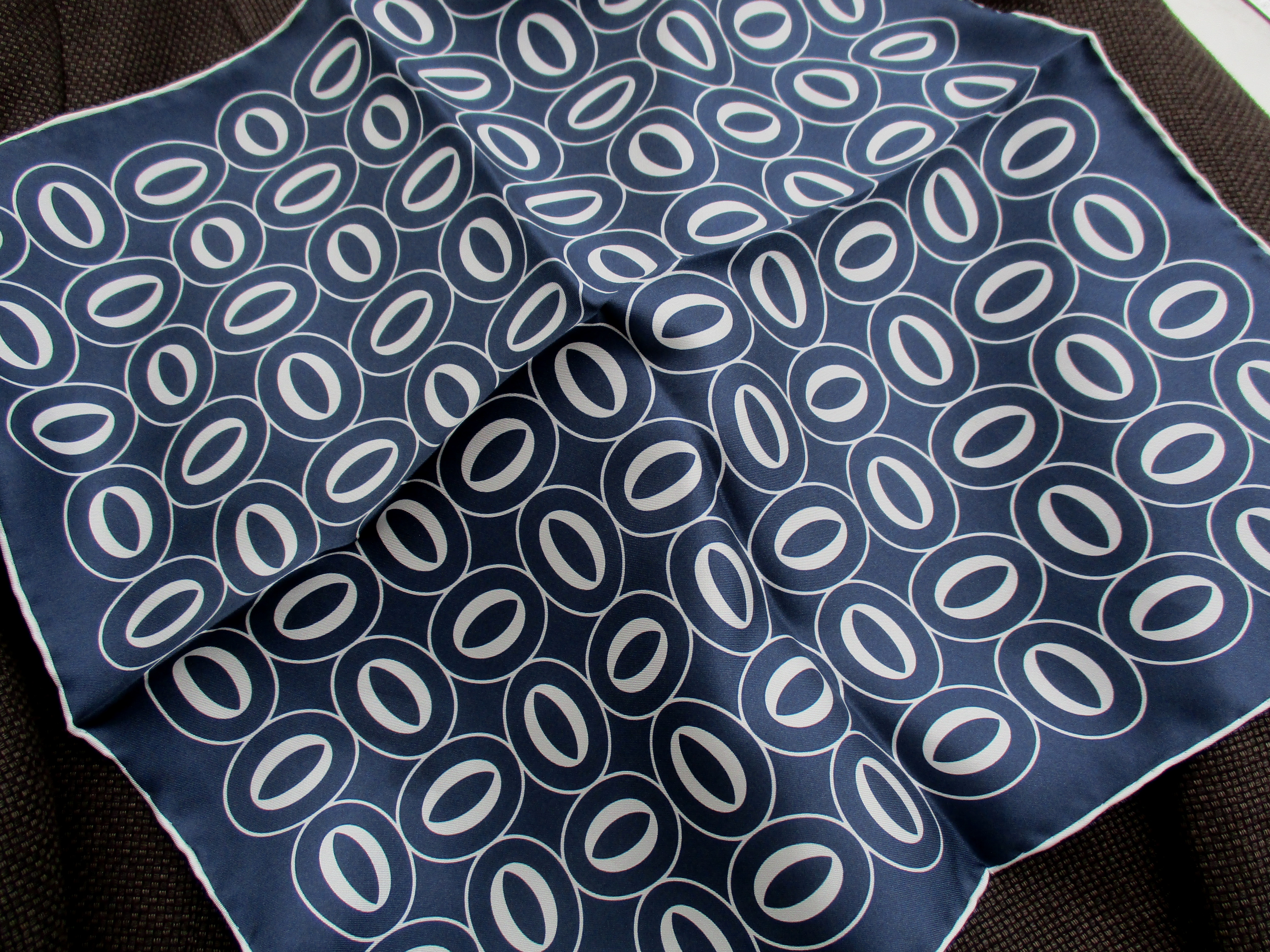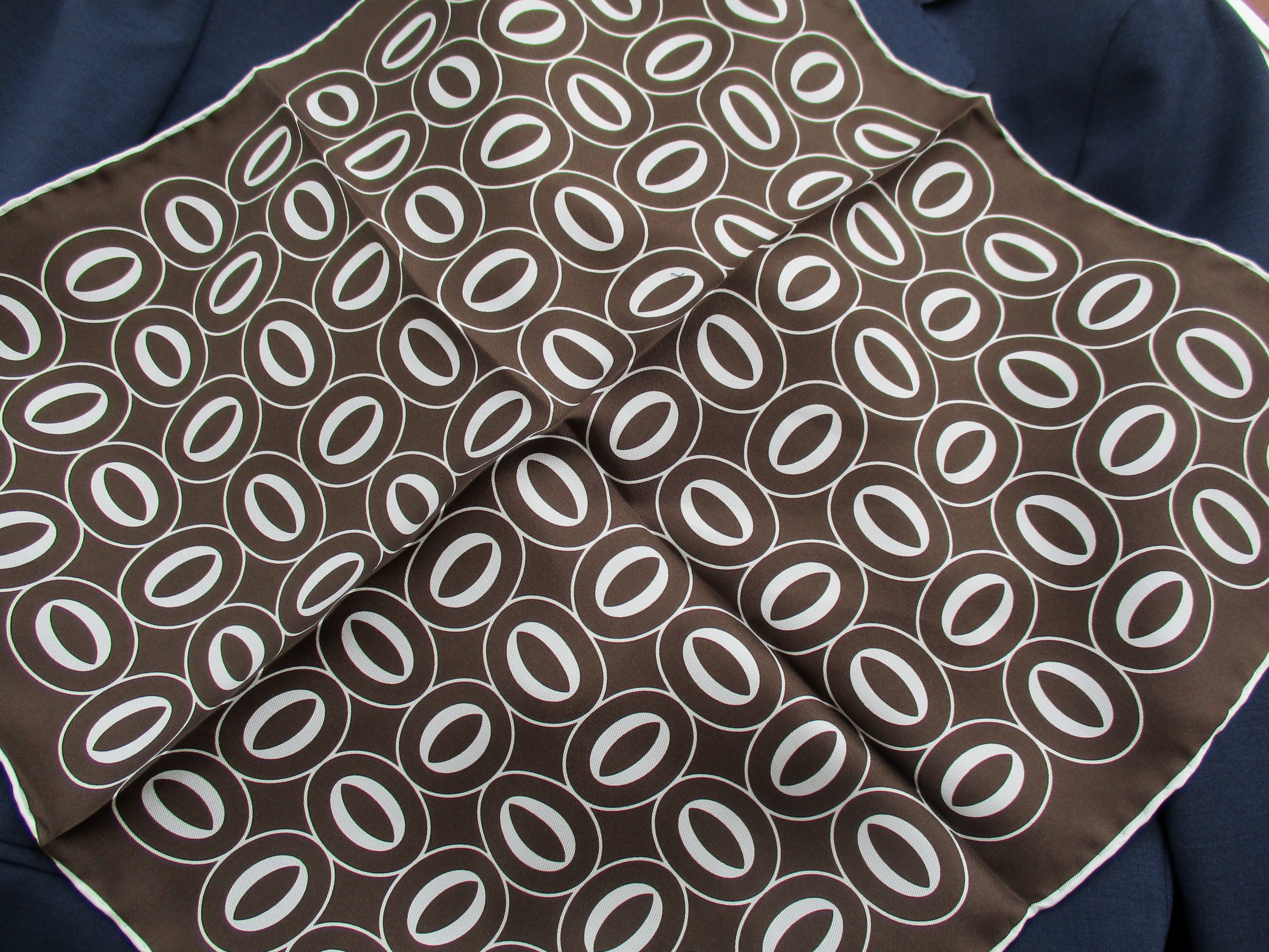 そんな思いで、セレクトしたのは【FRANCO BASSI/フランコ バッシ】のポケットチーフ。私も、本日の出で立ちに挿してみました。全て、38.5cm四方のシルク素材です。