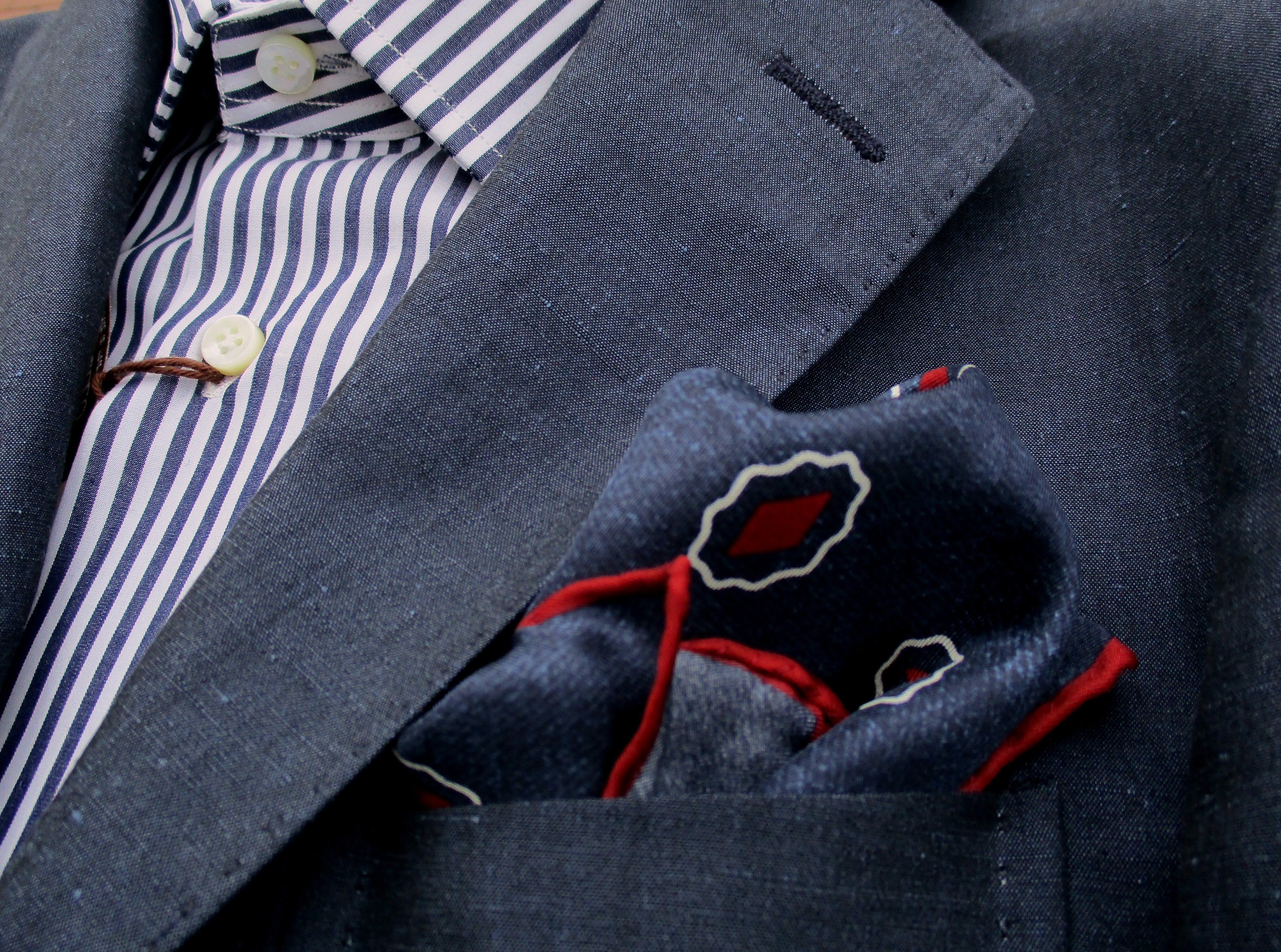 洗いざらしたデニムのようなインディゴブルーに、赤でアクセントを付けた飛び柄のオールオーバー。ラフな印象をもつチーフに合わせたのは、THE GIGI(ザ・ジジ)のスーツ。ネイビーのロンドンストライプ柄シャツはBORRIELLO(ボリエッロ)です。