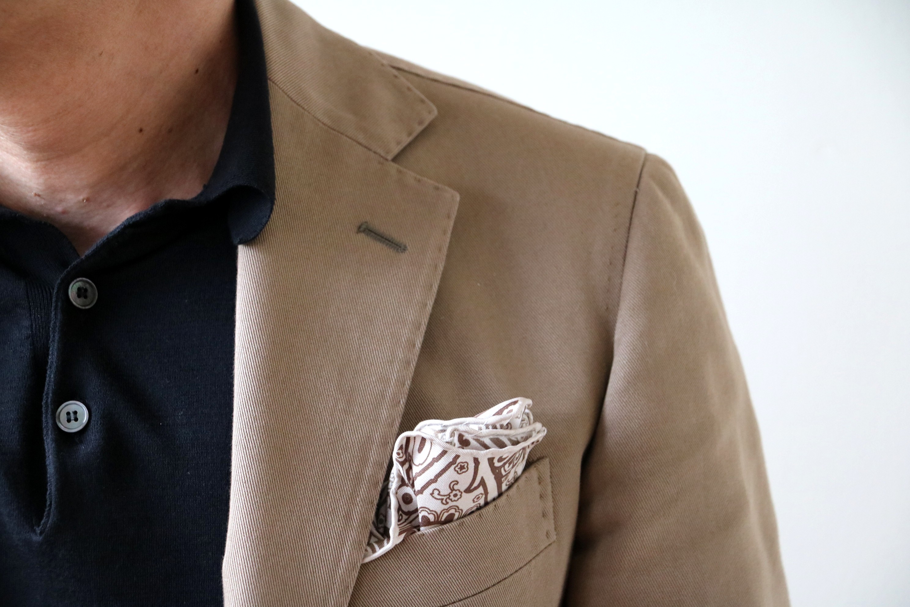おめでたい場所以外で挿してはならないのが、ポケットチーフ。例外があるとすれば、女性を口説くとき。昔、ある服飾評論家が話されていたことです。男のバッグは、ご主人を待つ愛犬のごとく足元に置くべきという暗黙のルール同様、影響力のある方の説だけに忠実に守ってきました。過去形なのは...、確かにネクタイをして、更にポケットチーフを加えるのは、足し算より引き算が好きな私にとって、華美すぎるように思えます。ただ、最近、事情が違ってきたのは、ネクタイをしない風潮。ビジネスシーンでのチーフ挿しはタブーにしろ、アフター5の飲み会や誕生日などの記念日など、ネクタイをしないなら、ポケットチーフぐらいは挿したい...