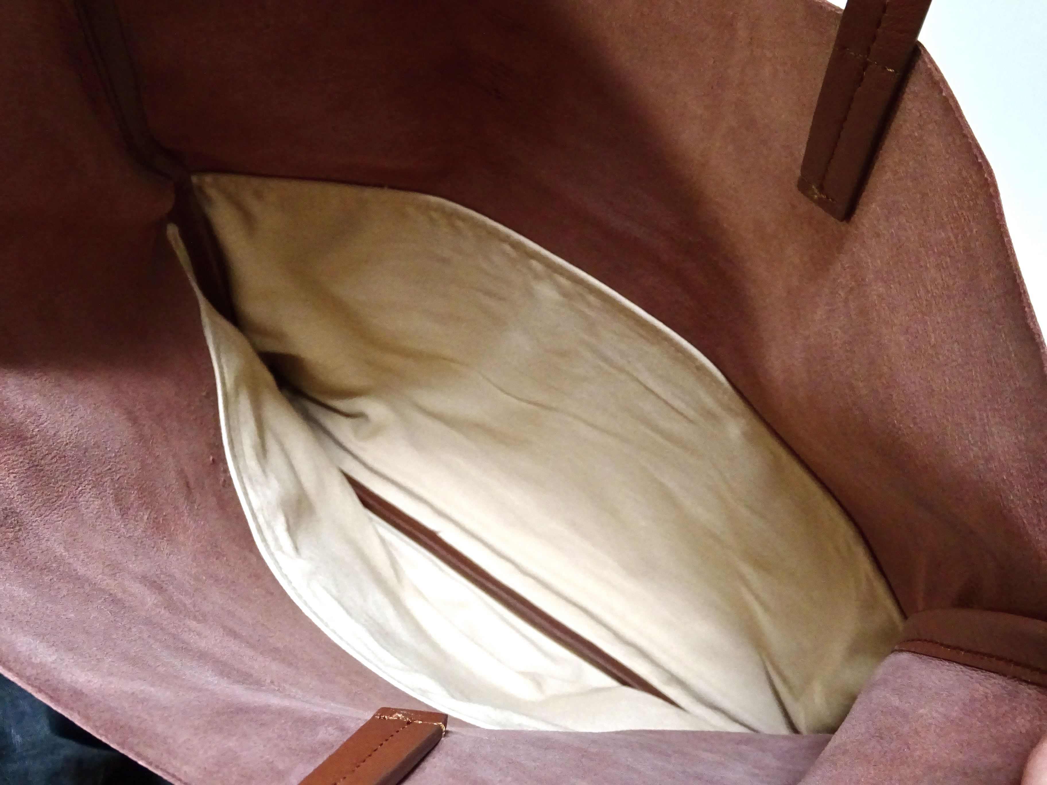 その【DÉ.CO.CA/デーコカ】のファーストシーズンで登場したのが、薄くスライスされた牛革を裏地無しで仕立てた柔らかくて軽いトートバッグ。トートバッグと言いつつ斜め掛けをしておりますが、斜め掛けができるショルダーベルトが付いた二刀流です(ショルダーベルトは最長に伸ばした状態です)。