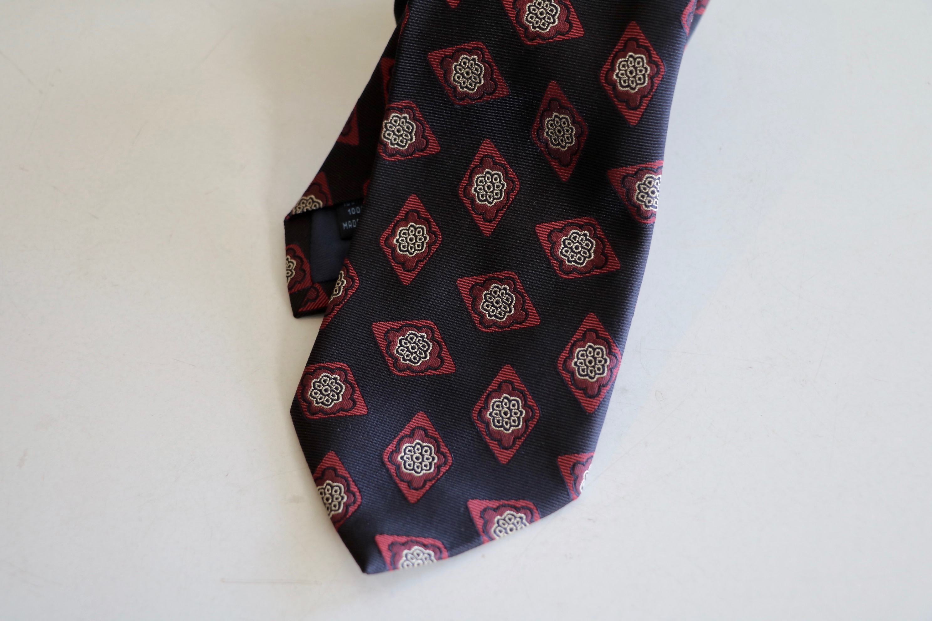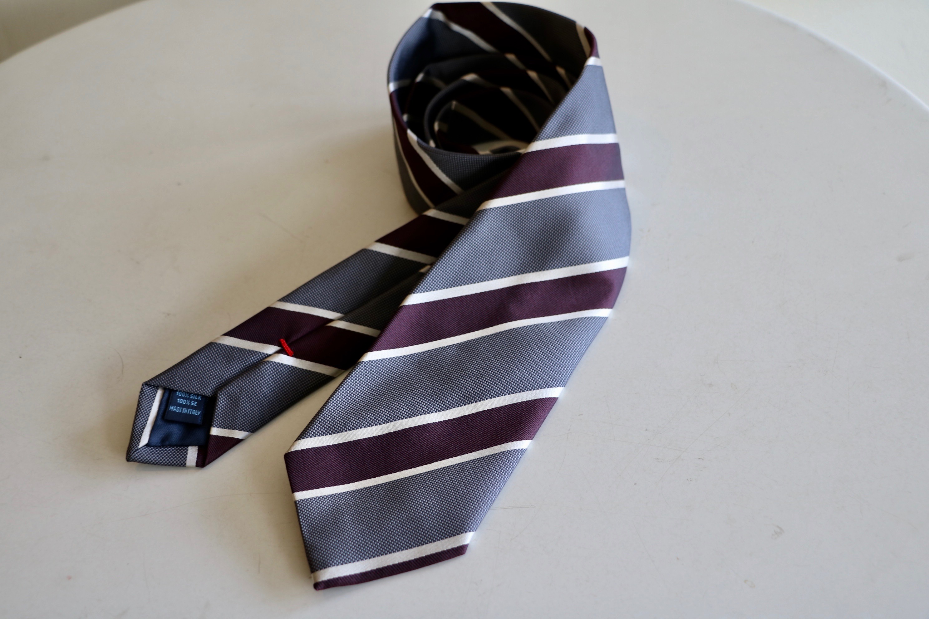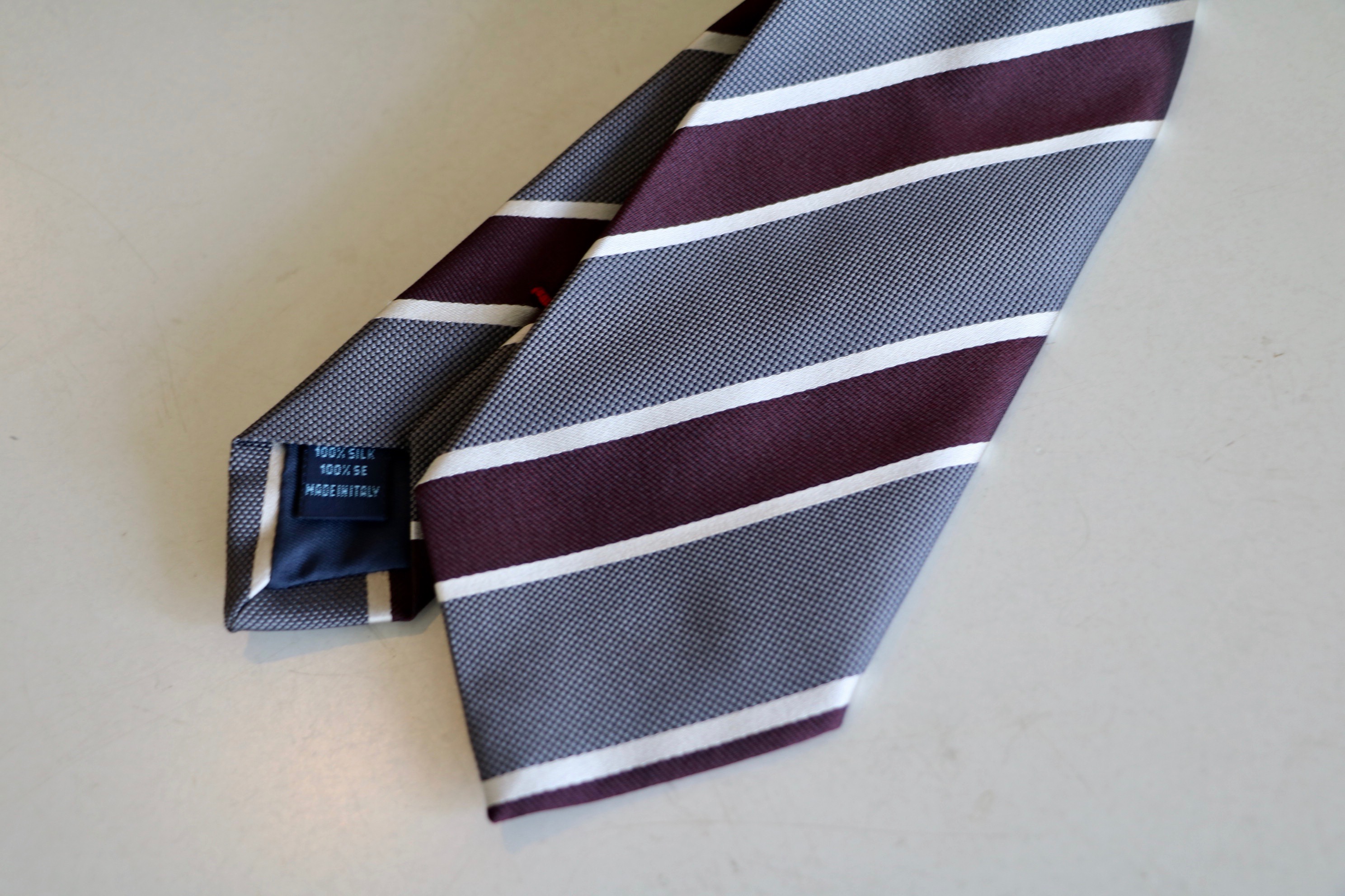 グレイとマルーンの間にシルバーホワイトを配することで、それぞれの色が生き生きしてきます。とても上品な色合いのネクタイです。