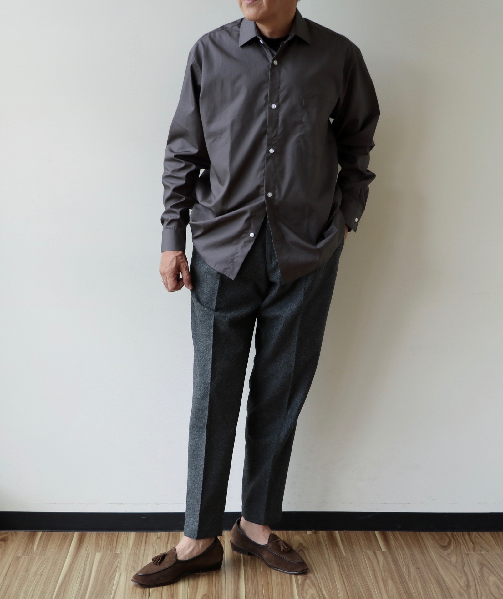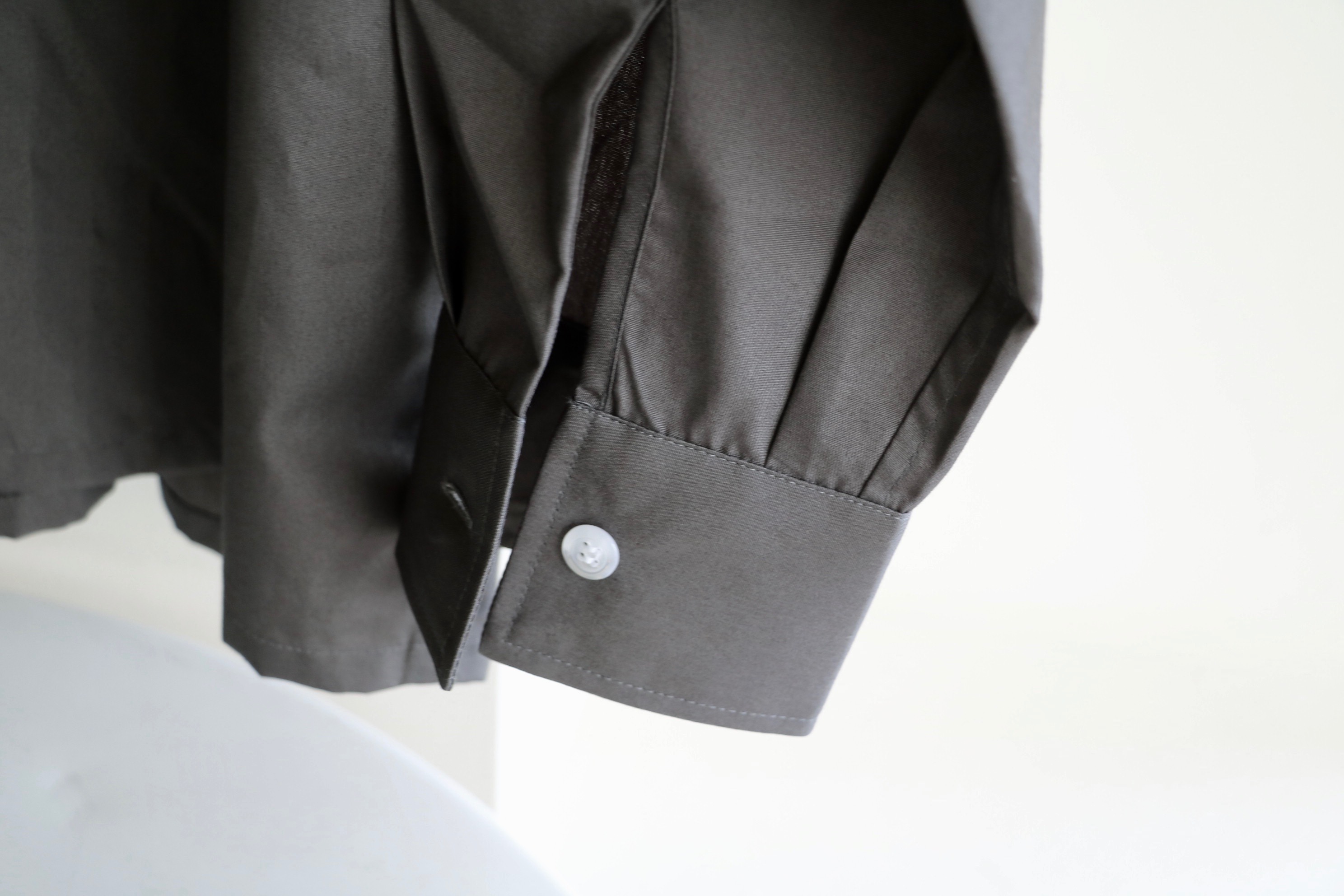 素材は、細番手のコットンポプリン。美しい光沢と、ストレッチ素材が入らなくても、非常にしなやかで弾力性のある生地です。セレクトカラーは、季節によって吹く方向を変える風のように見る角度、光の環境によって見え方が変わるグリーンのようなブラウンのようなグレイと、わかりやすいブラックの2色です。ただ、日が沈みデスクの横で見ている色は、確かにグレイ。まるで季節風のような色合いです。