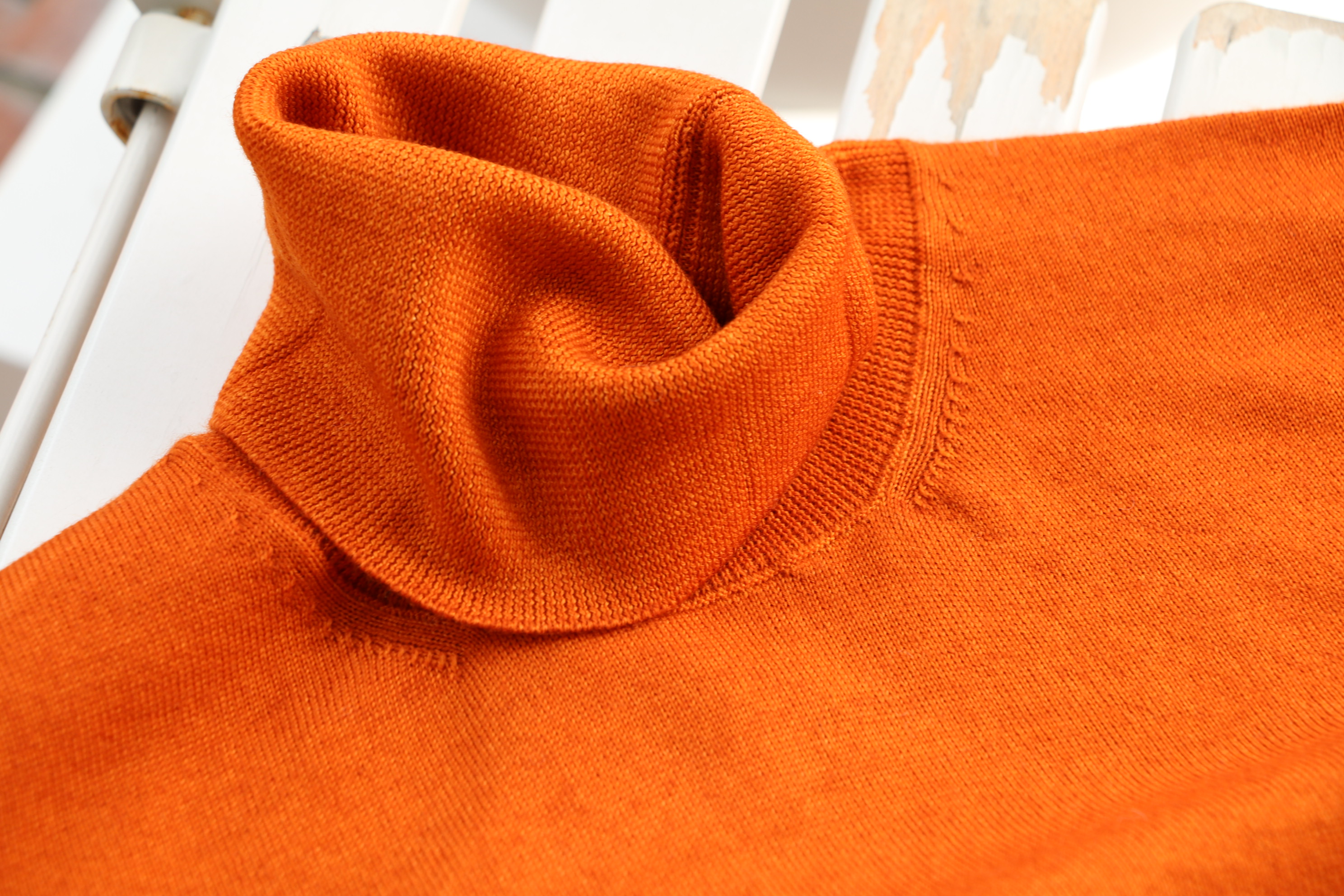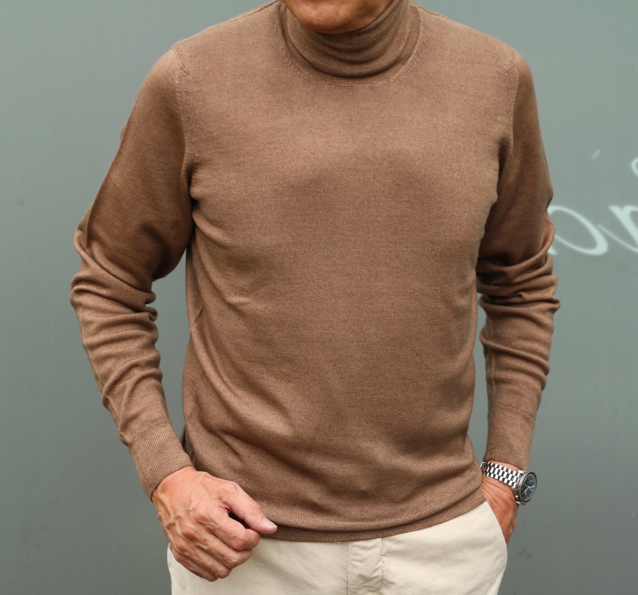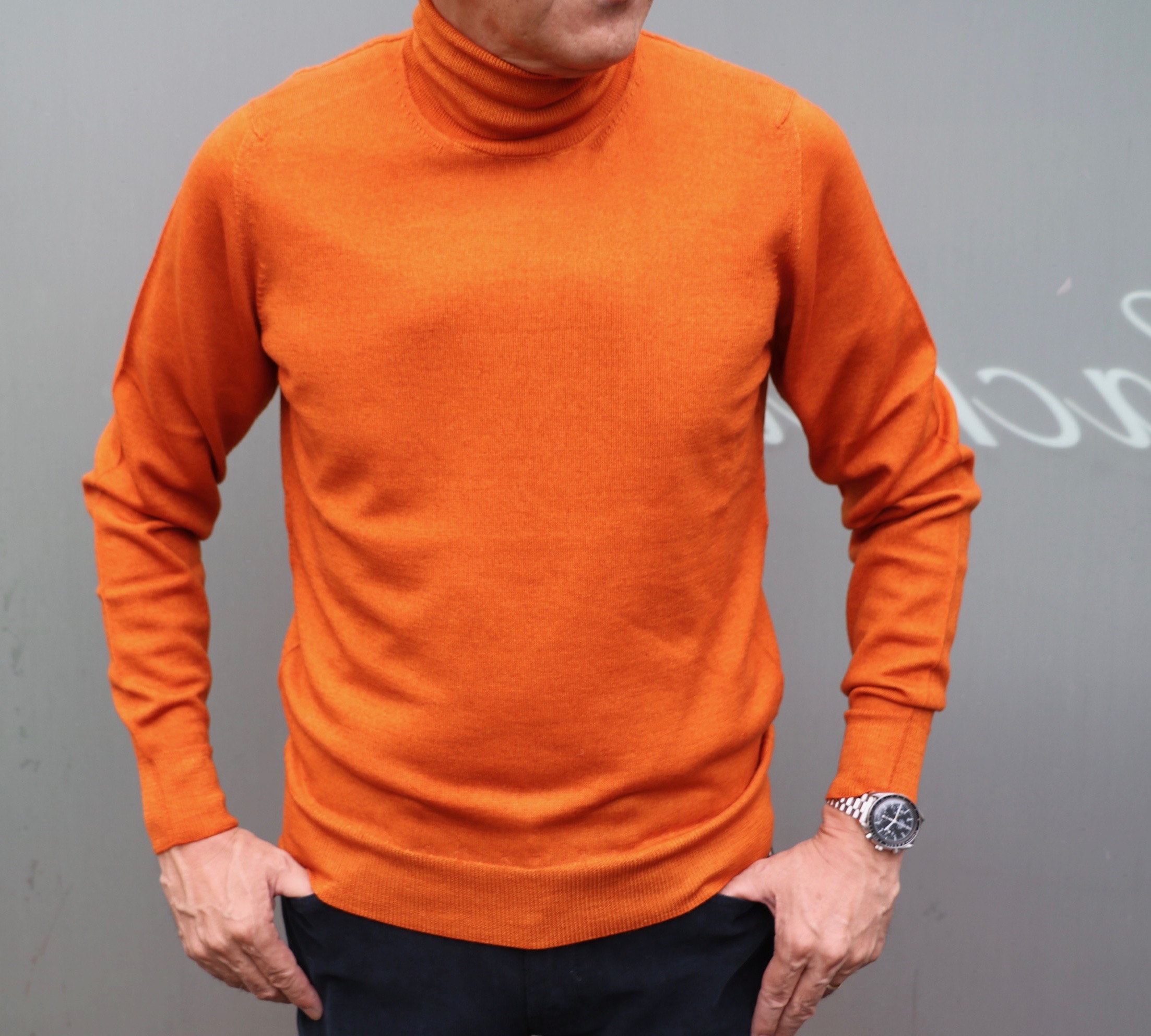 タートルネックは上に重ね着しやすいように、12ゲージの糸を選んでいます。実は、コーディネートの写真をご用意しておりましたが、写真がうまく取り込めません。多分、使う機会の多いニットですので、今後、皆様の目に触れる機会は多いはずです。心配なのは、着用サイズがなくなってしまうことでしょうか。あえて、ネイビーやブラックなどのダーク色は選んでおりません。