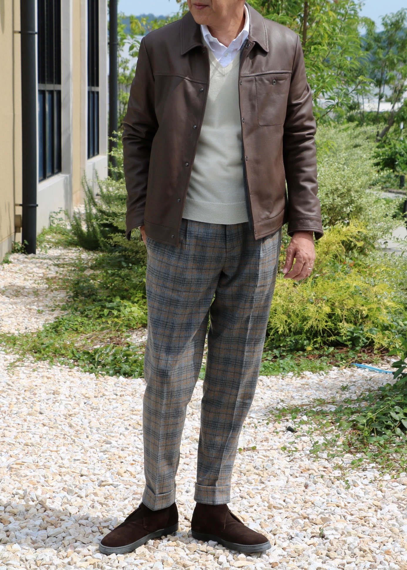 コーディネートで合わせたジャケットはBAGUTTA、ニットはFEDELI。靴は、やはり登場したParaboot(パラブーツです。