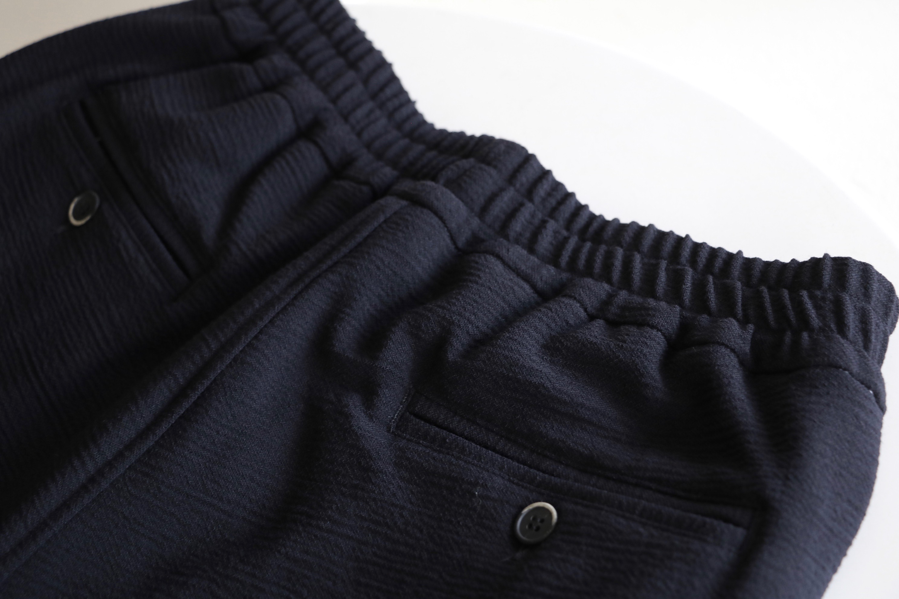 ポリエステル・ウールのストレッチ素材。カラーはネイビーでセレクトです。横に入る織地が表情を豊かにしています。着心地?もちろんジャージな気楽さです。