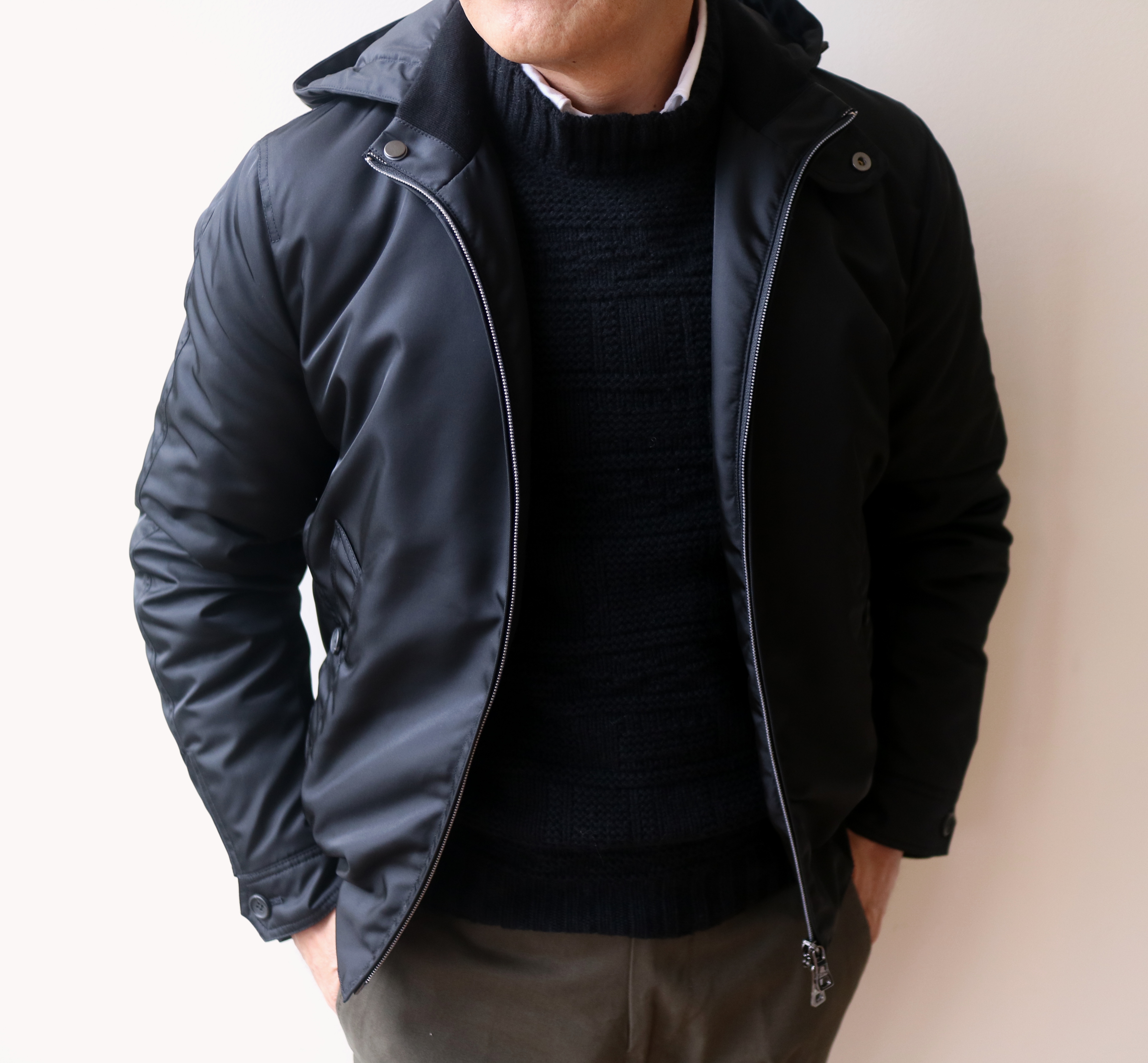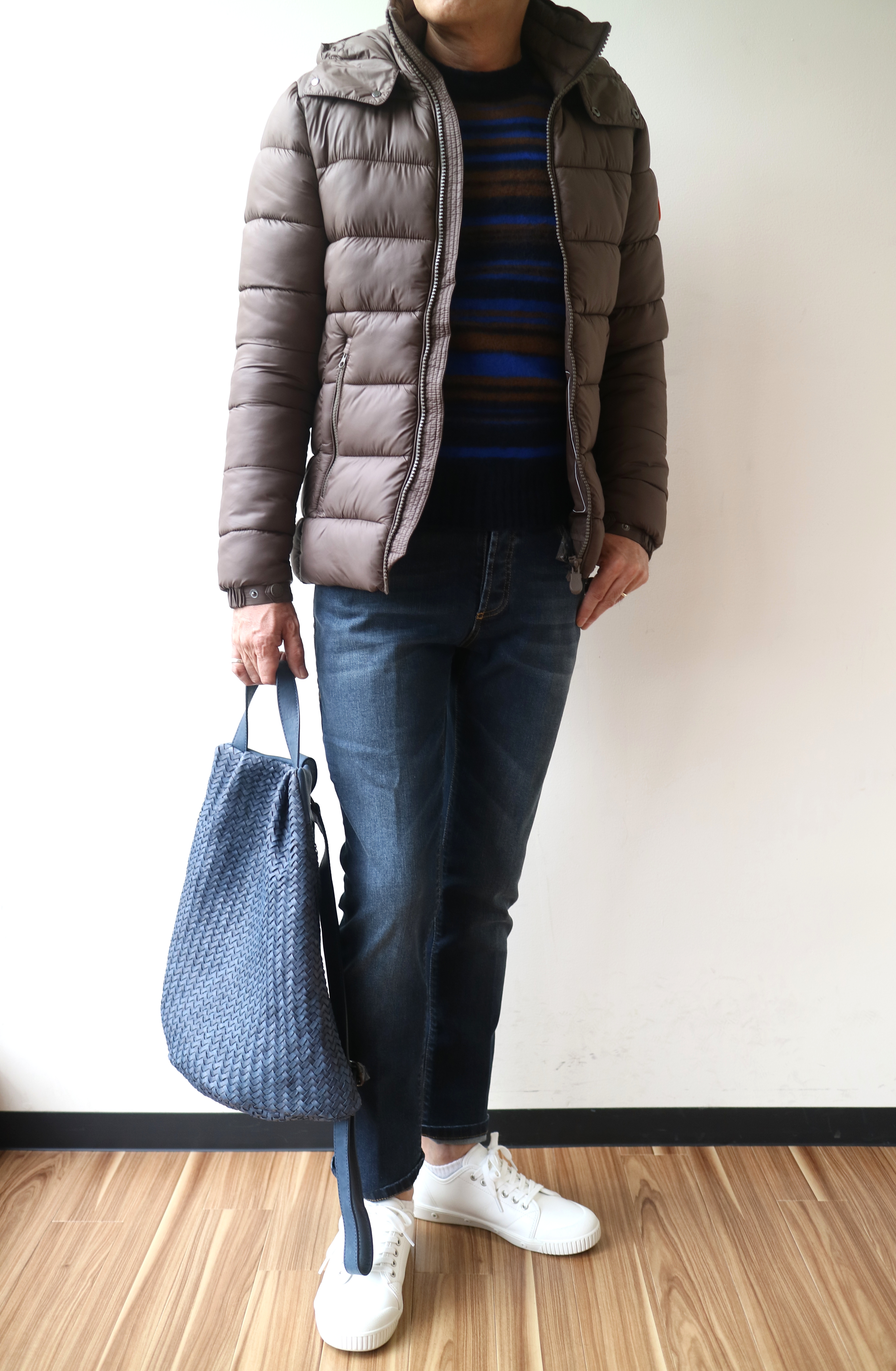 ナイロンのダウンとの相性も抜群です。合わせたダウンジャケットはMooRER(ムーレ)、パンツはINCOTEX(インコテックス)、靴はParaboot(パラブーツ)です。ただ、写真が暗くて、インナーが分かりづらい...