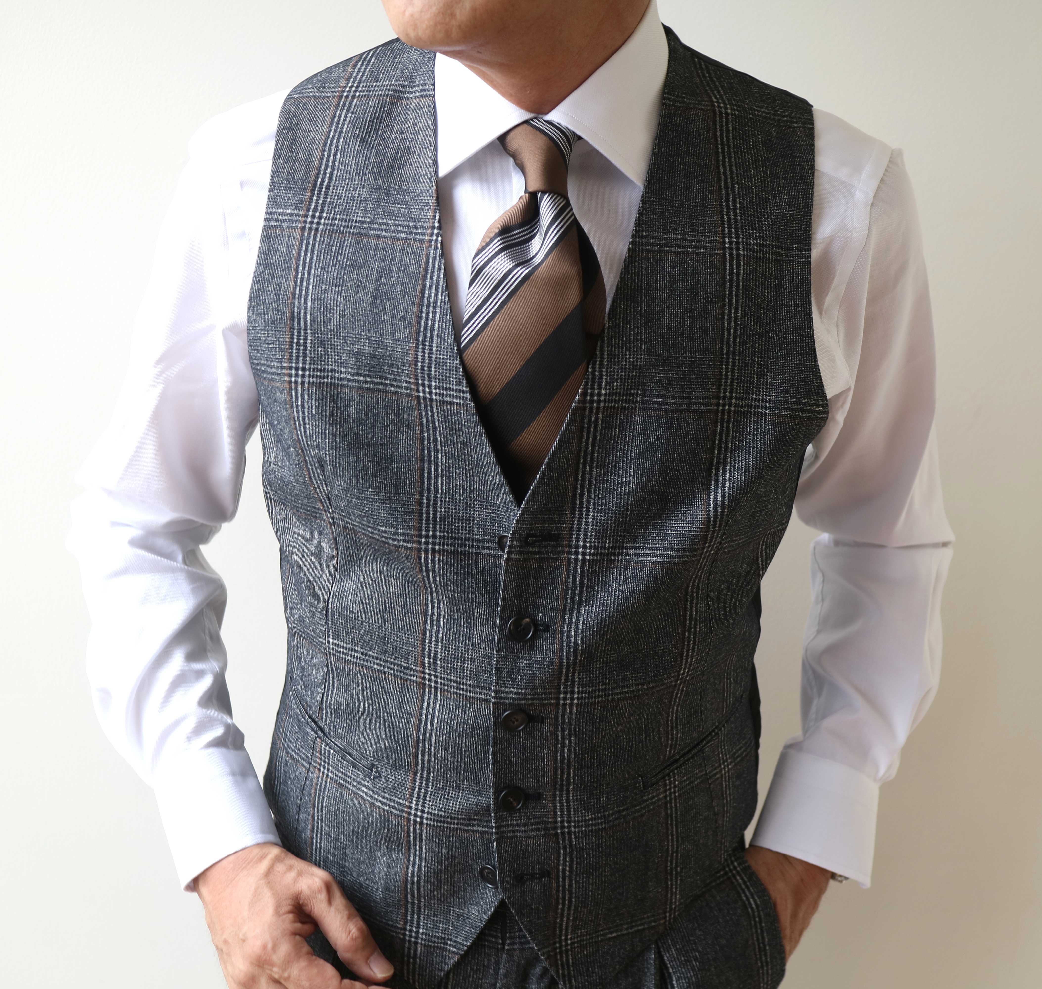 シェンナブラウンをベースにしたストライプ柄。温かみのある茶系に格調ある黒。そして、信頼感のある白が暗い色を引き立ててくれます。合わせたスーツはTAGLIATORE、シャツはBAGUTTAです。