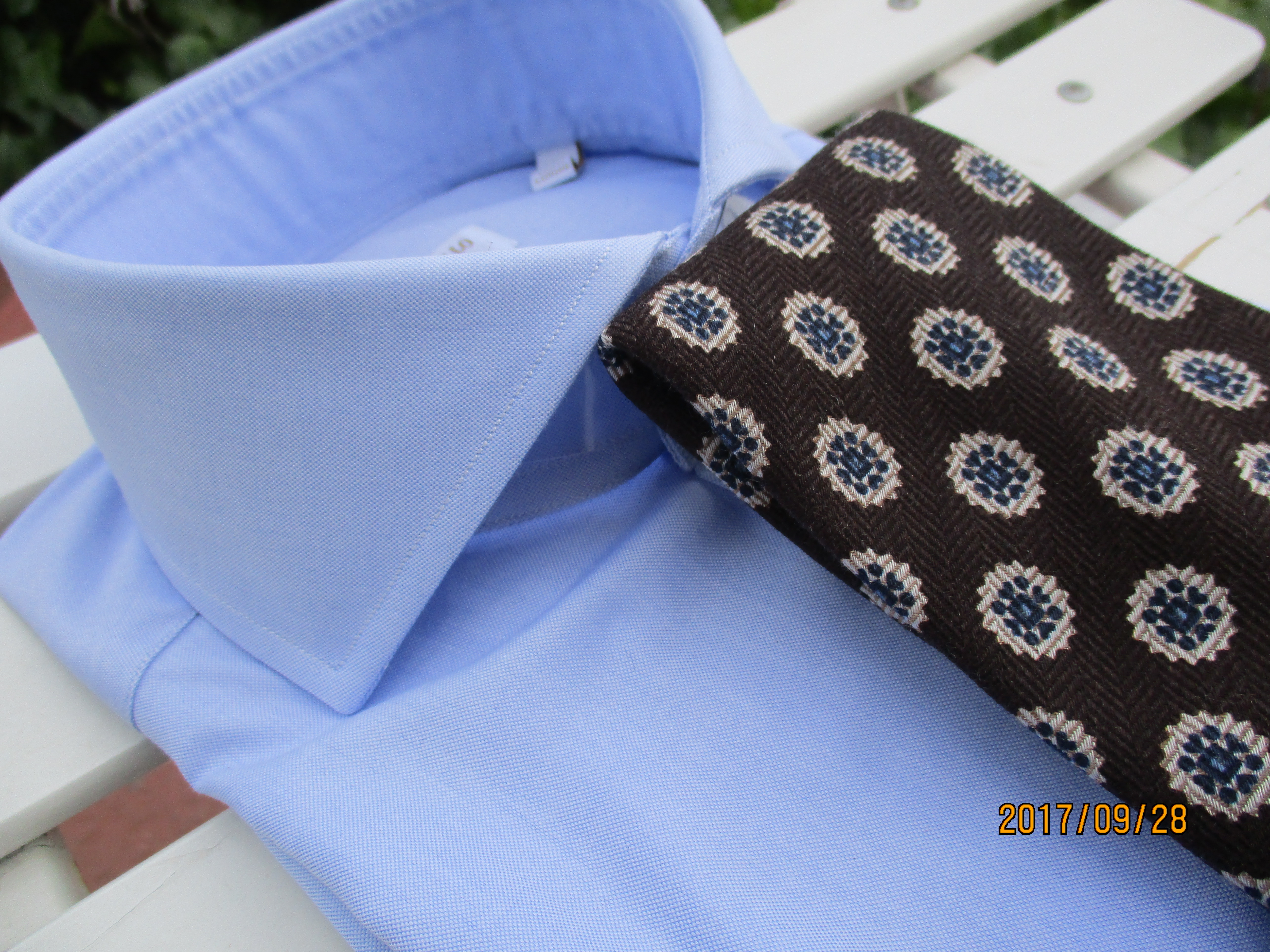ブラウンとブラックをベースにしたオールオーバー柄タイ。同じパターンの絵柄が繰り返されているものが、オールオーバーです。中でも絵柄の間隔が離れているものを、スペースド・パターンと呼び、地の色が多い分、柄物のシャツが選びやすくなります。温かみのあるクラシックな柄として、これからの季節に大活躍するはずです。合わせたシャツは、こちらもBORRIELLOの無地とロンドンストライプです。
