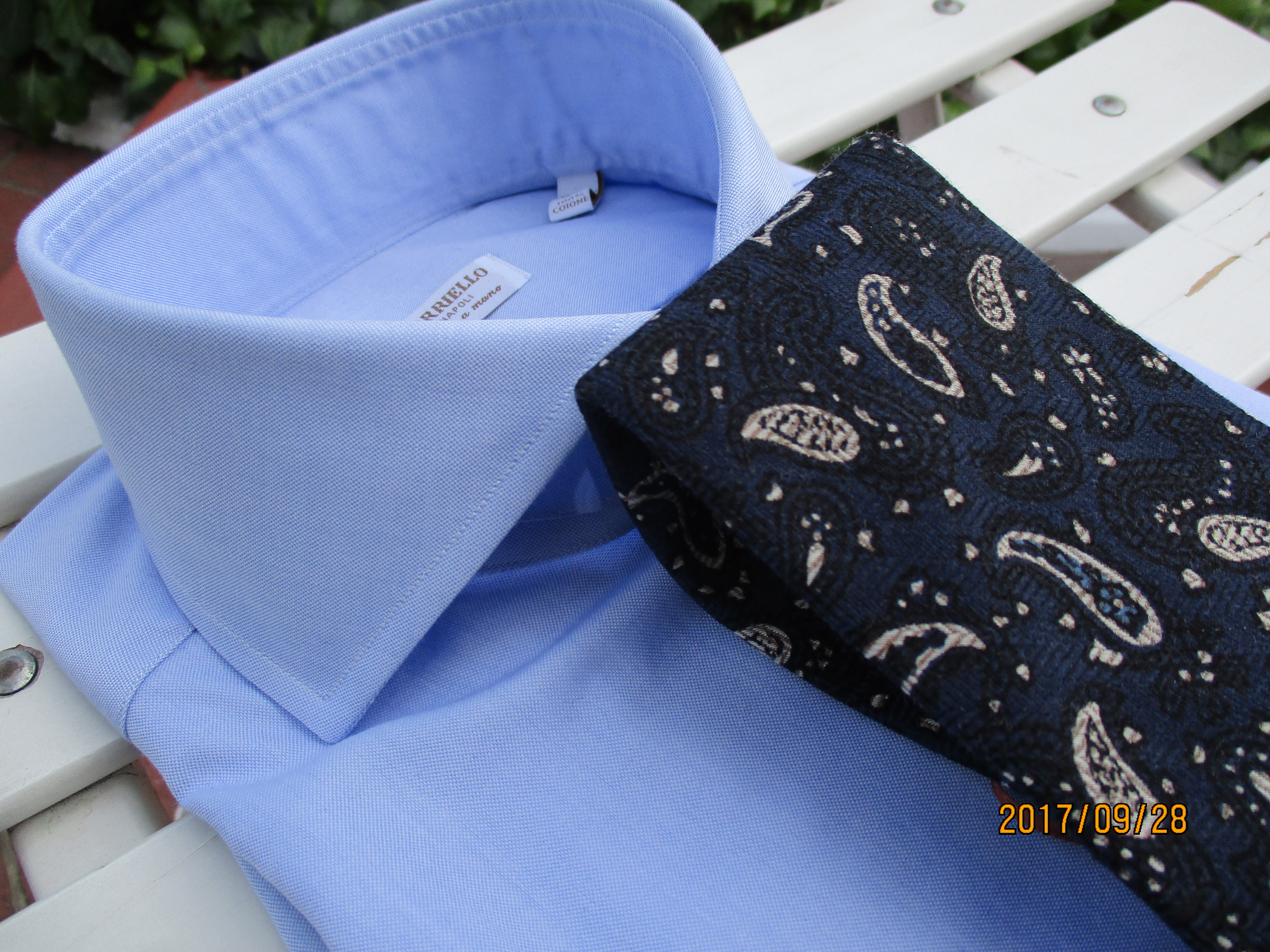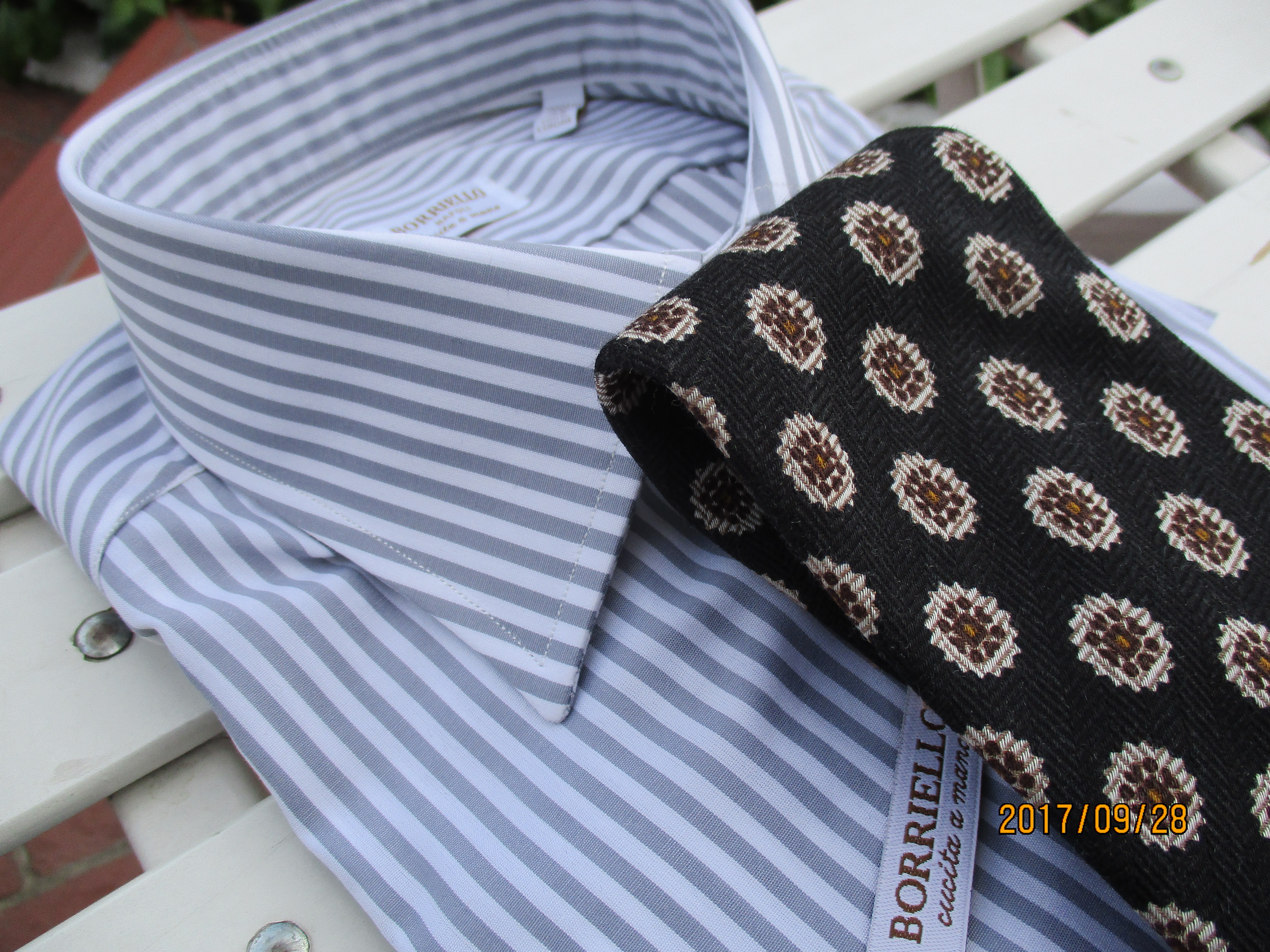 濃紺をベースにワインとシャンパンとなんて、ついお酒のことを連想してしまいましたが、華やかな配色のストライプ柄です。特別な日には結びたくなります。置き撮りのシャツは未公開のBAGUTTA、着用のスーツはTAGLIATORE、シャツはAVINO Laboratorio Napoletanoです。