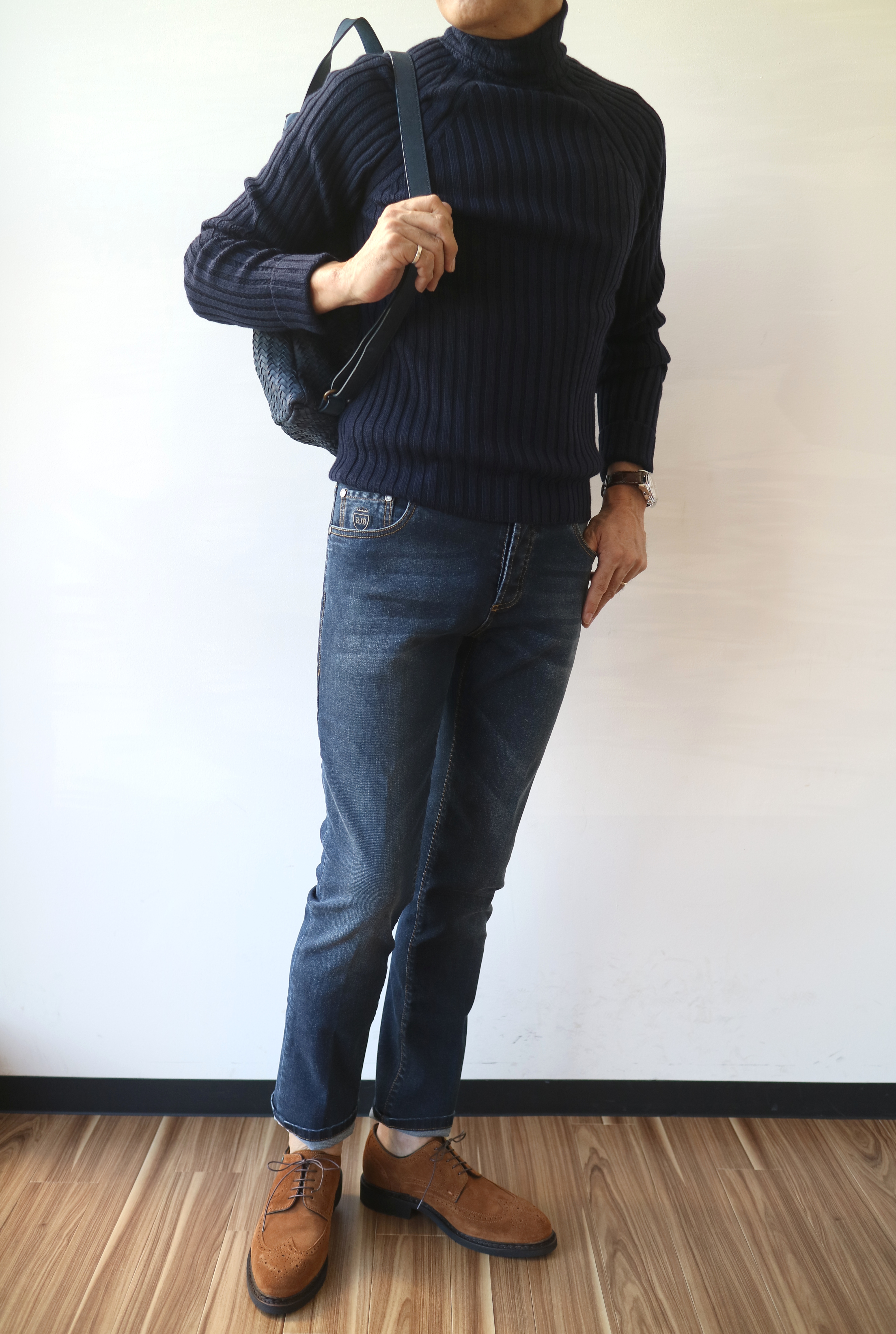インディゴブルーのデニムパンツに濃紺のニットを合わせるのは、大好物。白のスニーカーをと思いましたが、ちょうどParaboot(パラブーツ)から、ステッチの色と同色のスウェード靴が入荷です。明日にでもご紹介しますね。DRUMOHR(ドルモア)のニットも未だでした、少しお待ちください。肩にかけたバッグは、そろそろ品不足になっているTIBERIO FERRETTI(ティベリオ フェレッティ)の「ZAINETTO」です。