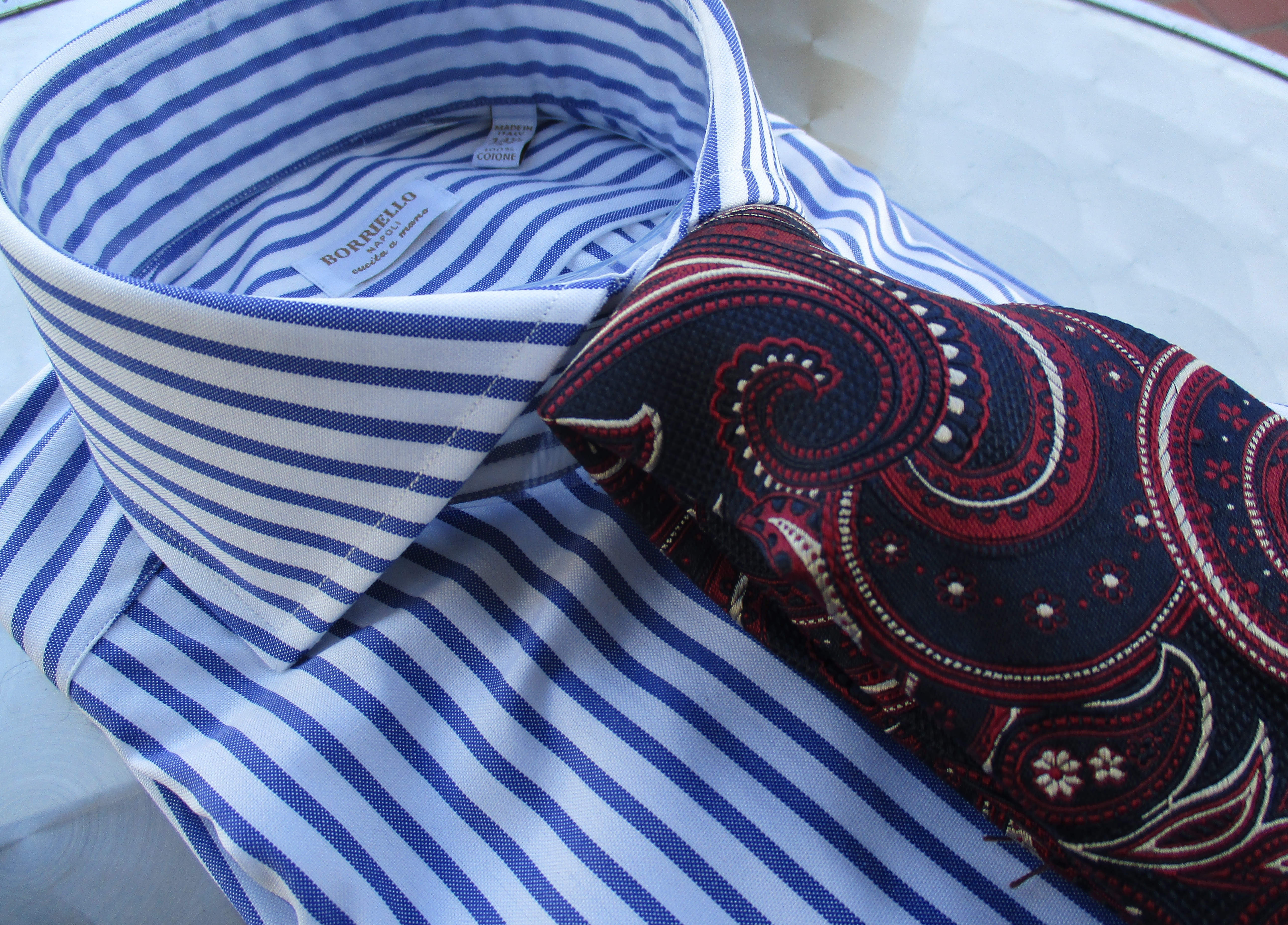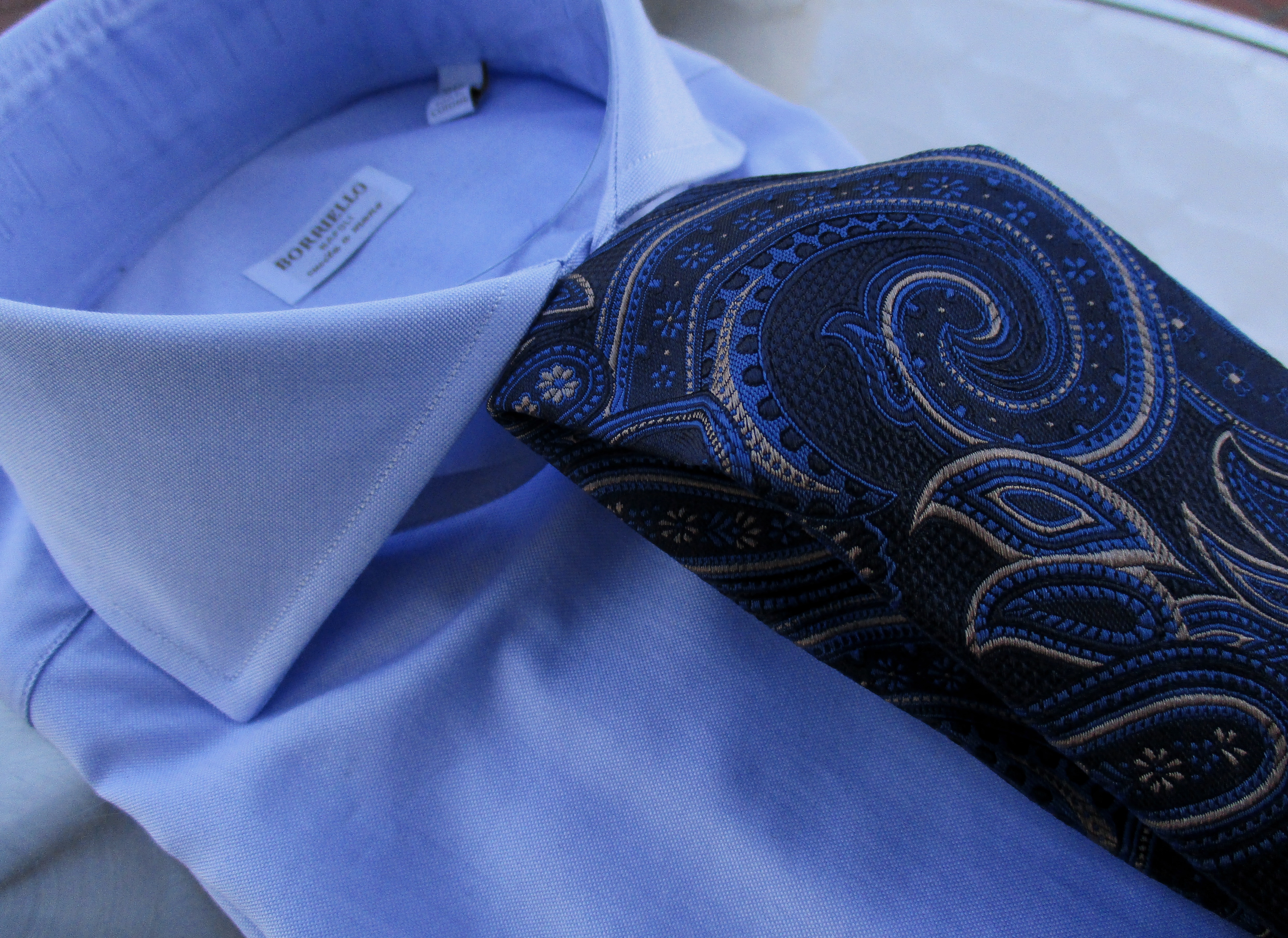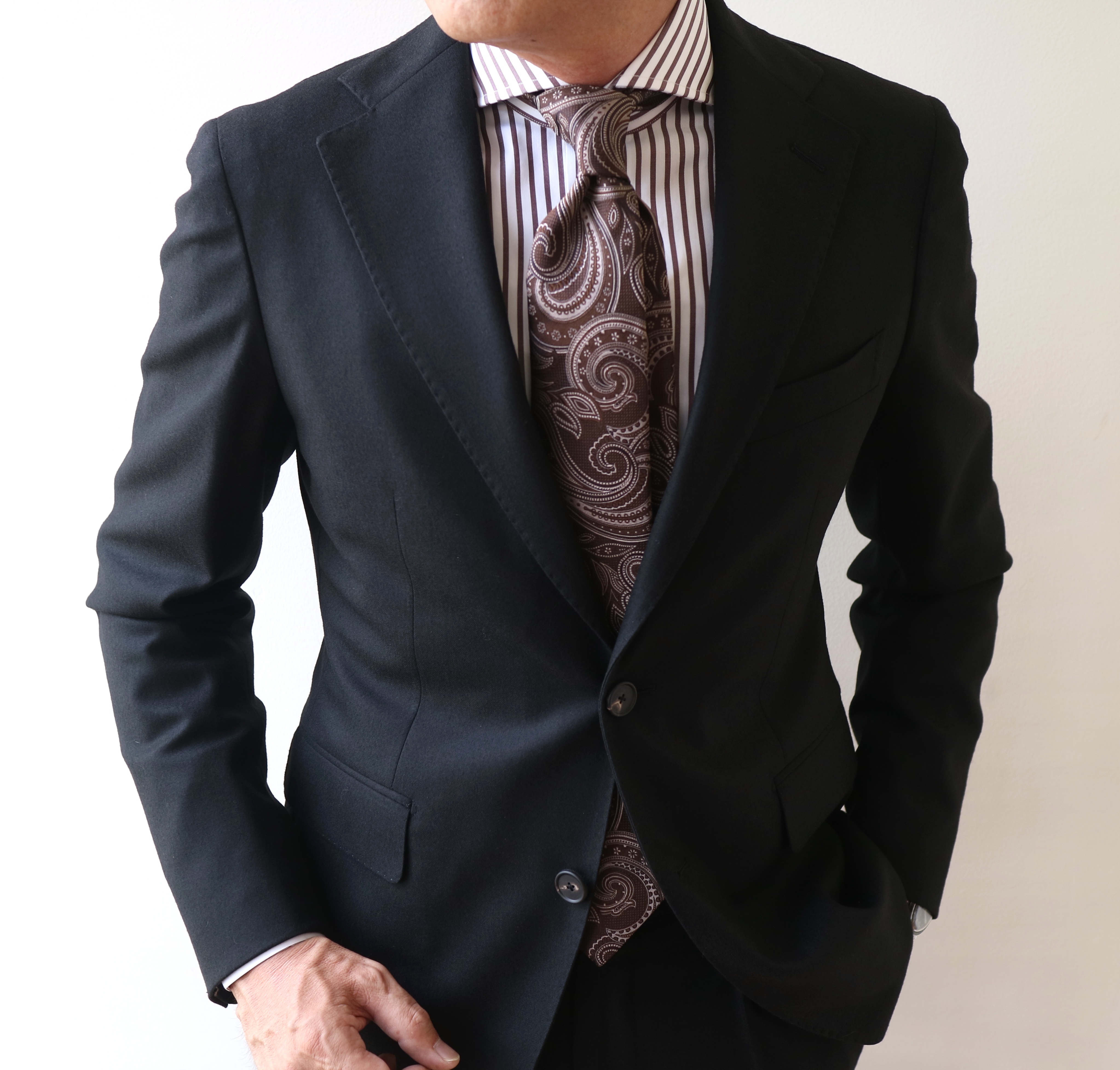 19世紀のはじめ、スコットランドのペイズリー地方でカシミア・ショールの柄として使われだした模様。もともとは宗教的な意味合いが強く、聖樹とされる松の種子や実をデザインした柄です。ネクタイだけ見ていると派手に思えますが、実際にあわせてみると、実にエレガントな表情に。華やかな場所には、最適です。