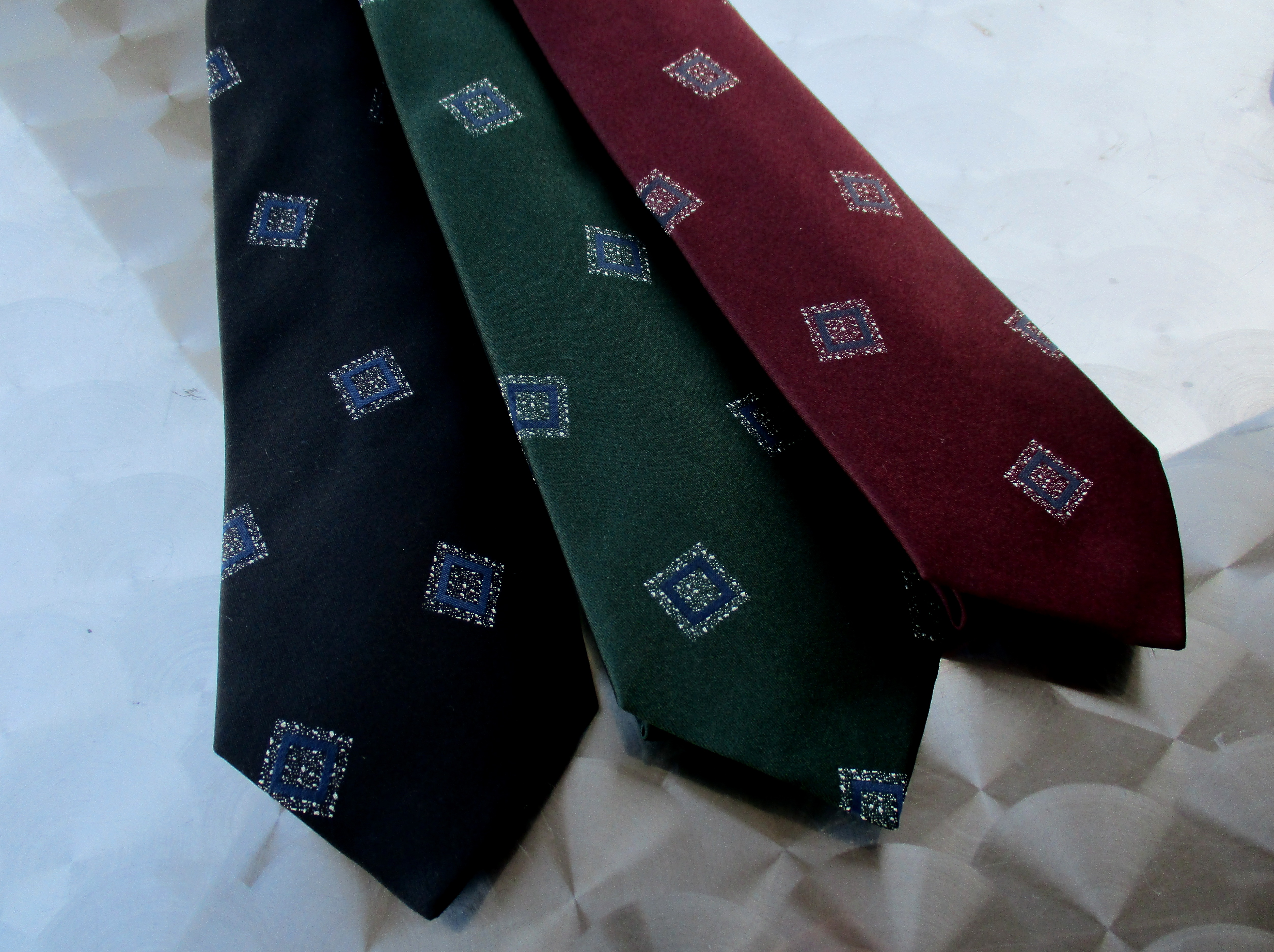 今季のトレンドをよく反映させているブリティッシュカラーのスペースド・パターン(飛び柄)。ボルドー、グリーン、ブラックの3色です。