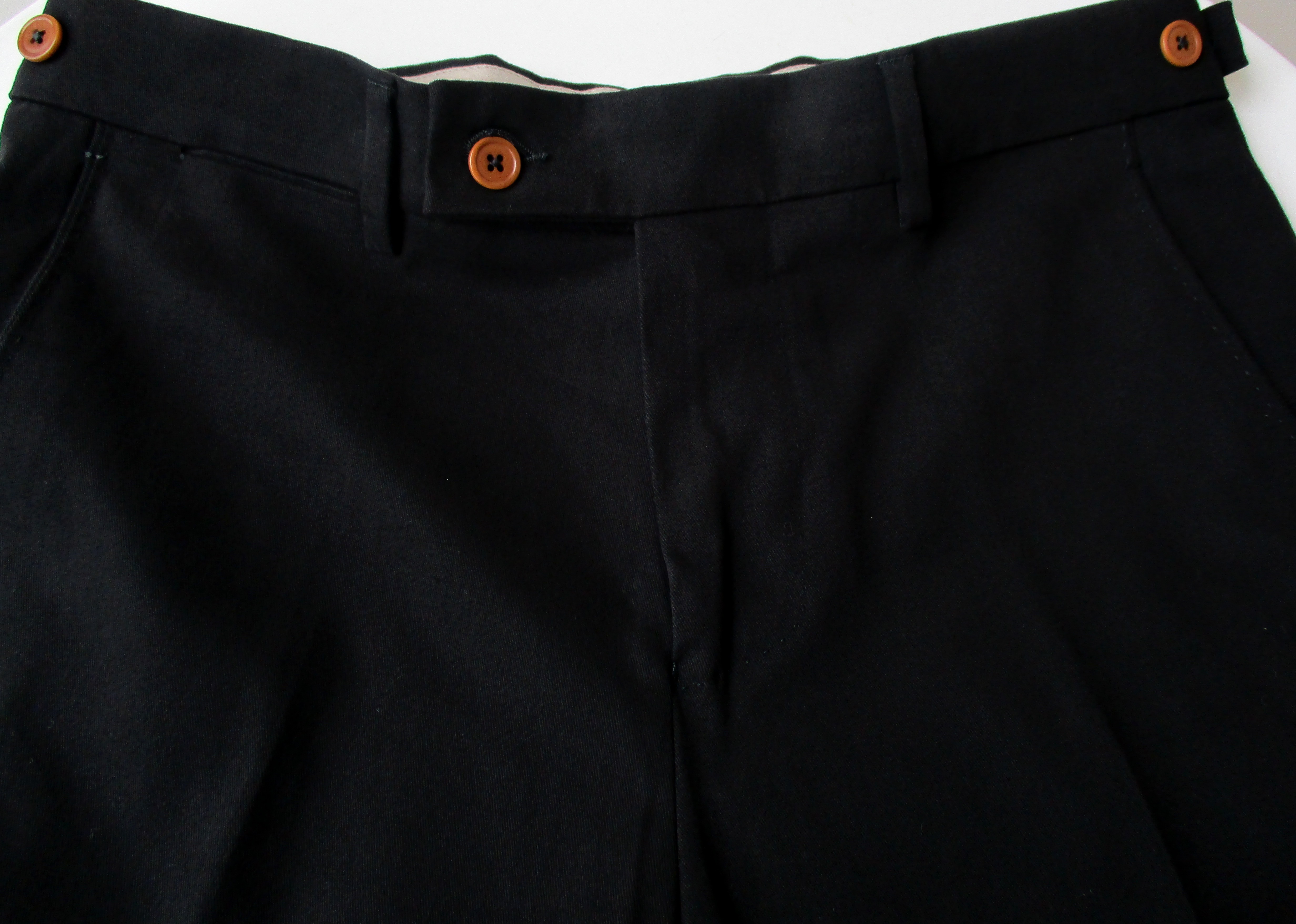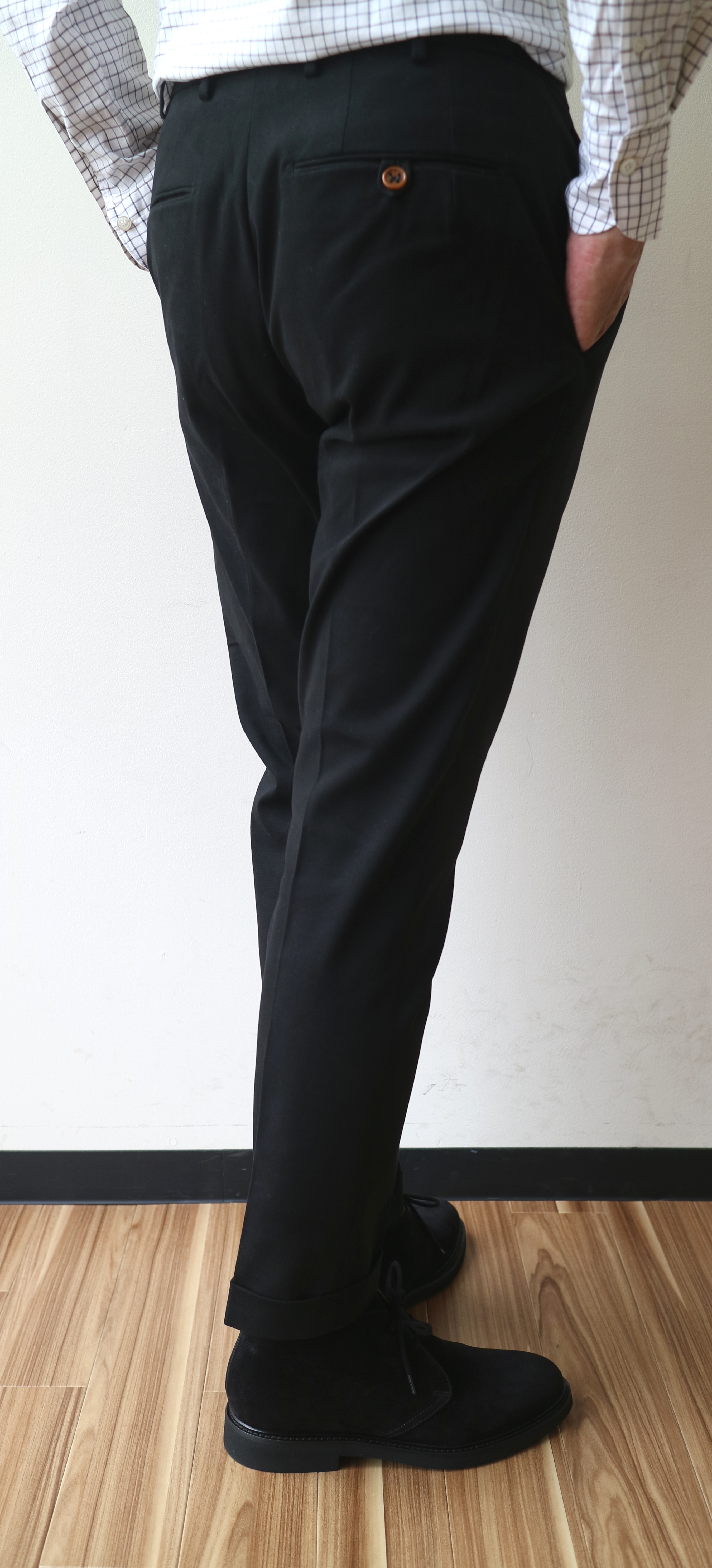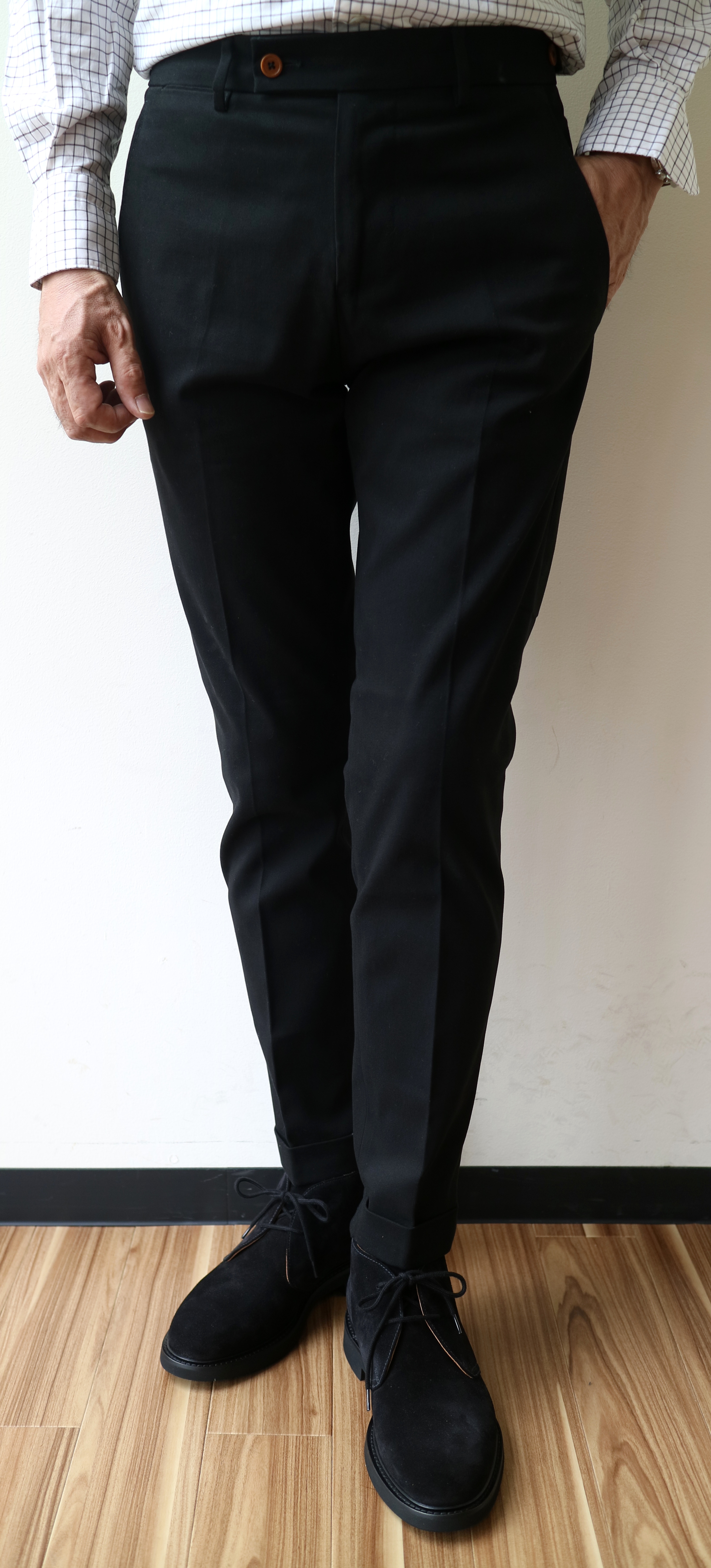 同じ「clochard」でセレクトした綾織りのストレッチコットンパンツ。毛羽立ちの少ない生地です。上の色がグレイに見えてしまうかもしれませんが、実際はグレイがかったオリーブ。ミリタリーに見せないモダンな色です。そしてブラック。一本、持っていると重宝します。
