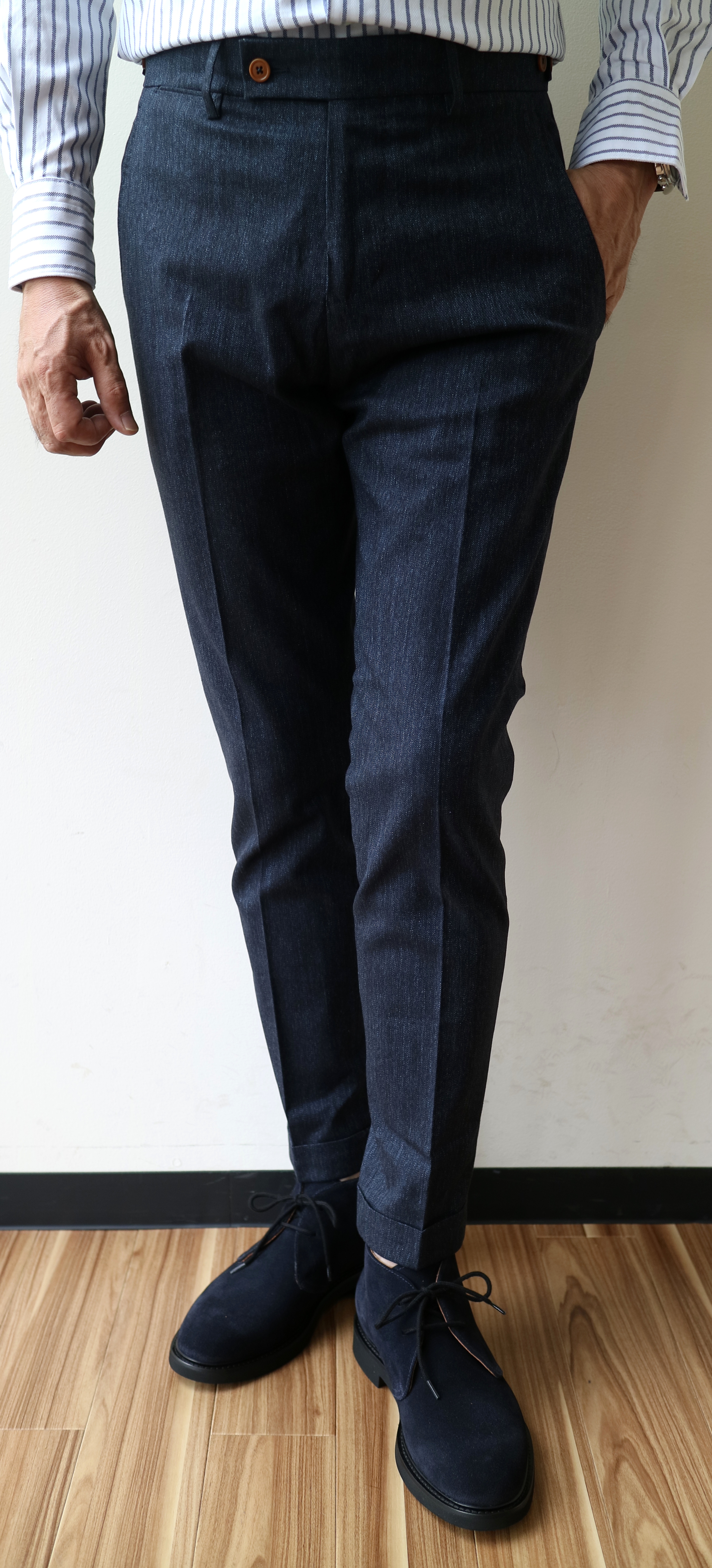 インディゴの濃淡で織り成す綾織りは、一見、デニムのようですが、実はクリーンな表情をもつストレッチコットン。表面に起毛感はなく、ロングシーズンで穿いていただける、着回しの良いパンツになるはずです。