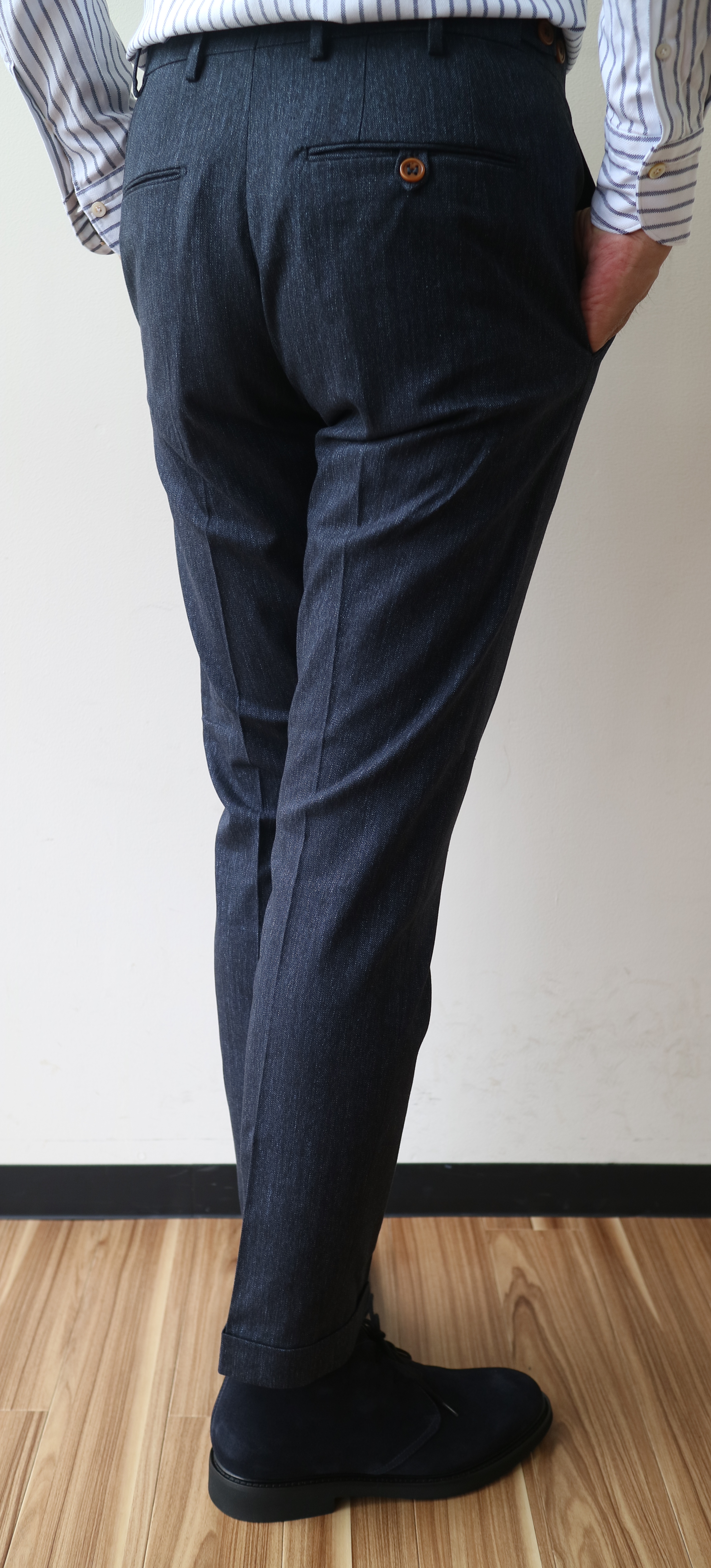 モデルは身長175㎝、体重65K、胸囲92㎝で、サイズ38を着用しております。合わせたパンツはPT01(ピーティーゼロウーノ)、ベルトはTIBERIO FERRETTI(ティベリオ フェレッティ)です。