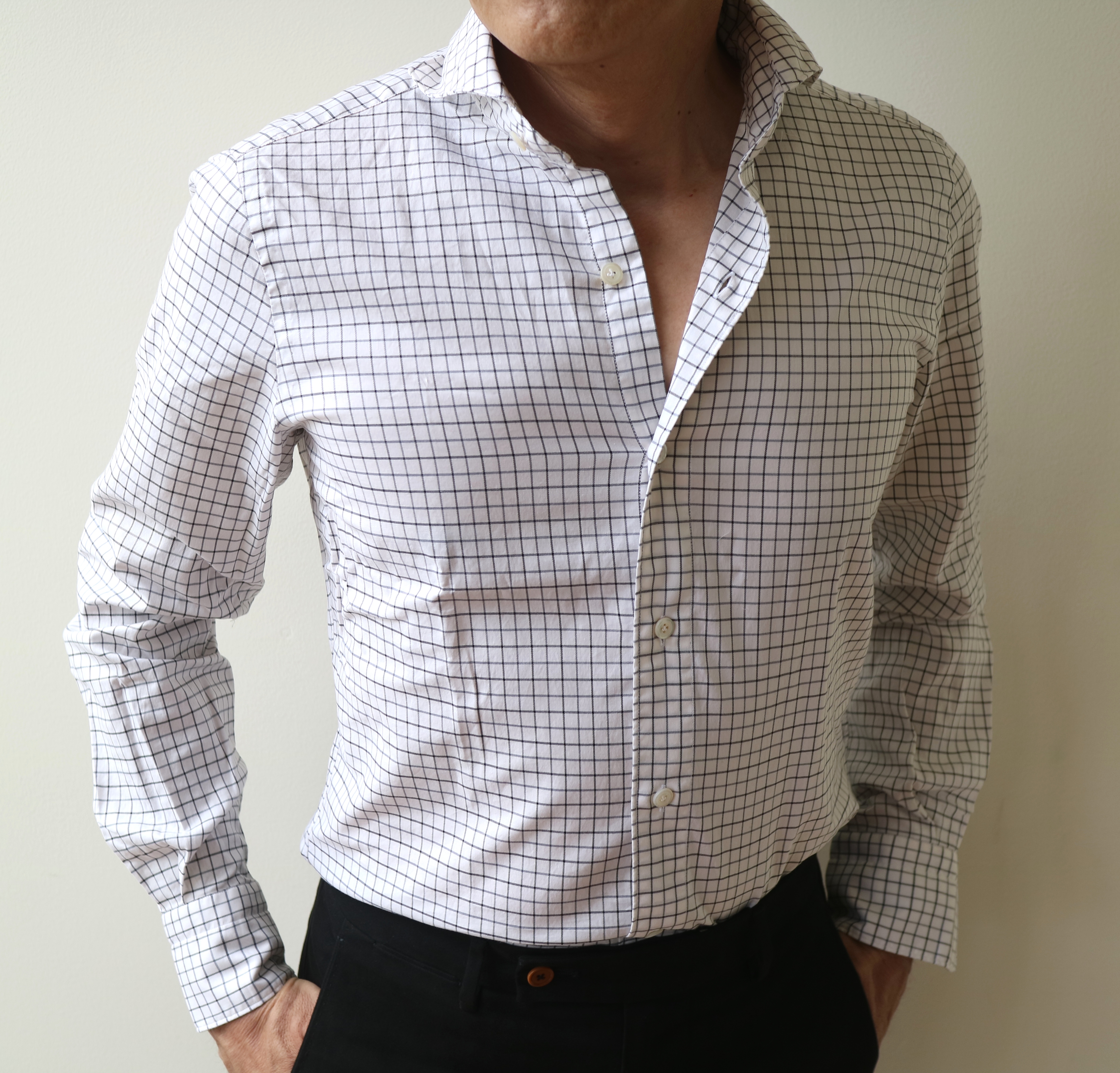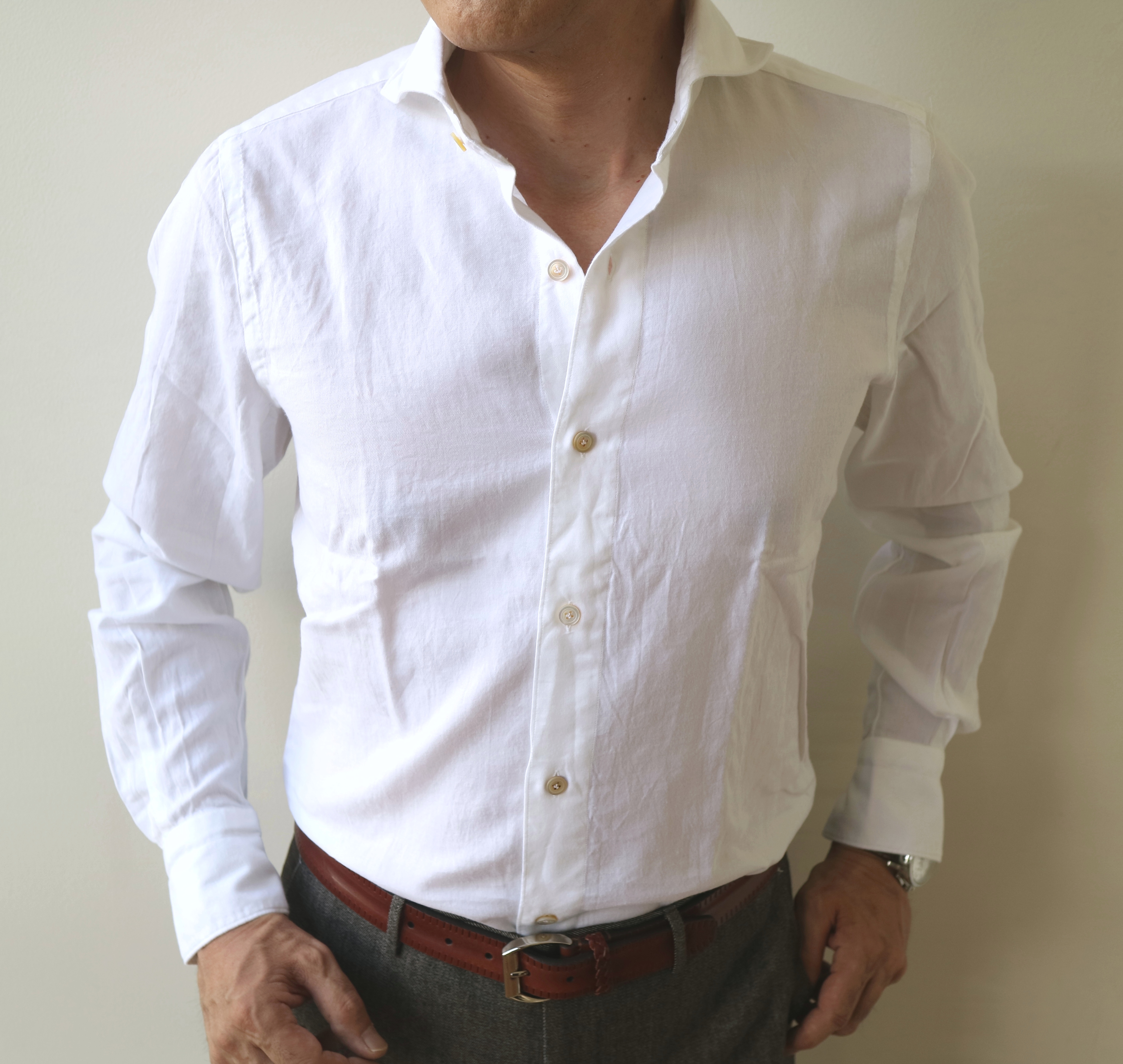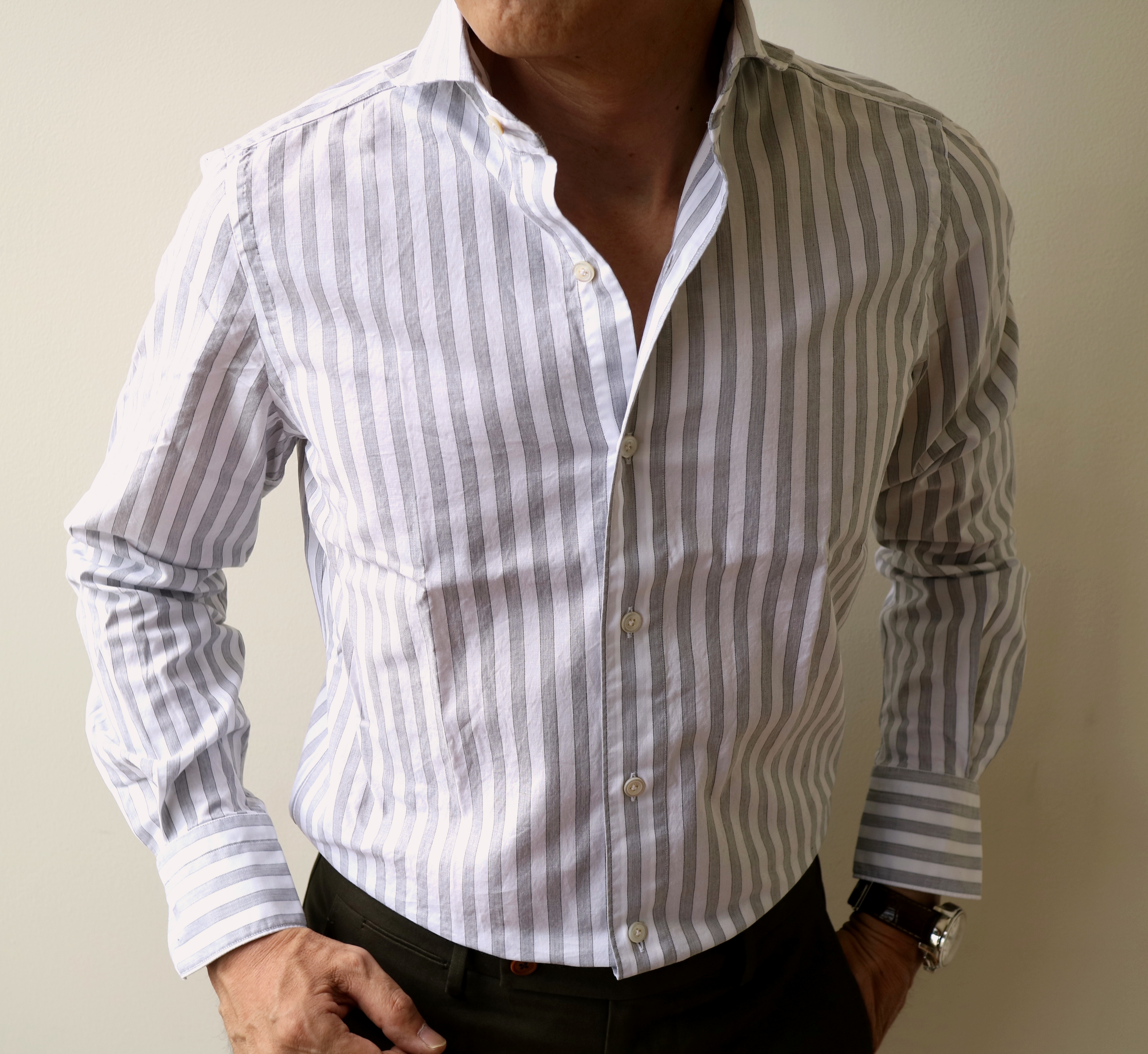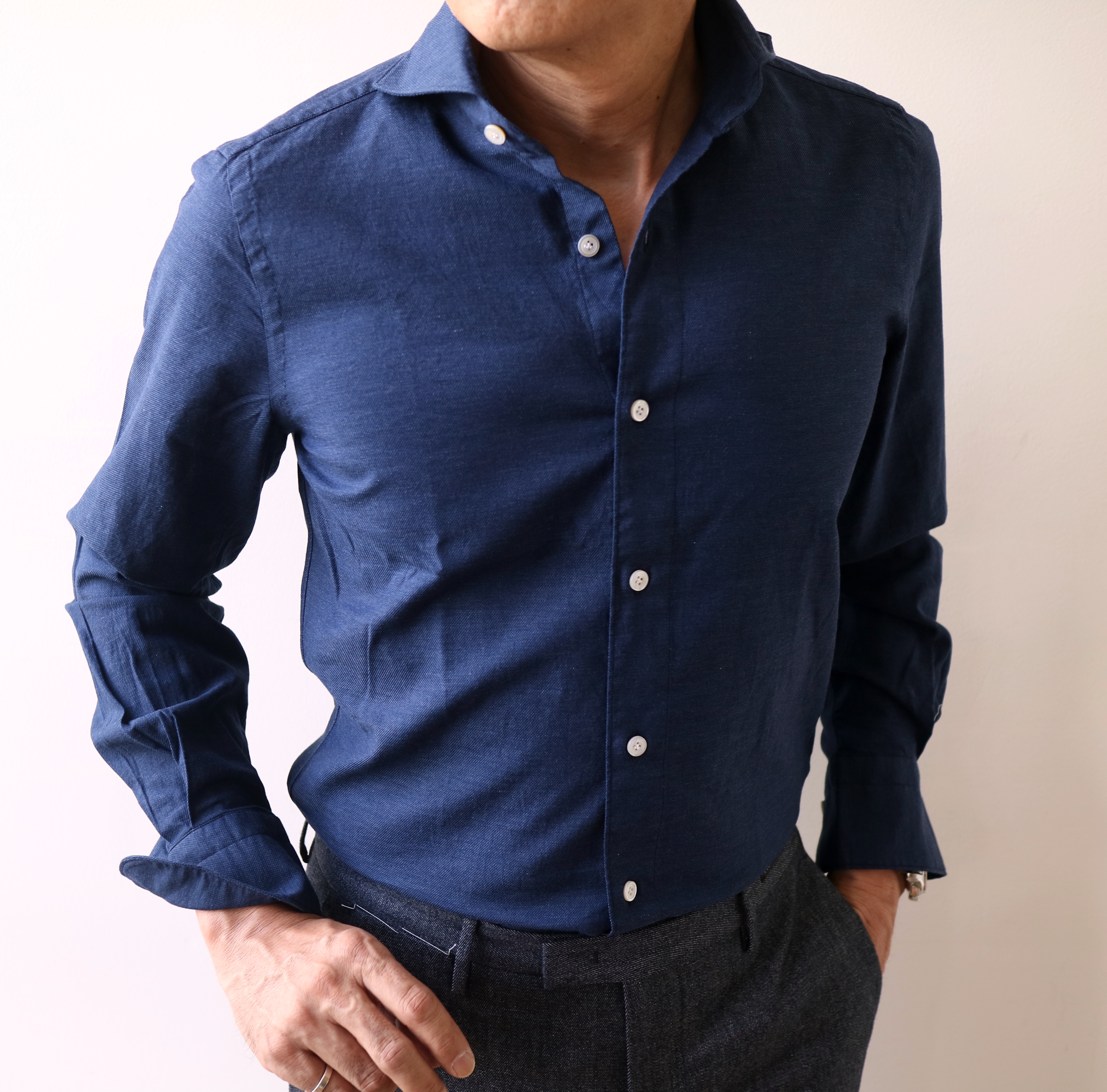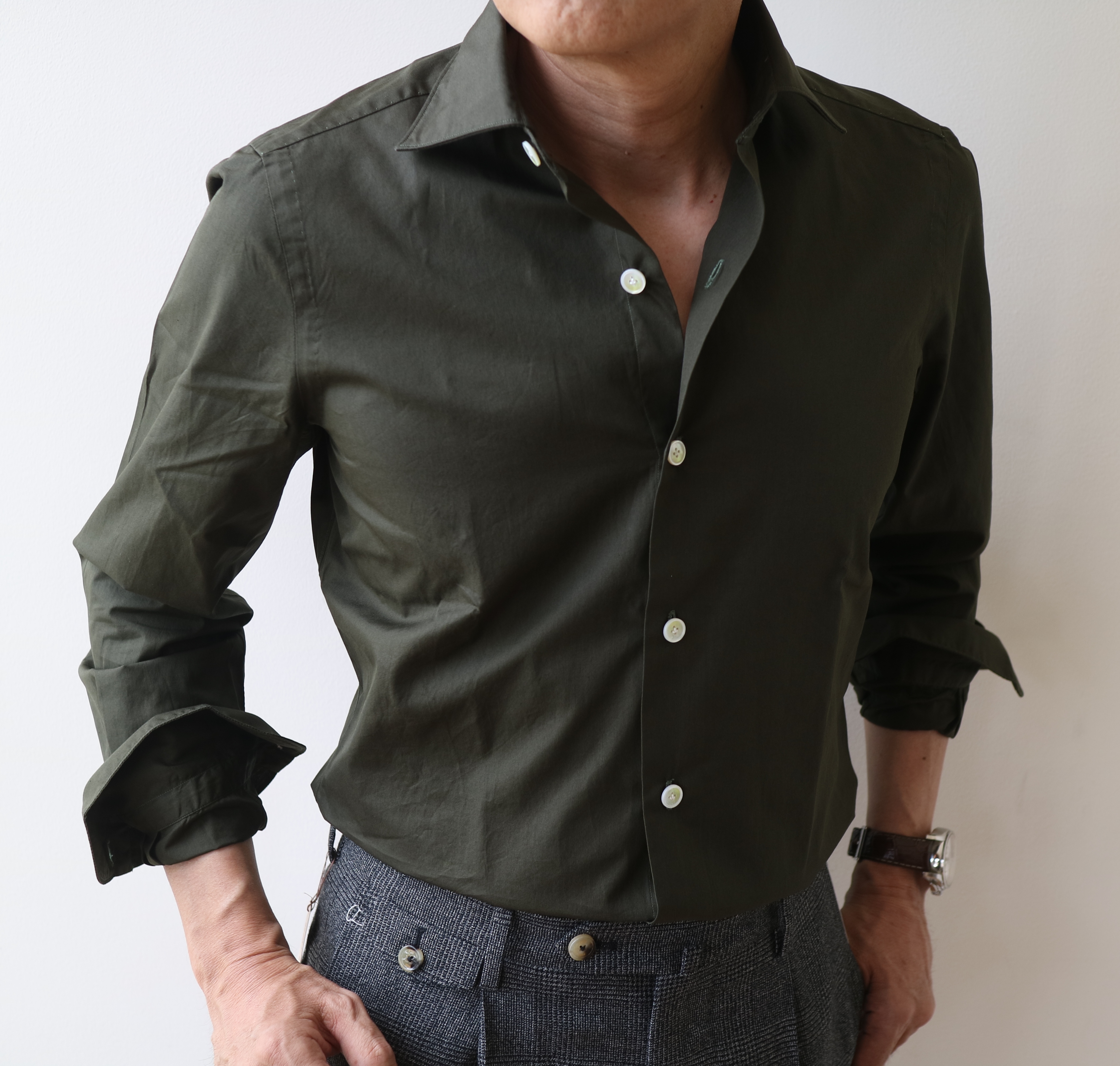 そして本日のご案内は、同じ【Finamore/フィナモレ】の「SERGIO」。このブランドを象徴する襟型です。昨今のトレンドを無視するようですが、「やっぱ、これっ、いいよね」でセレクトです。高めの台襟、弧を描くように後に広がる襟の形状は、当時、一目見て、【Finamore/フィナモレ】と分かり、これを着ていることが自慢でした。周囲、特に女性の視線を釘付けにし、いつも素敵なシャツを着てますねと言わしめたのが、この「SERGIO」。その後、「SIMONE」に切替えましたが、ジャケットから覗く襟元に、やや迫力を欠き、襟元が沈んでしまうという難点もあり、「やっぱ、これっ」という結論に達したのでした。