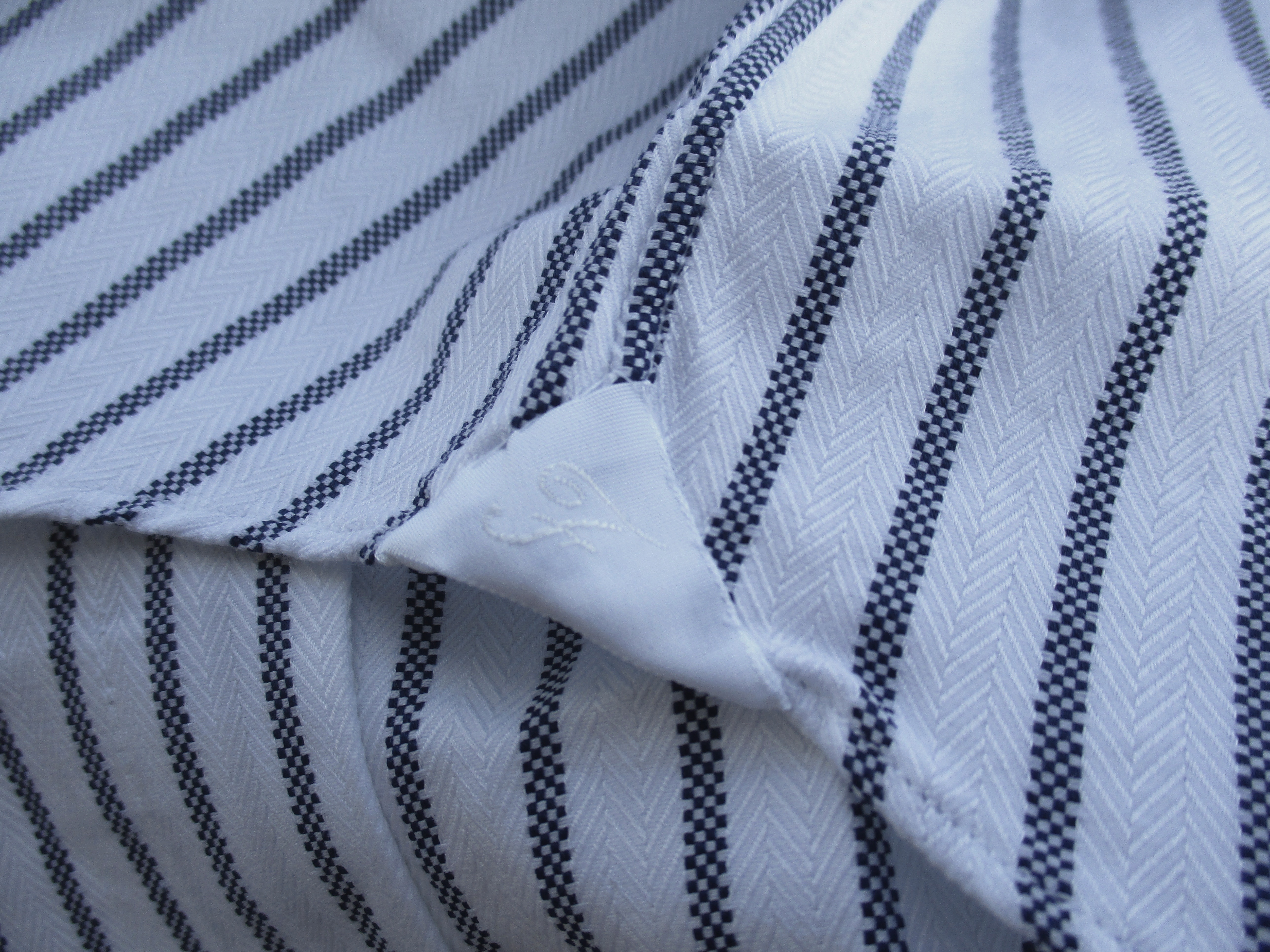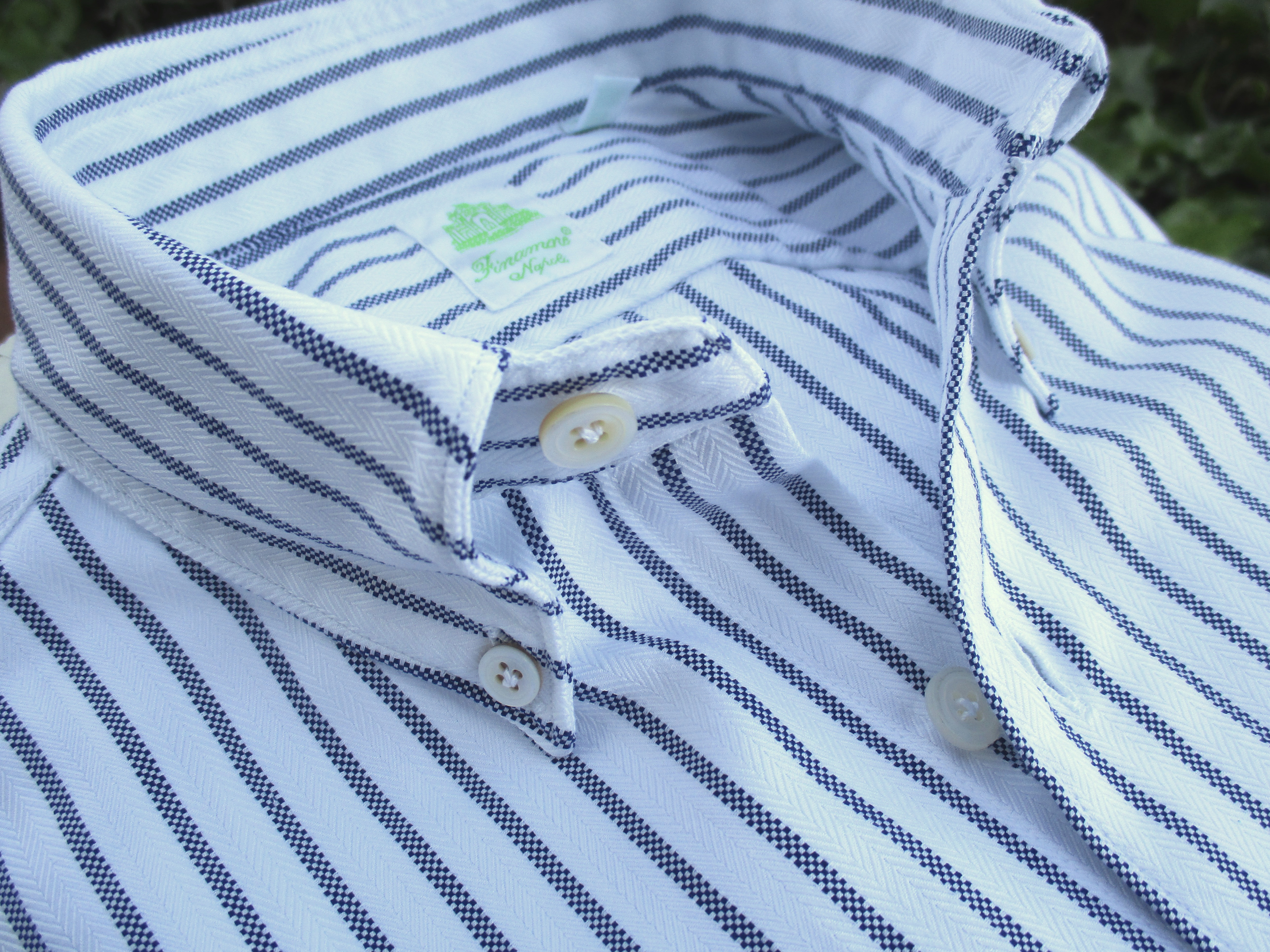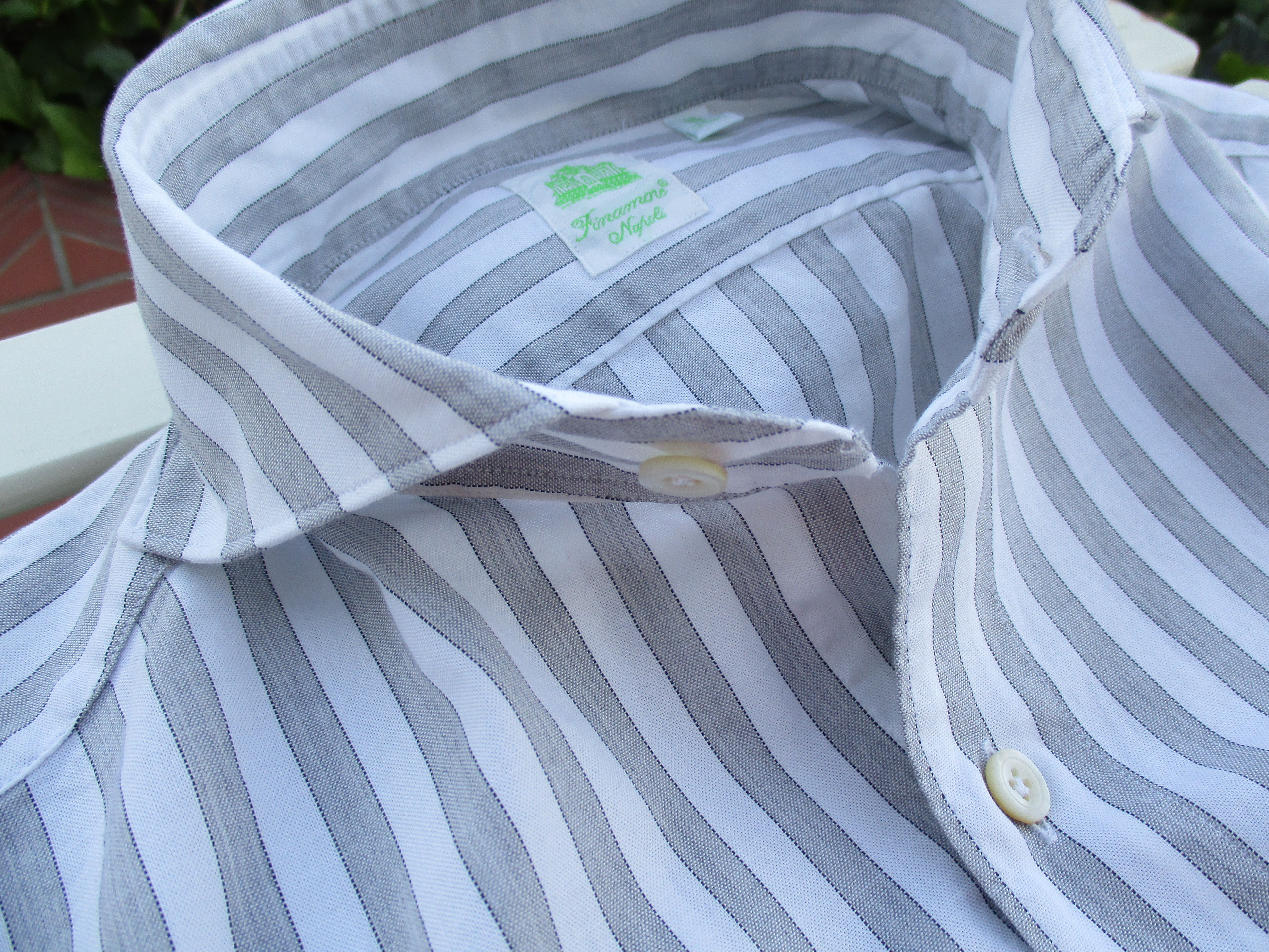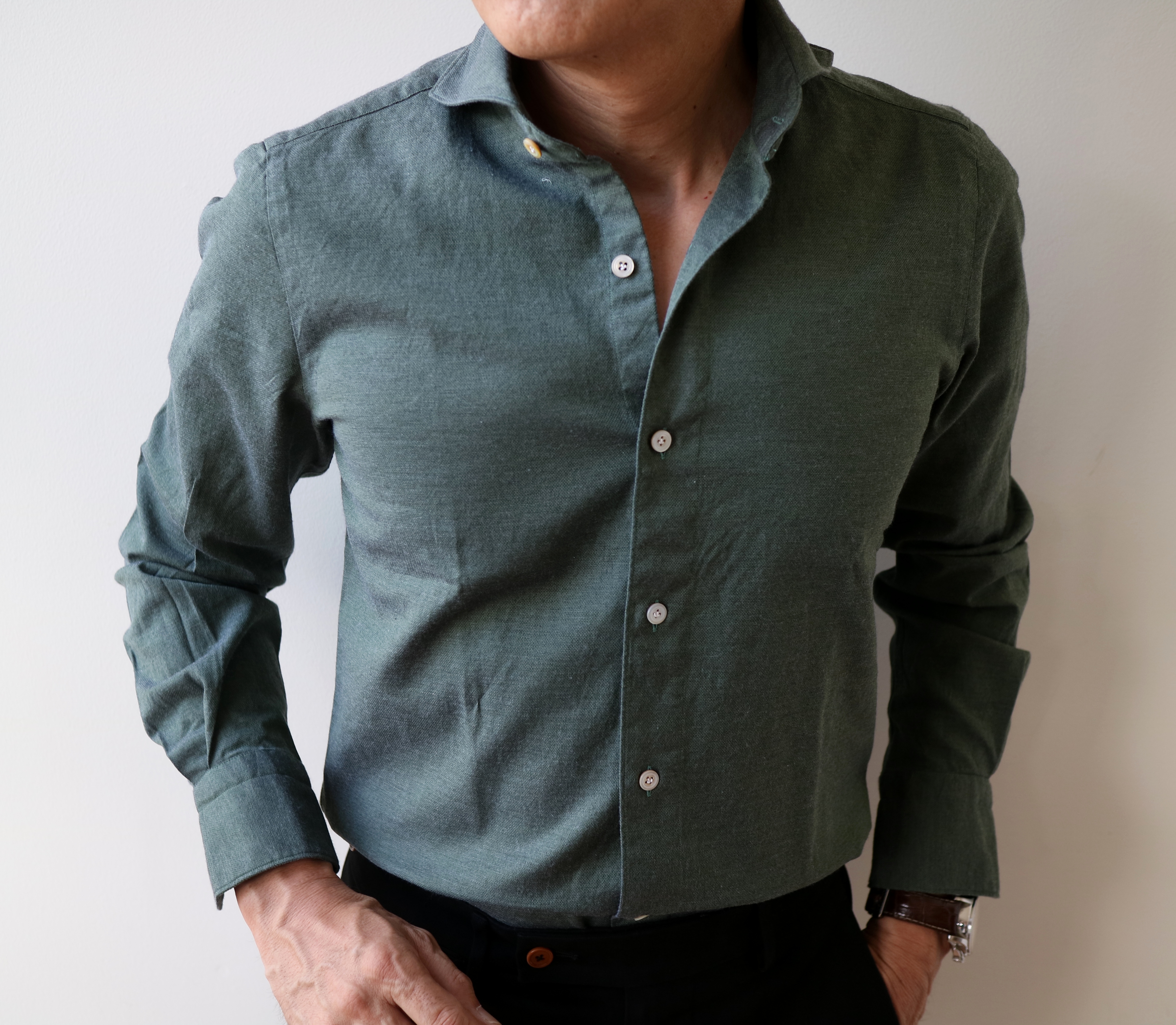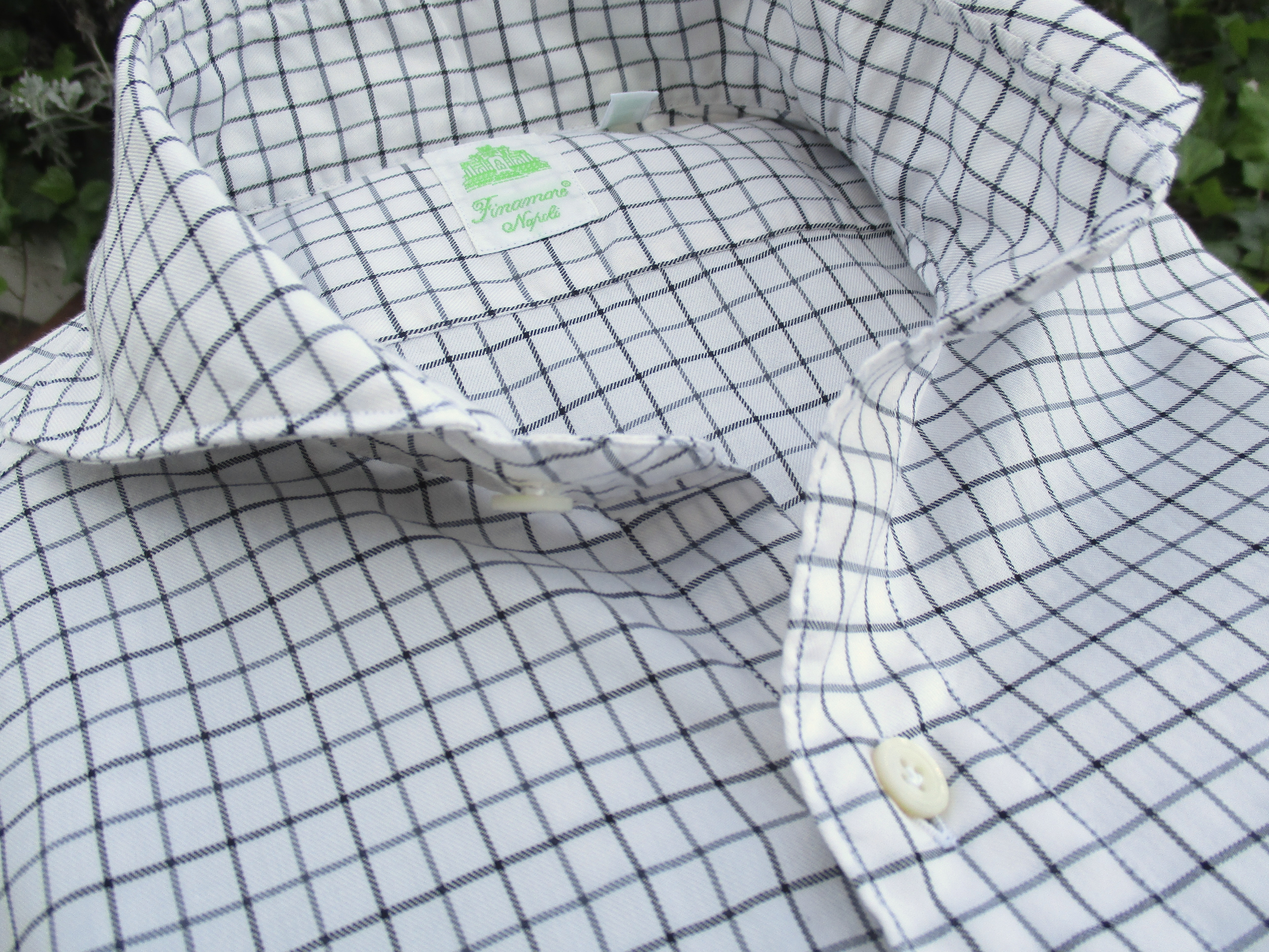 そして本日のご案内は、同じ【Finamore/フィナモレ】の「SERGIO」。このブランドを象徴する襟型です。昨今のトレンドを無視するようですが、「やっぱ、これっ、いいよね」でセレクトです。高めの台襟、弧を描くように後に広がる襟の形状は、当時、一目見て、【Finamore/フィナモレ】と分かり、これを着ていることが自慢でした。周囲、特に女性の視線を釘付けにし、いつも素敵なシャツを着てますねと言わしめたのが、この「SERGIO」。その後、「SIMONE」に切替えましたが、ジャケットから覗く襟元に、やや迫力を欠き、襟元が沈んでしまうという難点もあり、「やっぱ、これっ」という結論に達したのでした。