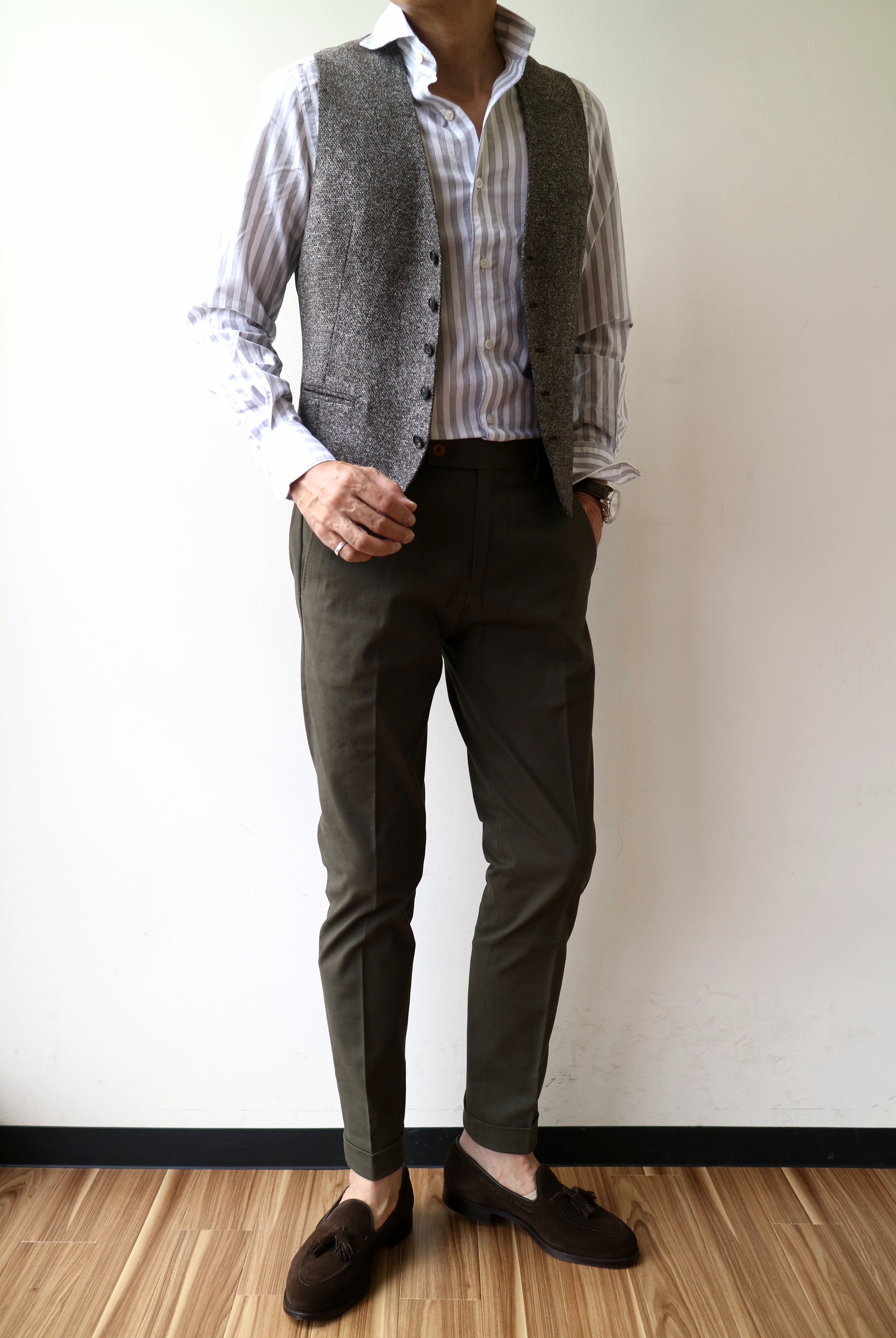全身コーディネートのグレイで合わせたジレは未公開のTAGLIATORE(タリアトーレ)、パンツはBERWICH(ベルウィッチ)、靴はCROCKETT&JONES(クロケット&ジョーンズ)。ネイビーで合わせたパンツはINCOTEX(インコテックス)です。