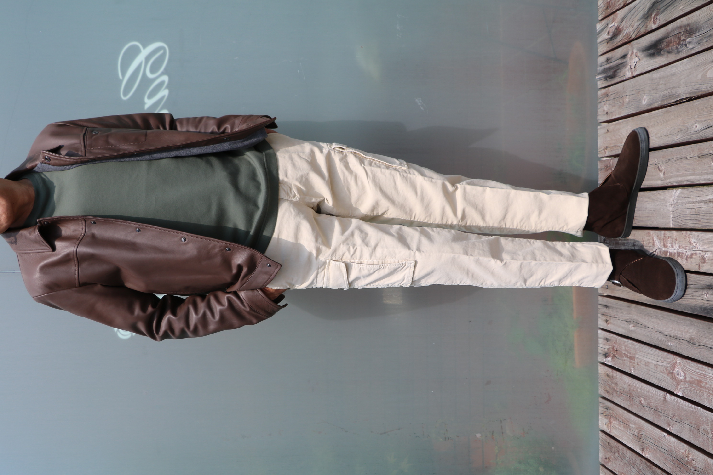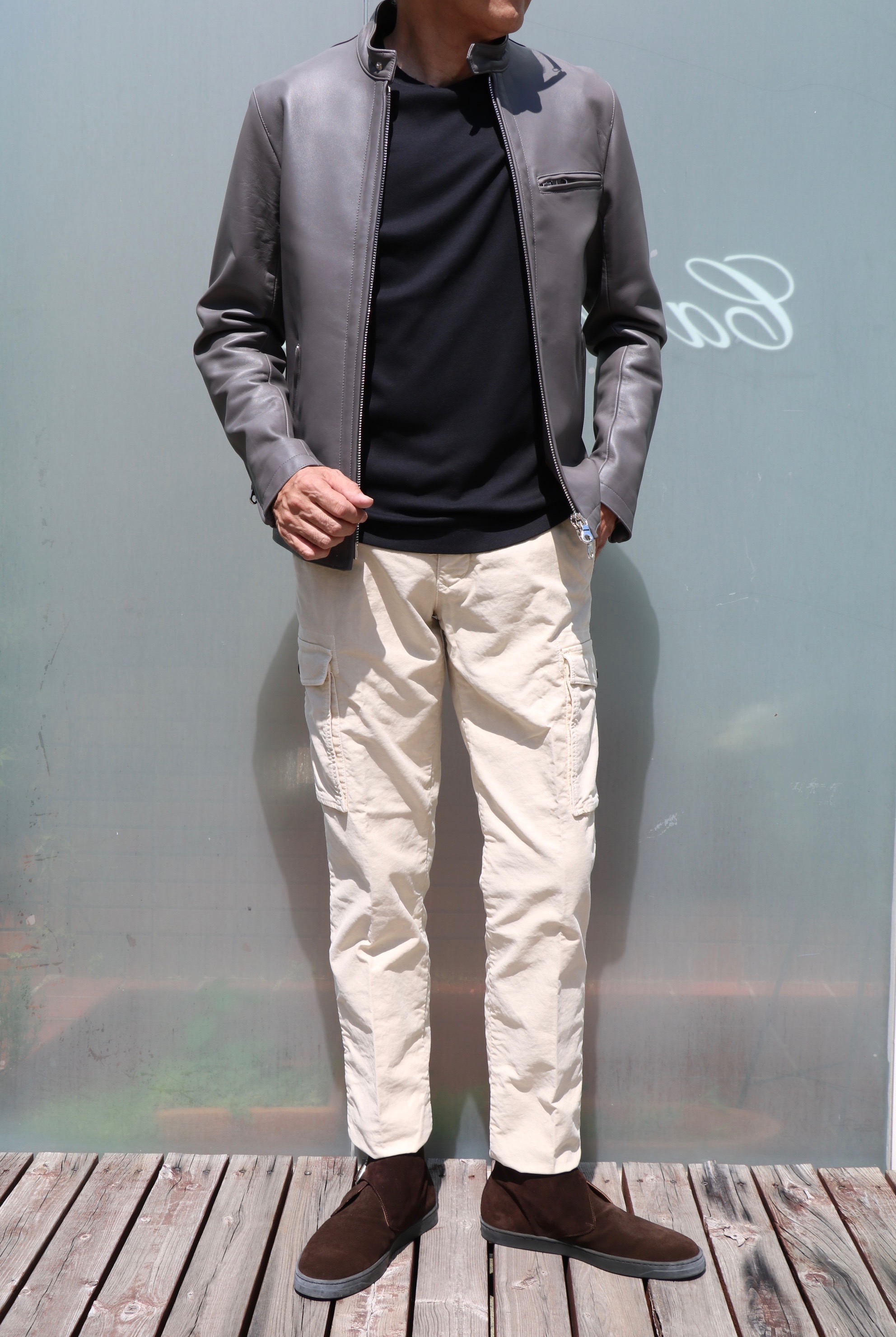 オリーブで合わせたレザージャケットは、昨日のブログでも登場したRUFFO(ルッフォ)。しなやかな質感とまろやかなブラウンとの相性は抜群です。