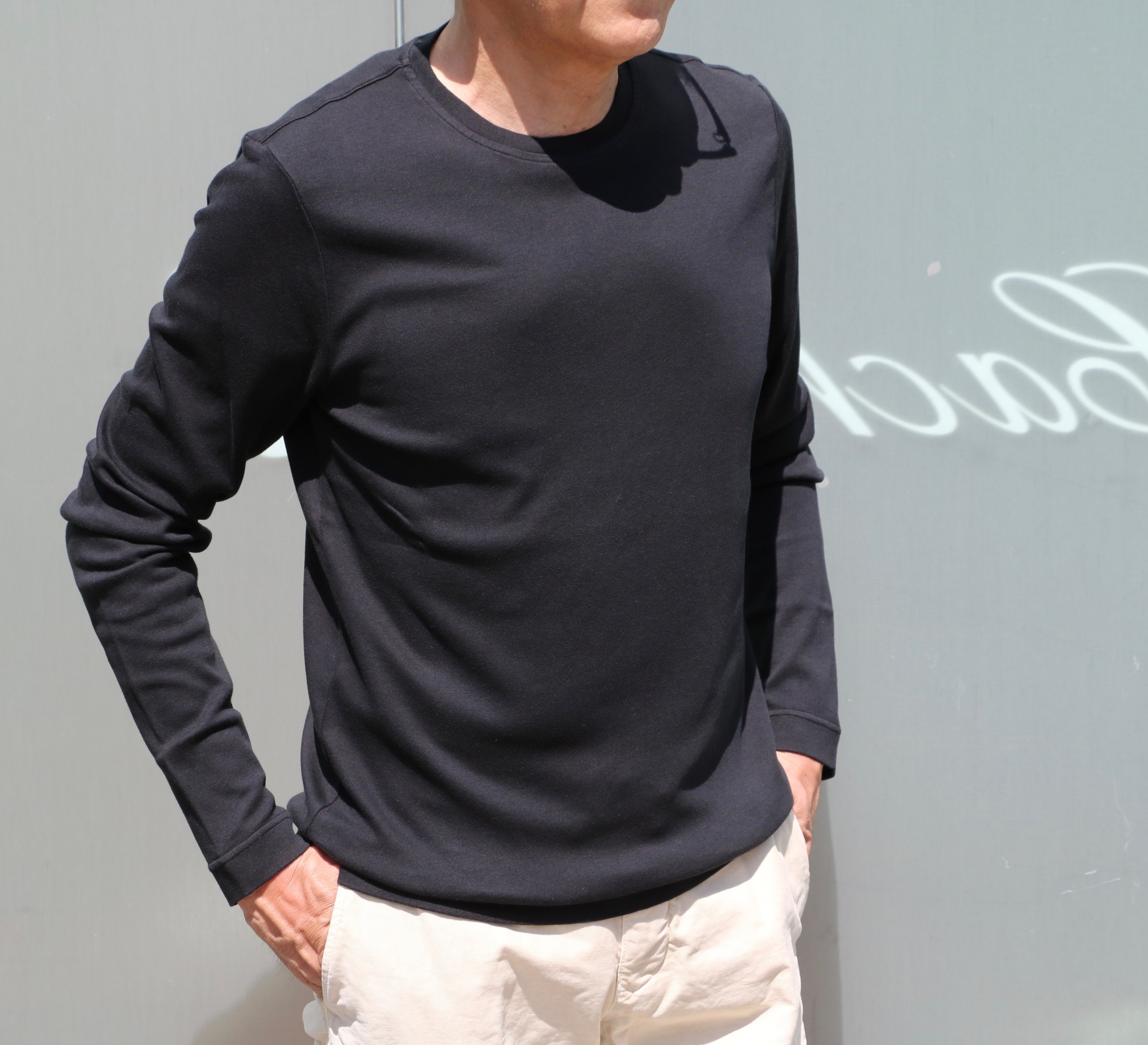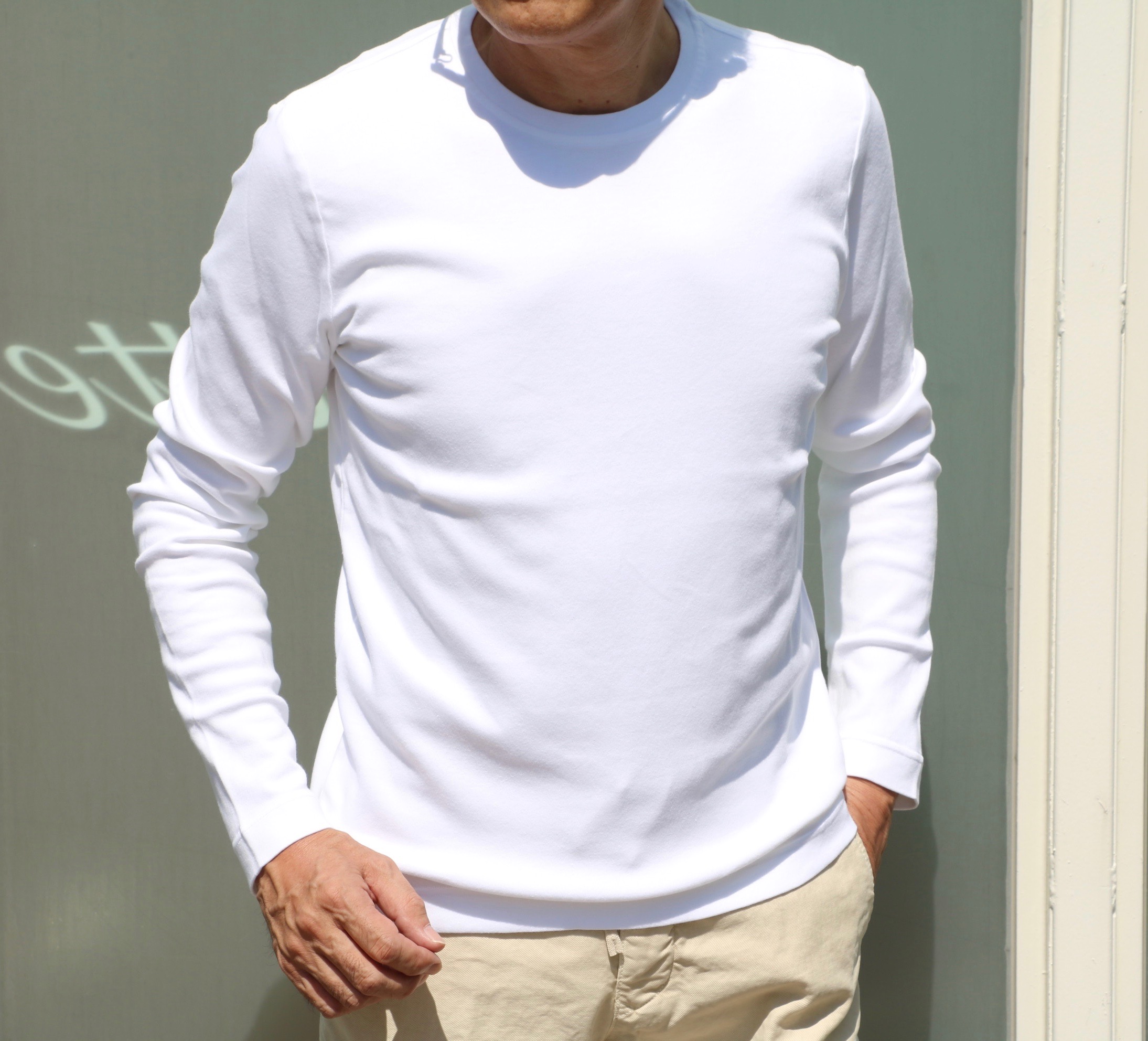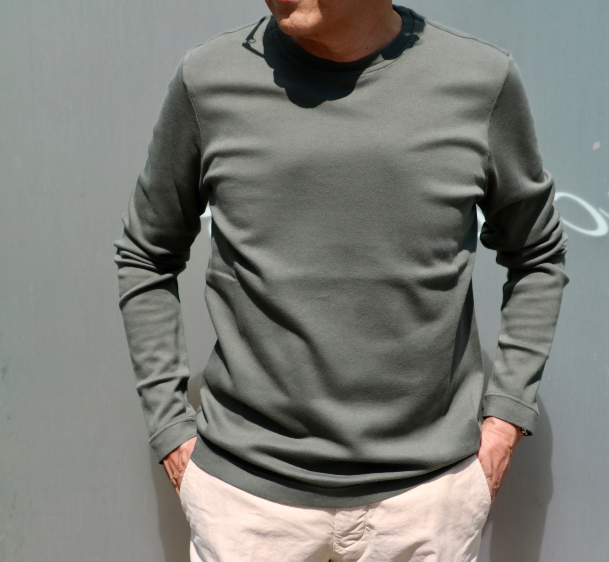 肌着や半袖のTシャツより透け感はなく、一枚で着ても安定感のあるロングスリーブのカットソーになります。上のグラスグリーンに近いオリーブ、このオフホワイト、それにブラックの3色をセレクトしています。