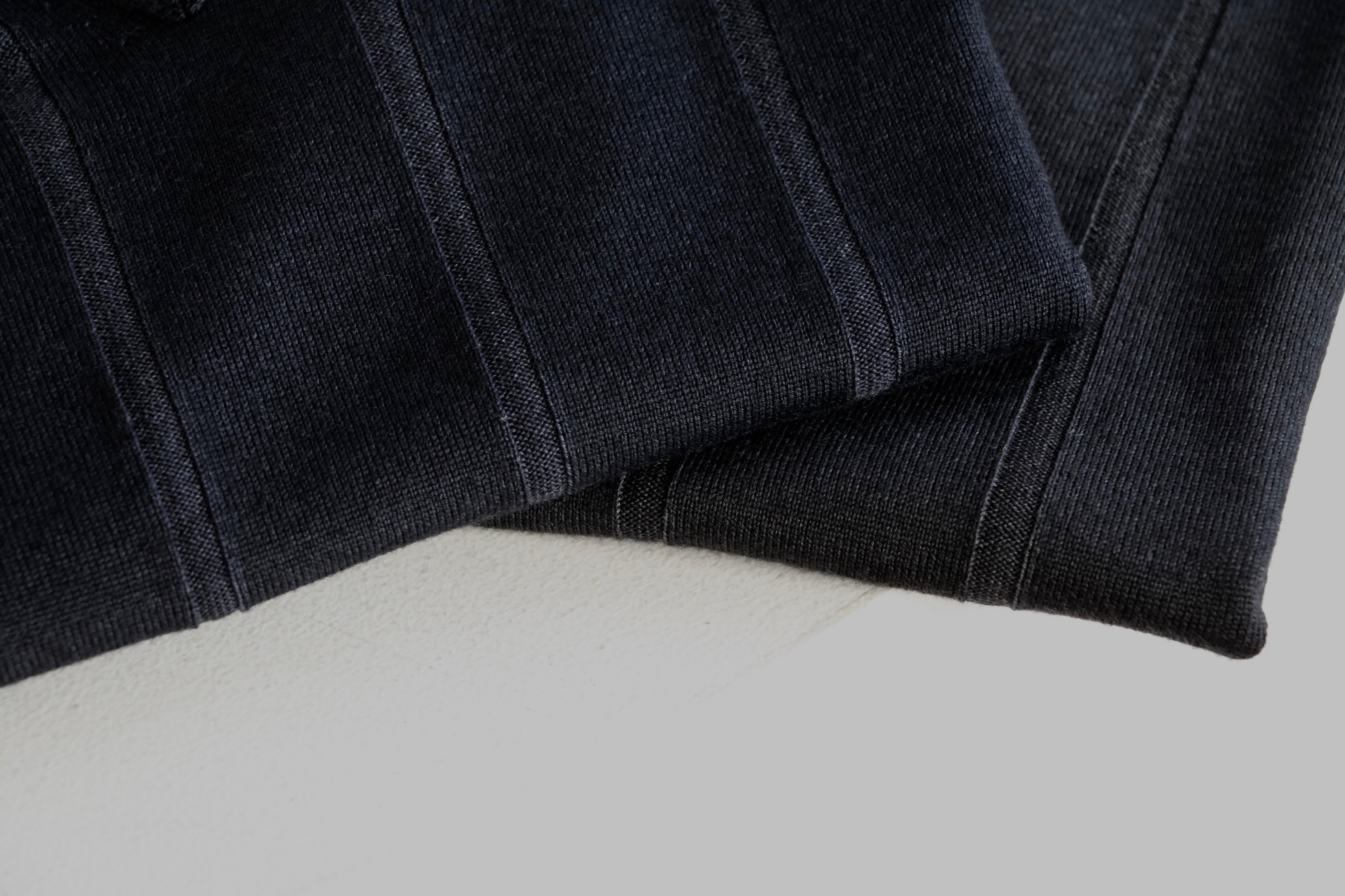 この方がわかりやすいでしょうか。インディゴブルーをよりネイビーに近づけた色合いと、ブラックはダークグレイと呼んだ方がイメージしやすいかもしれません。ハイゲージとミドルゲージの中間ぐらい、およそ12ゲージほどの重ね着もしやすい厚さです。