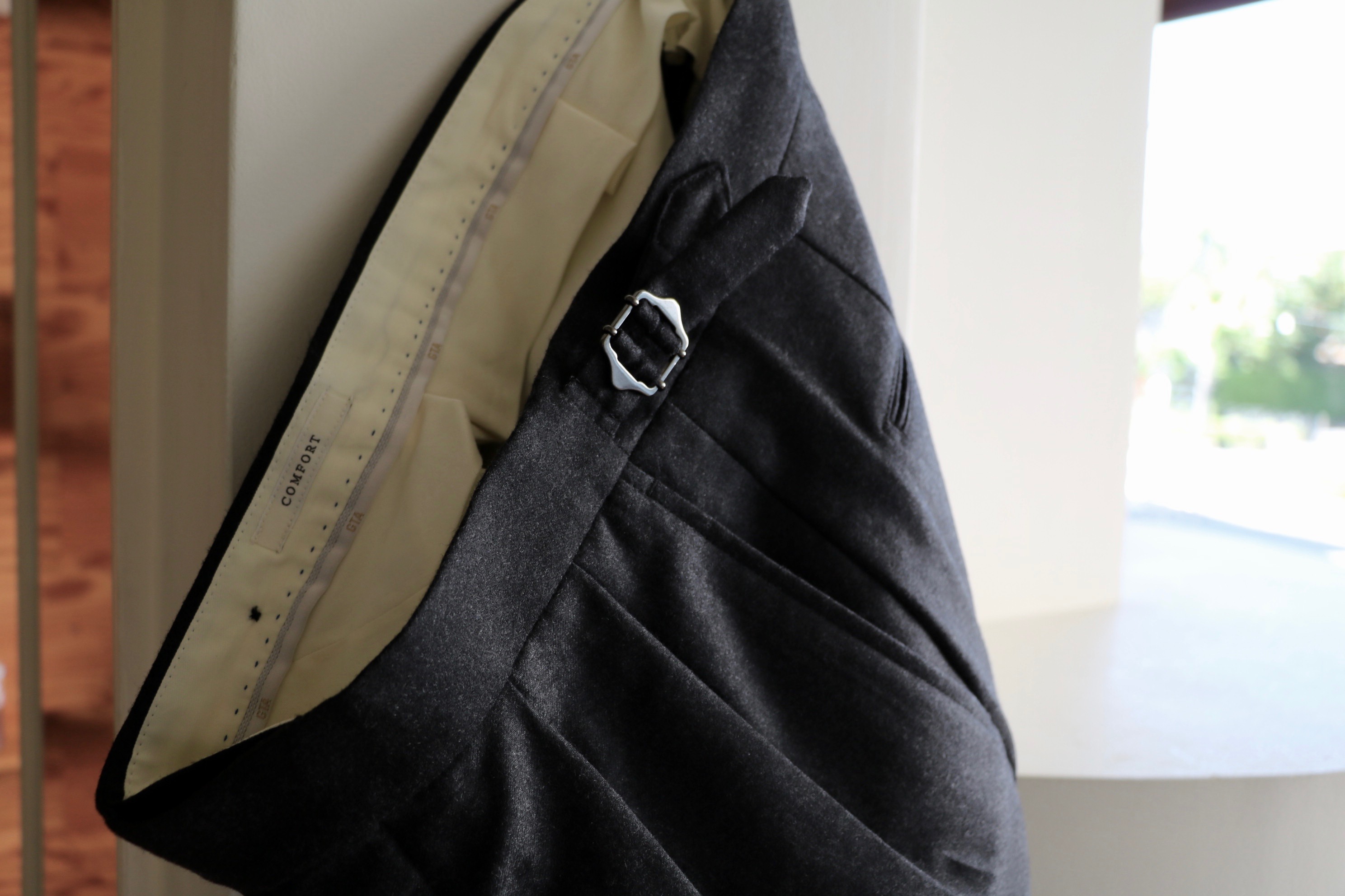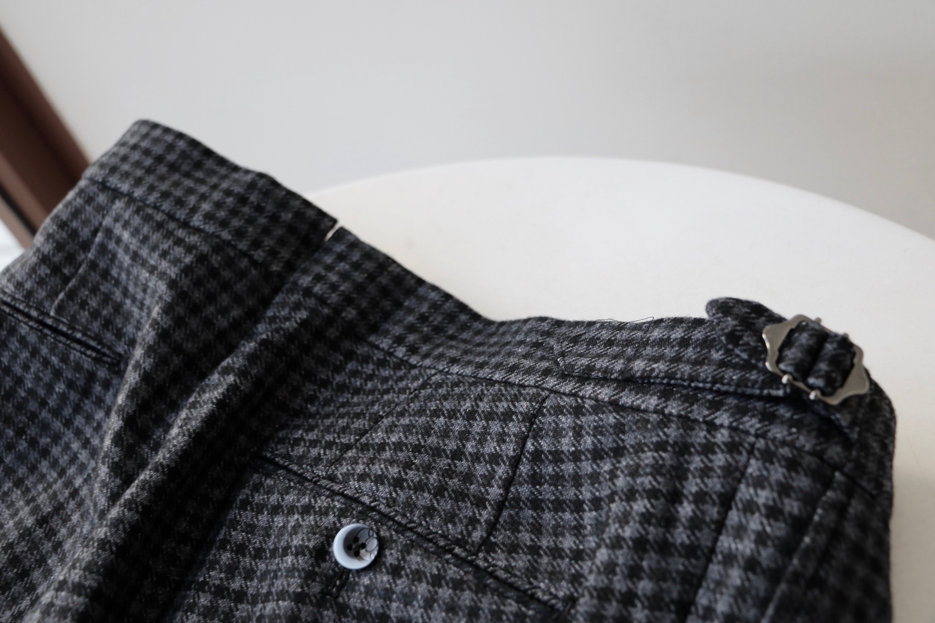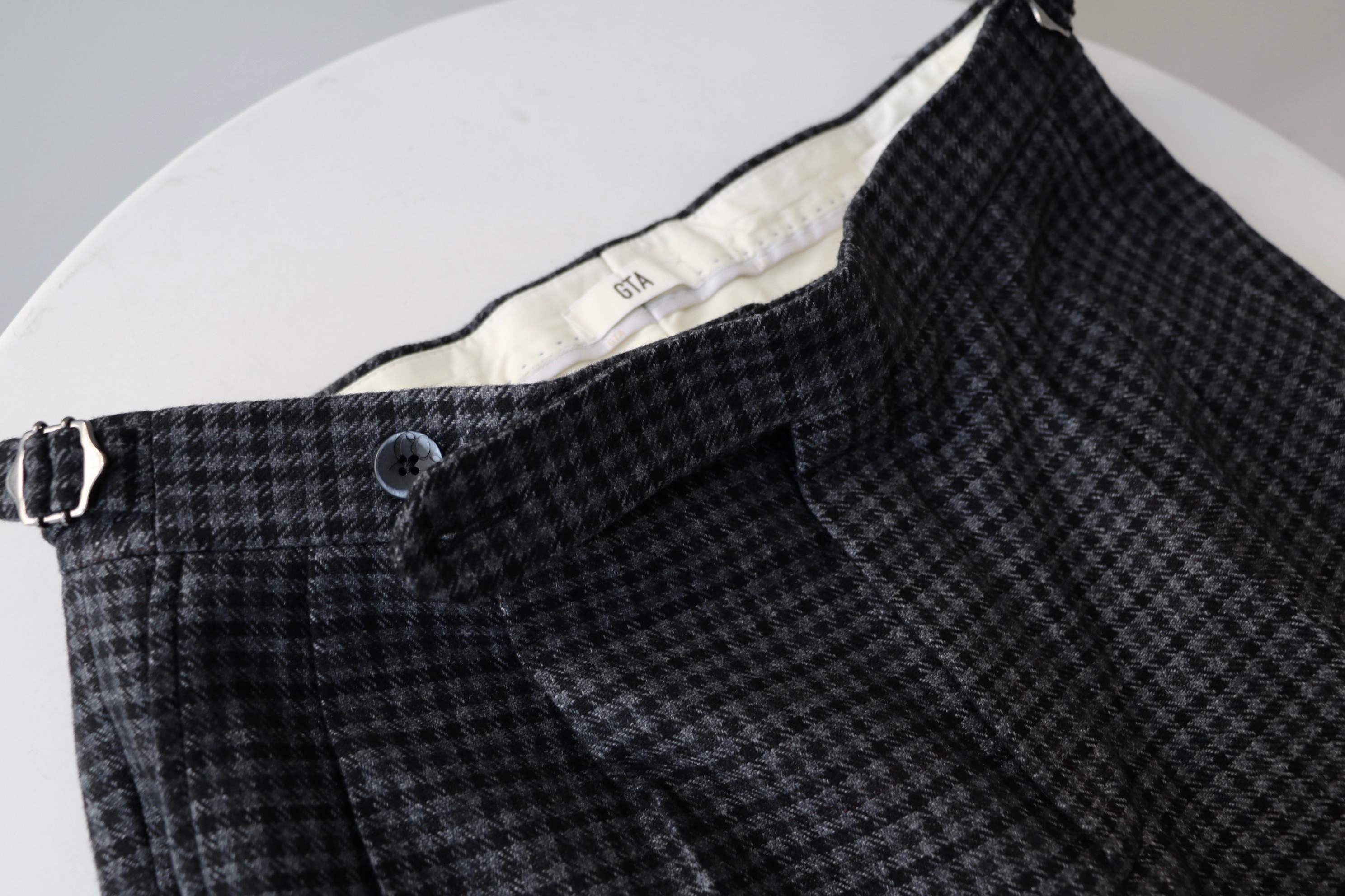 合わせたパンツは、【G.T.A/ジーティーアー】の人気モデル「HERRICK」。アウトのツープリーツ、サイドアジャスター付きのクラシック&スポーティーなモデルです。一見、ダークグレイとブラックのチェック柄かと思いきや、