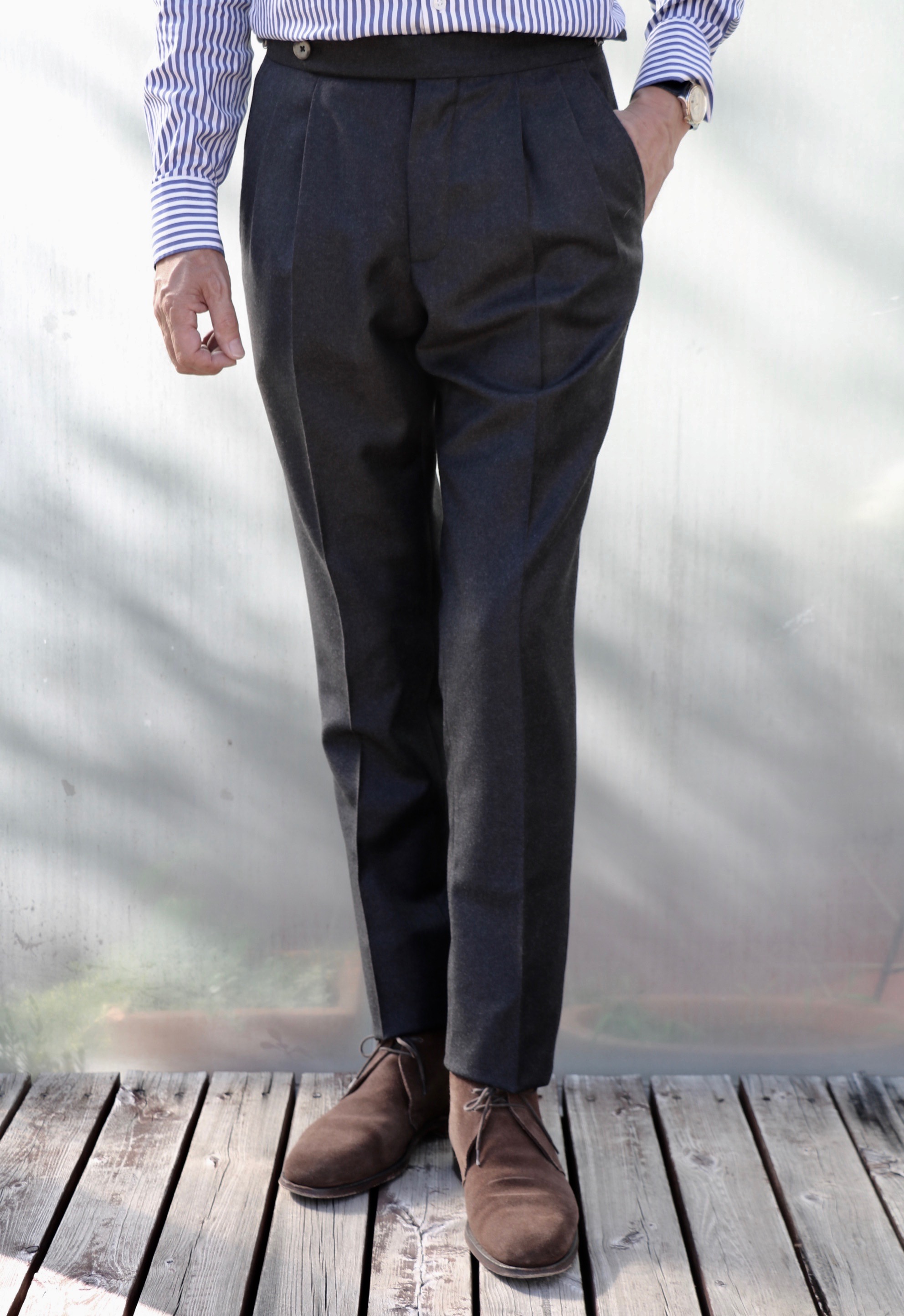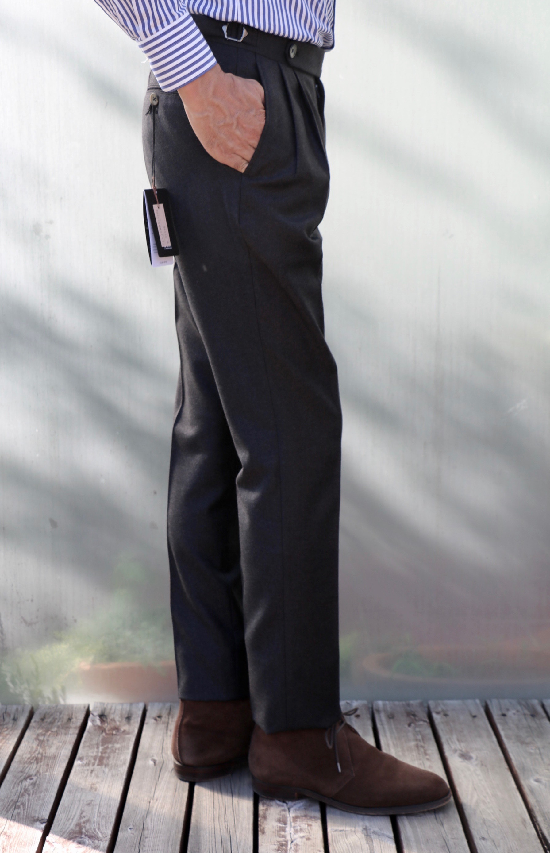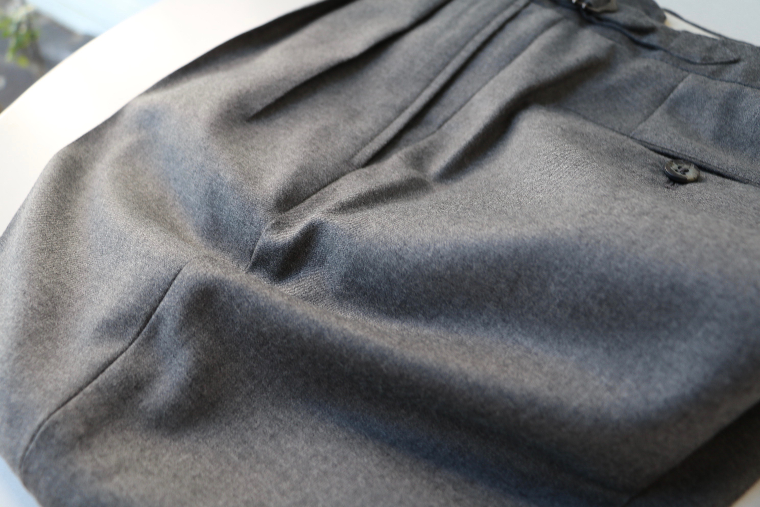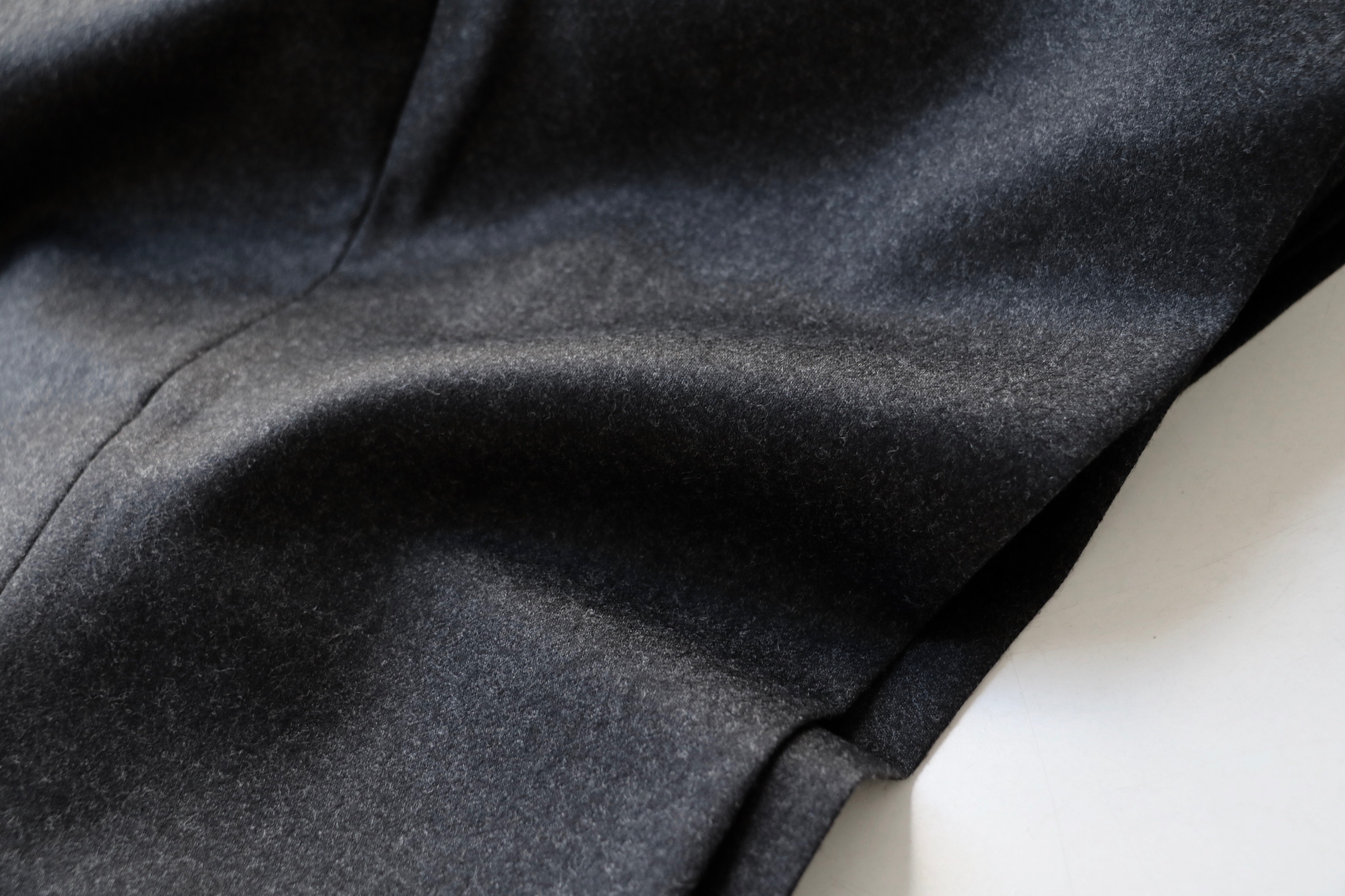 下のチャコールは、もう少し暗くなります。毛糸のサキソニーウールは、紡毛糸のフランネルほど生地の厚みはなく、毛羽も少ないクリアな表情です。比べていただきたいのは、先にご案内のINCOTEX(インコテックス)のサキソニーグレイ無地シャーリングパンツ。同じサキソニー ですが、【G.T.A/ジーティーアー】のチャコールより明るくなります。ちょうど、上の写真に近くなります。参考までに、Borelio/ボレリオの「グレイフランネル地ドローコード付きイージーパンツ」は、フランネルと書きましたが、実は同じ紡毛糸でも「Leichtfried/ライヒットフリード」のローデンクロスを使っており、フランネルより生地にややハリコシが出ます。詳しくは、こちらのブログをご覧ください。