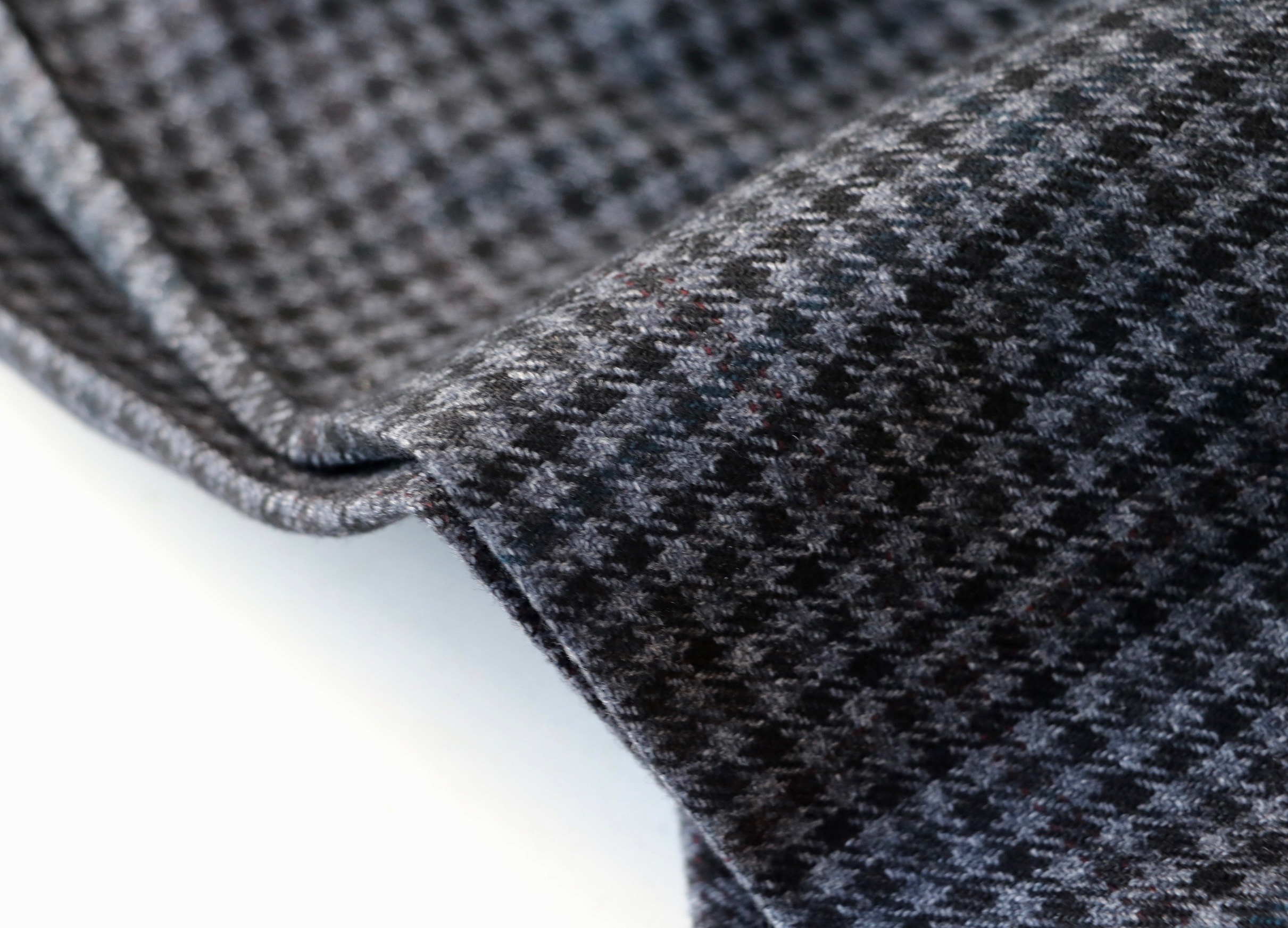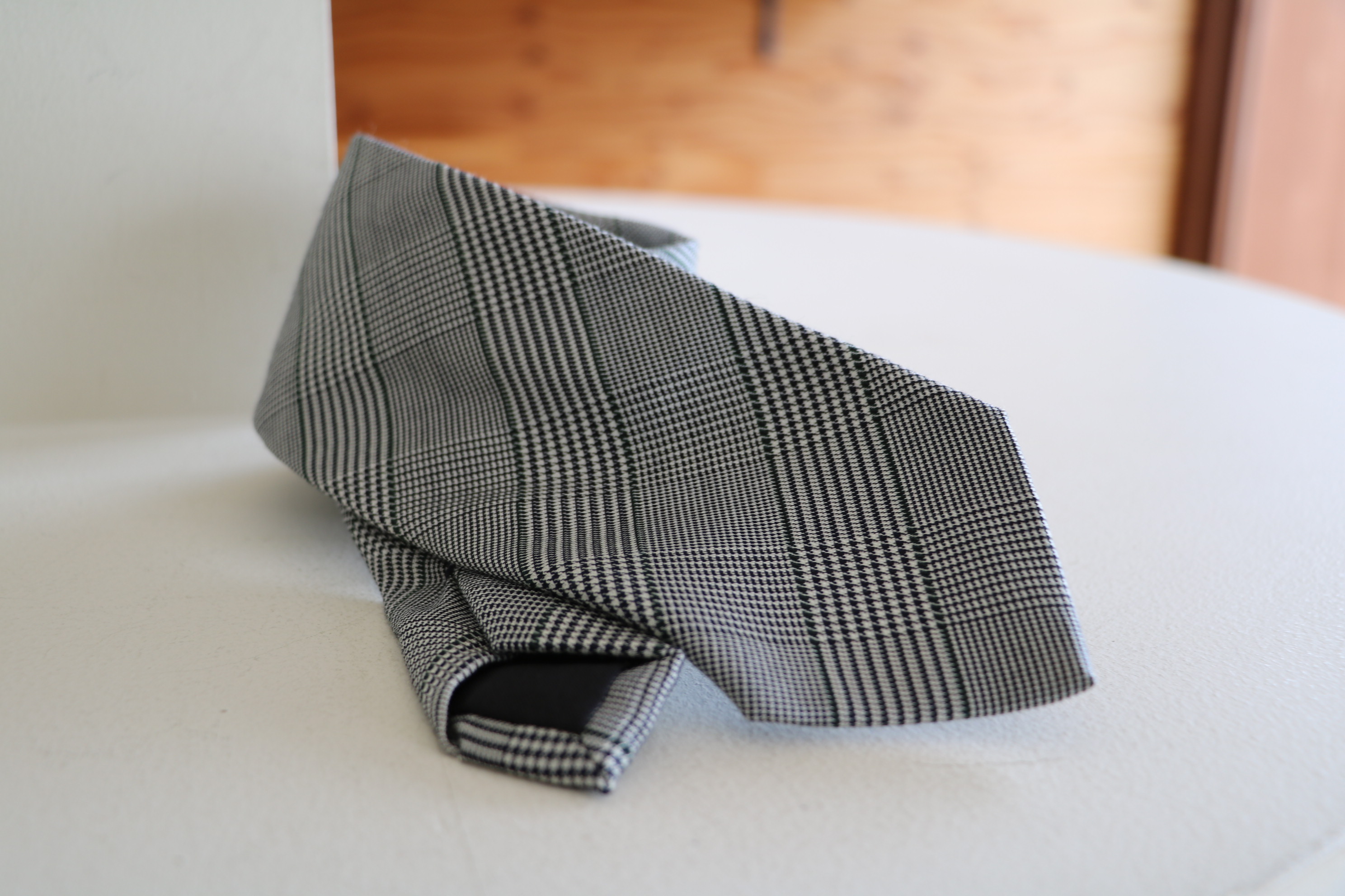 シルク・ウールのグレンチェック柄。よく見れば、グリーンが配されています。生地サンプルには、同じ色柄をベースに青や赤、ピンクやイエローが用意されていましたが、落ち着く色はやはりグリーン。白黒のコントラストのきついグレンチェックではなく、温かみのある生成りとの相性は抜群です。