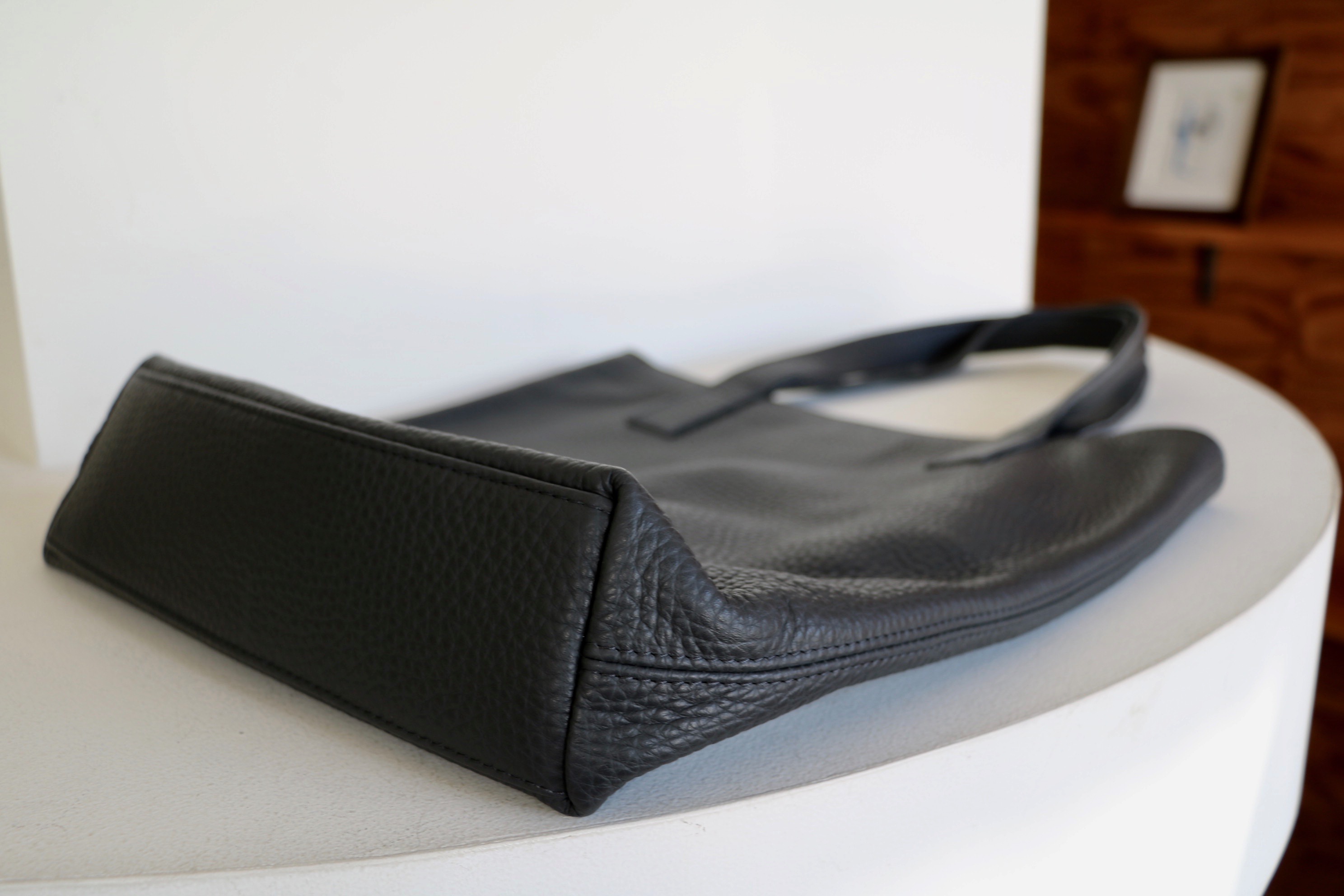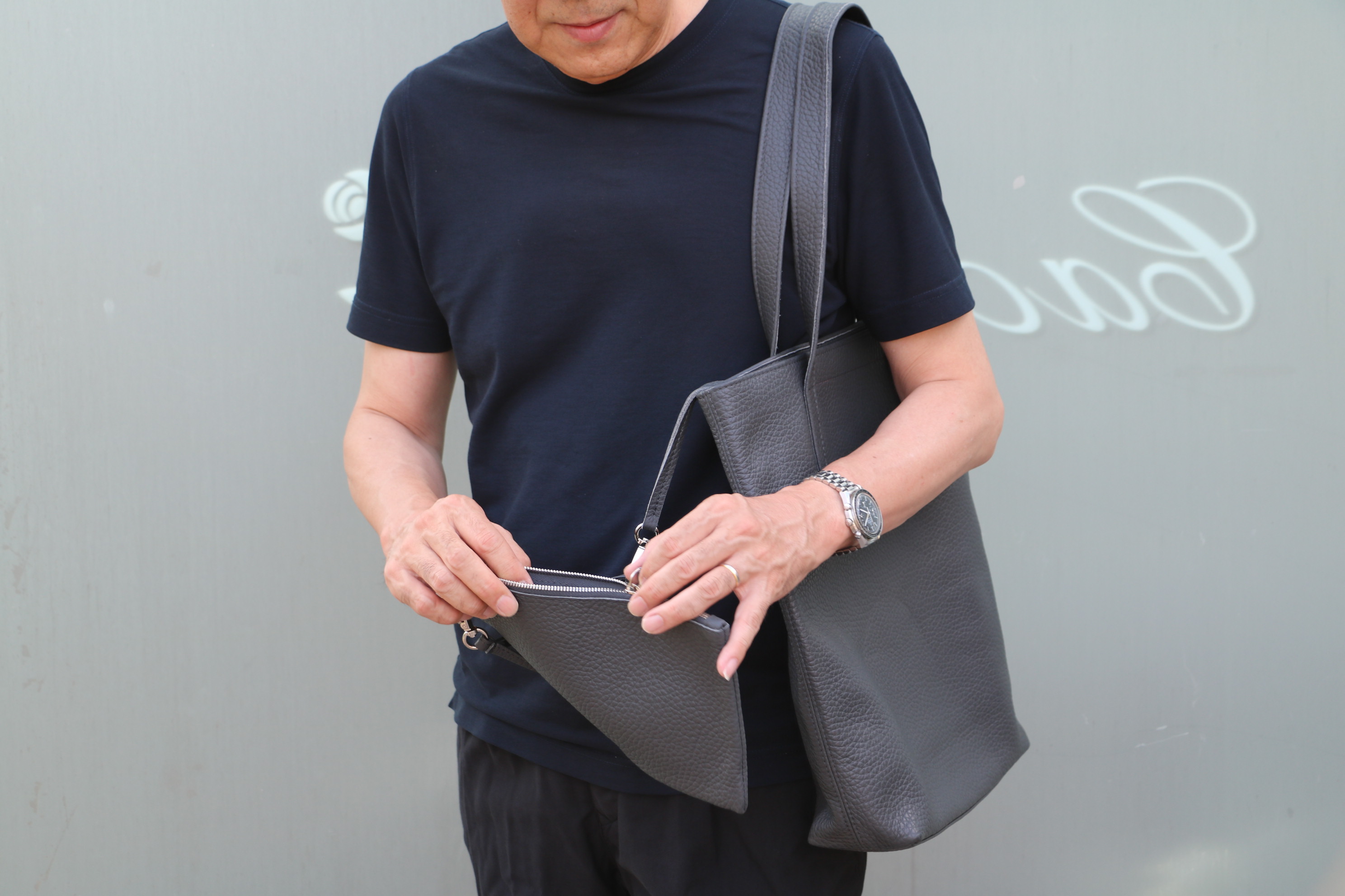 多分、周囲も認めるバッグ好きです。自宅には様々な大きさのものが、その時の用途によって出番を待っています。最近でこそ、巣篭もりですが、かつては海外、国内の出張や旅の多い私。出かける目的に応じて、バッグを購入していました。洋服にモノを入れるのが好きではないというのも要因かもしれません。ただ最近は、もうこれ以上、バッグは要らないからと見ないように、いや気に入るバッグがなかったと言った方が正しいでしょう。そんな時に出会ってしまったのが、このトートバッグ。普段持つのにちょうど良い大きさです。